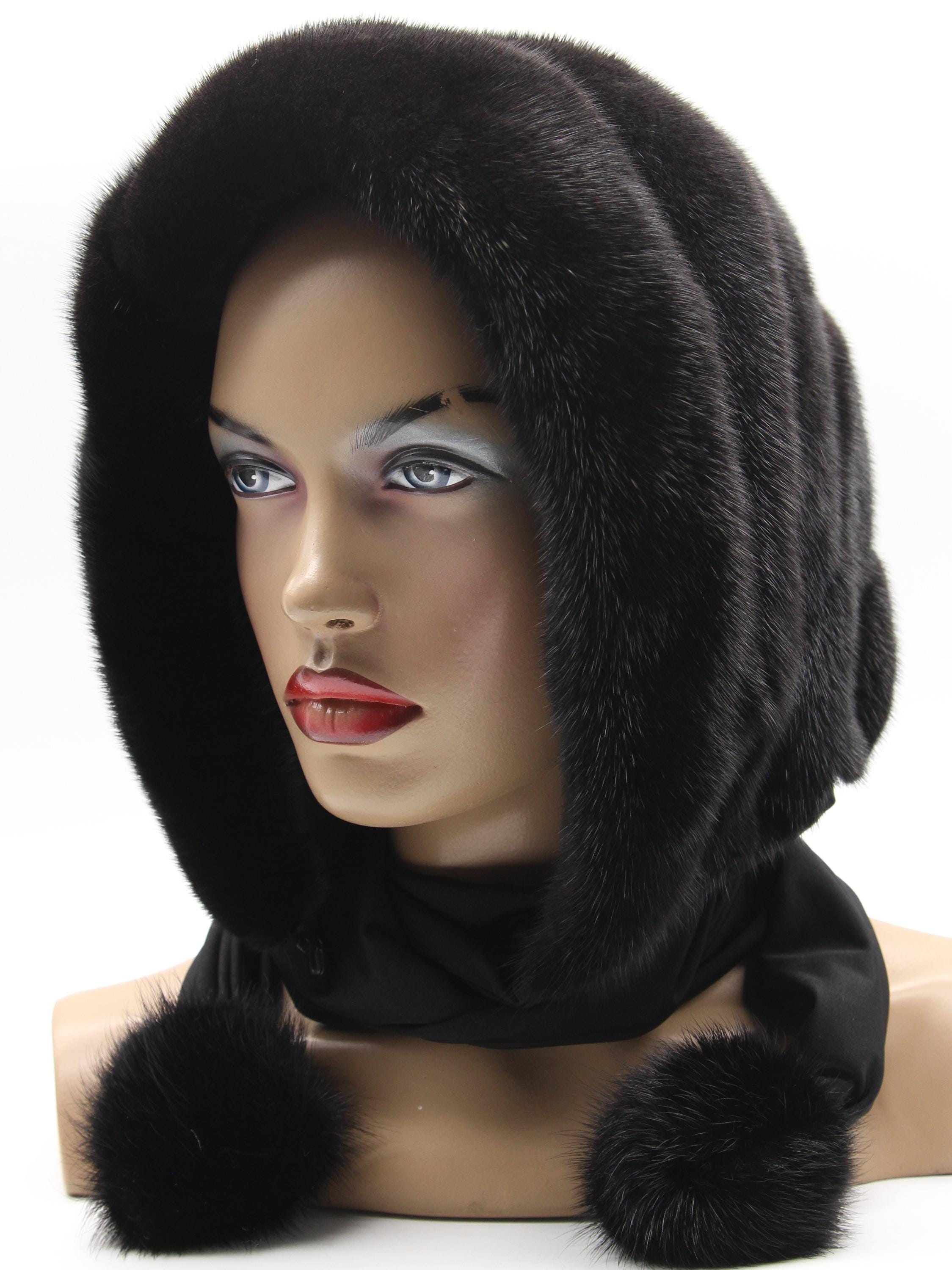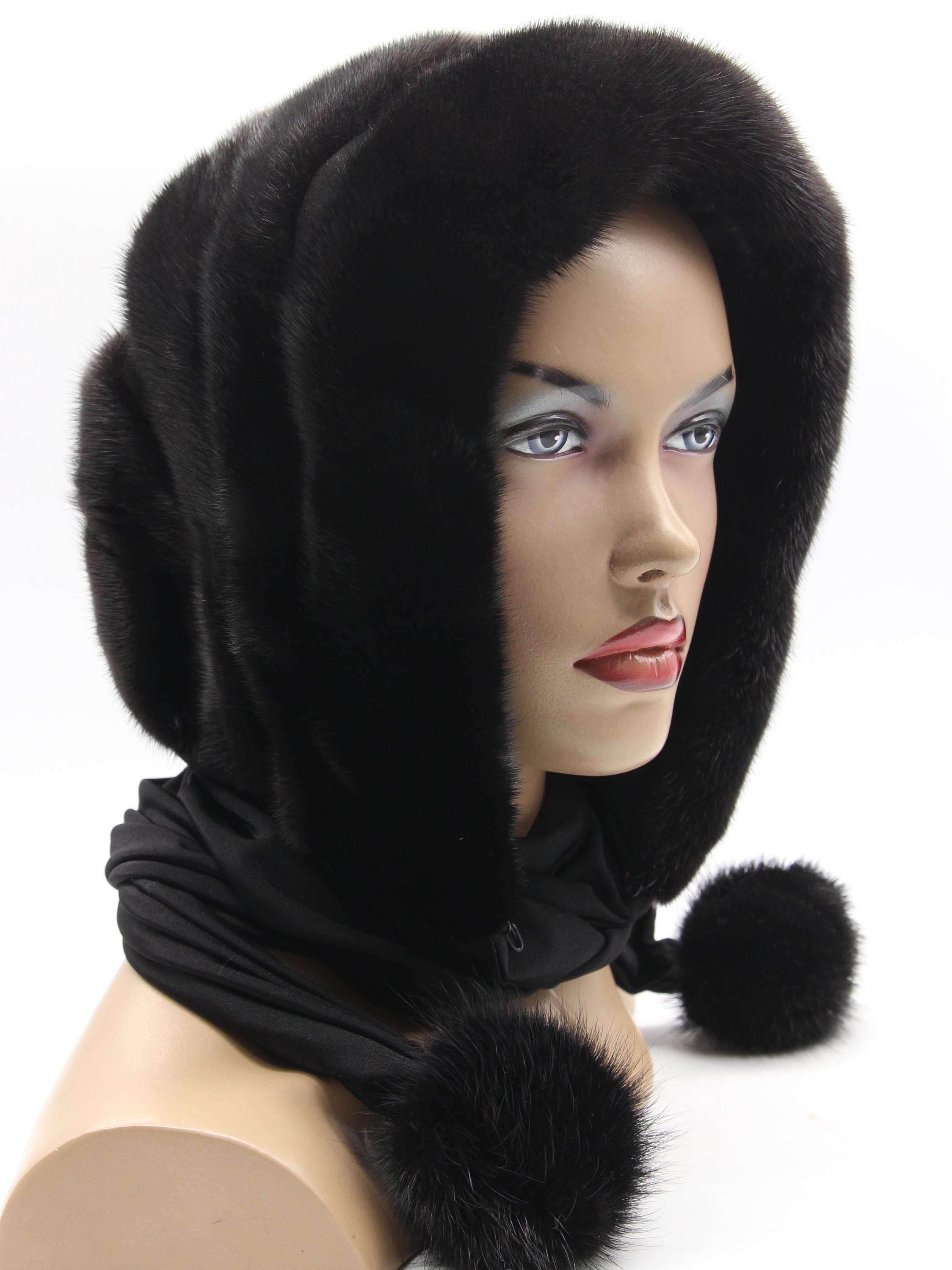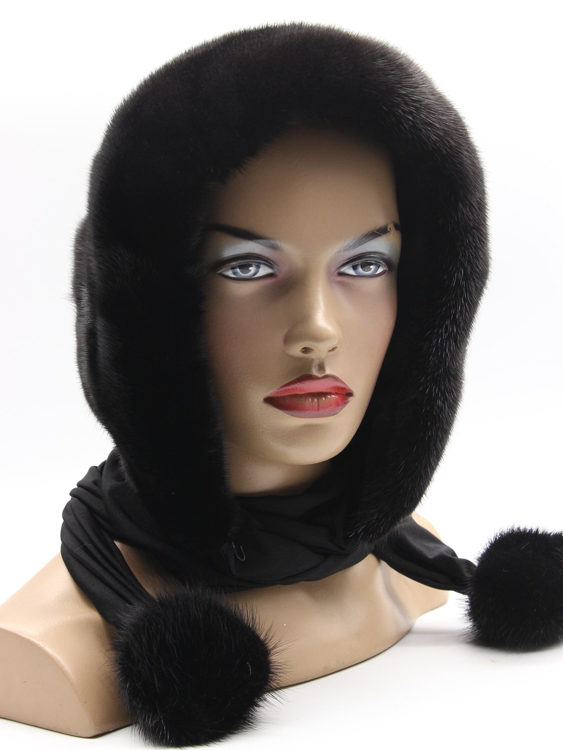 Natural Black Mink Fur Hooded Scarf for Women - Handmade Winter Hood Wrap