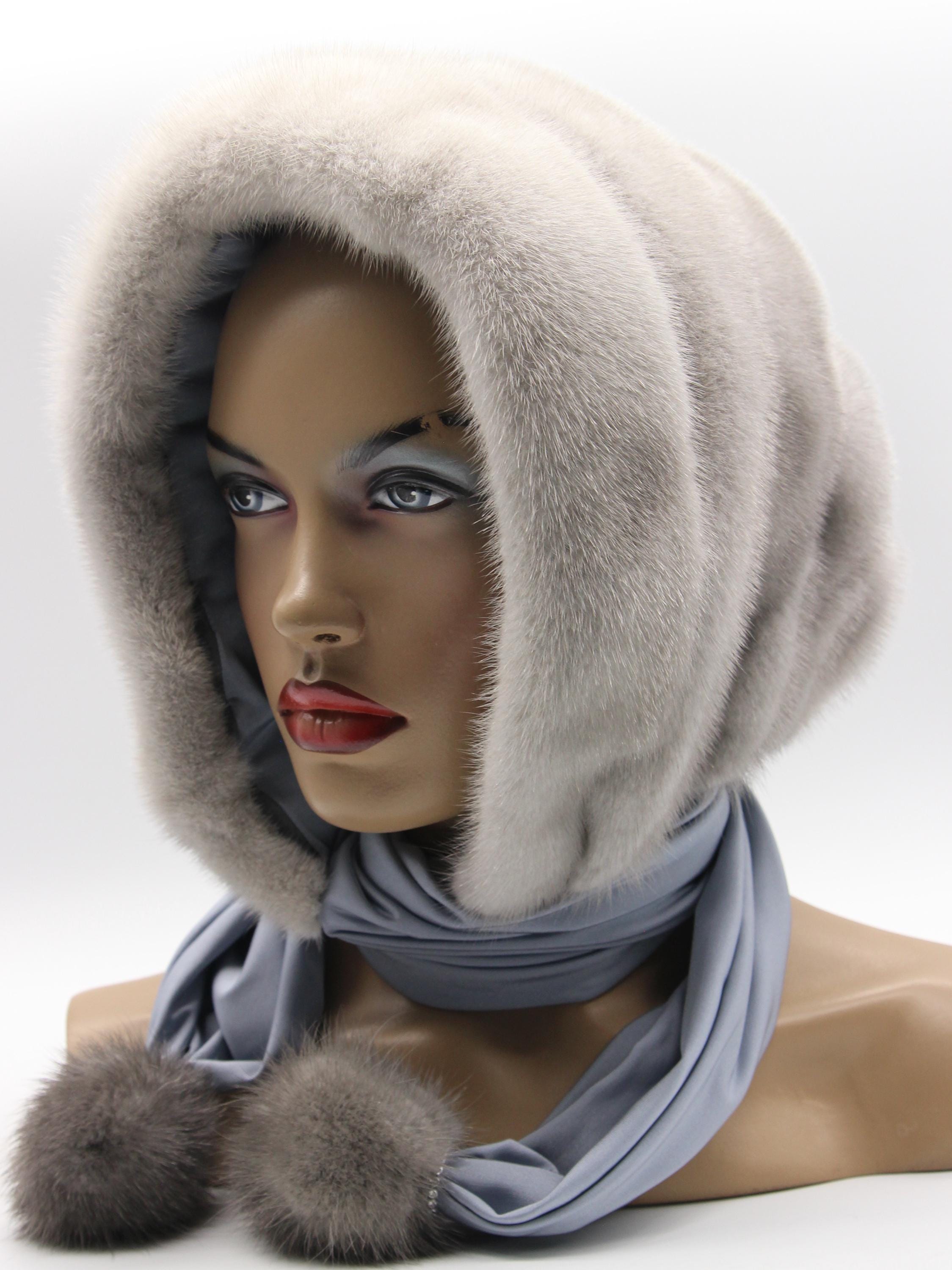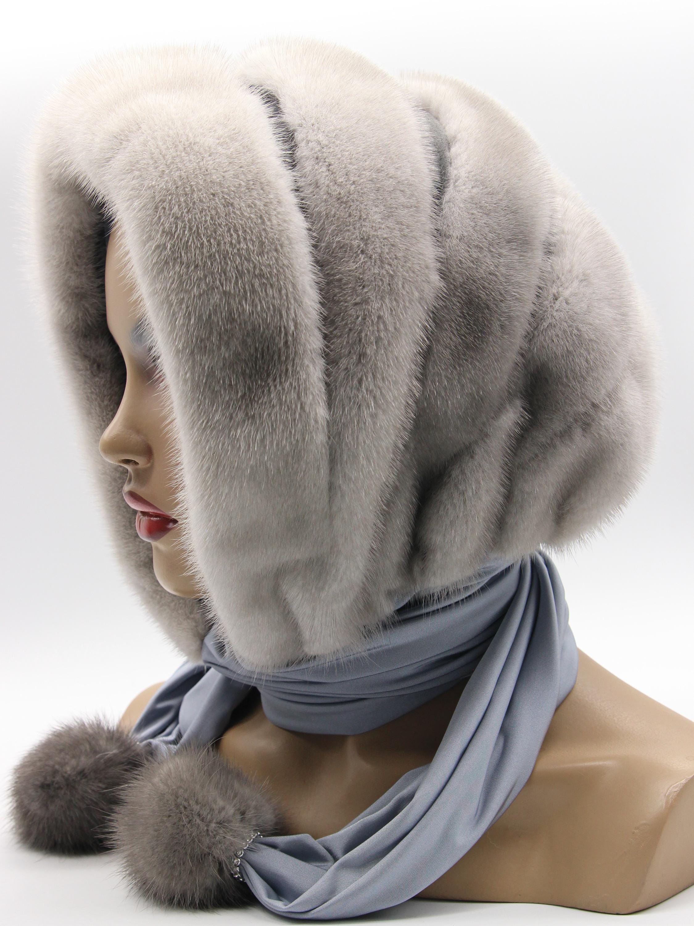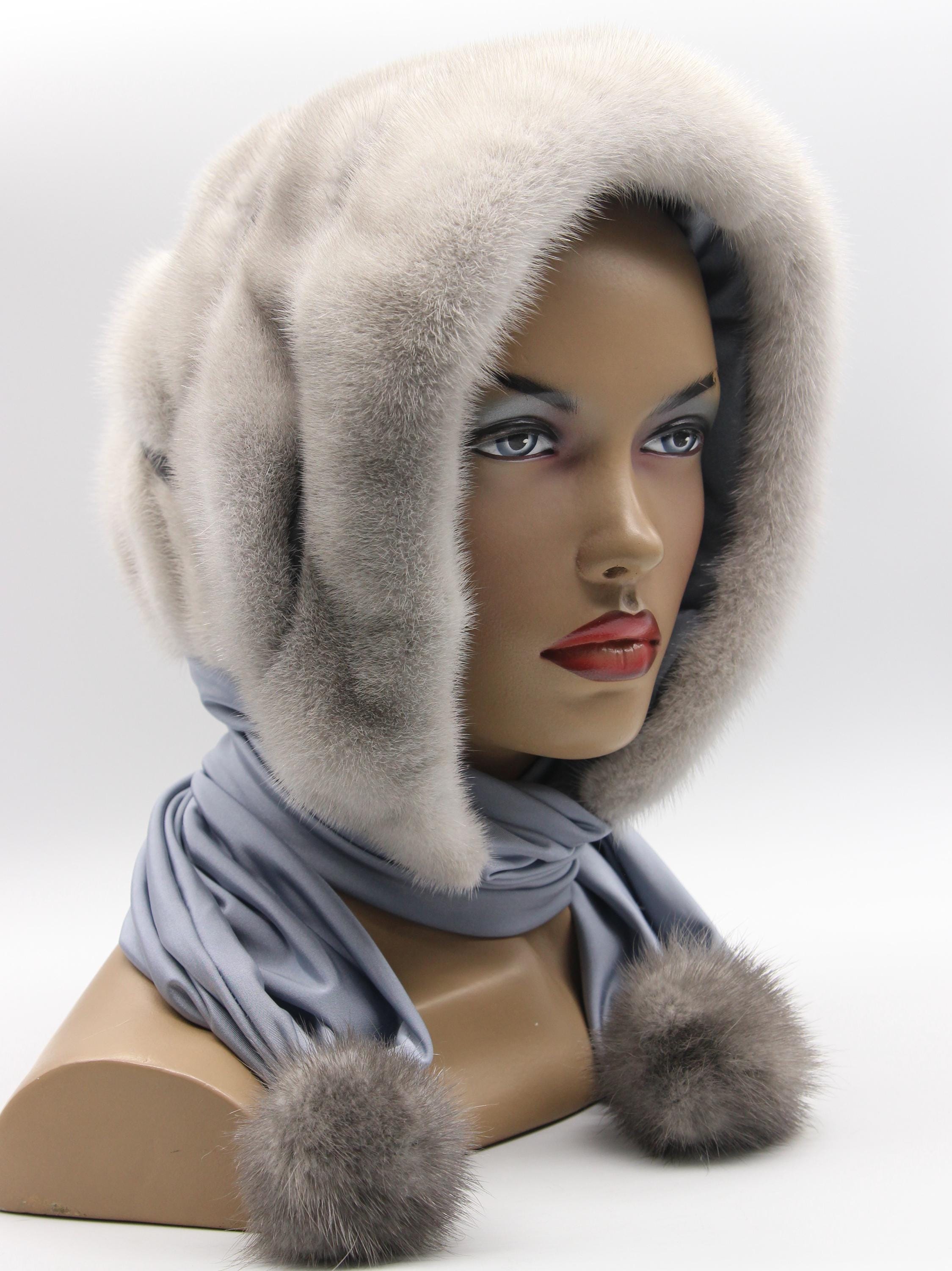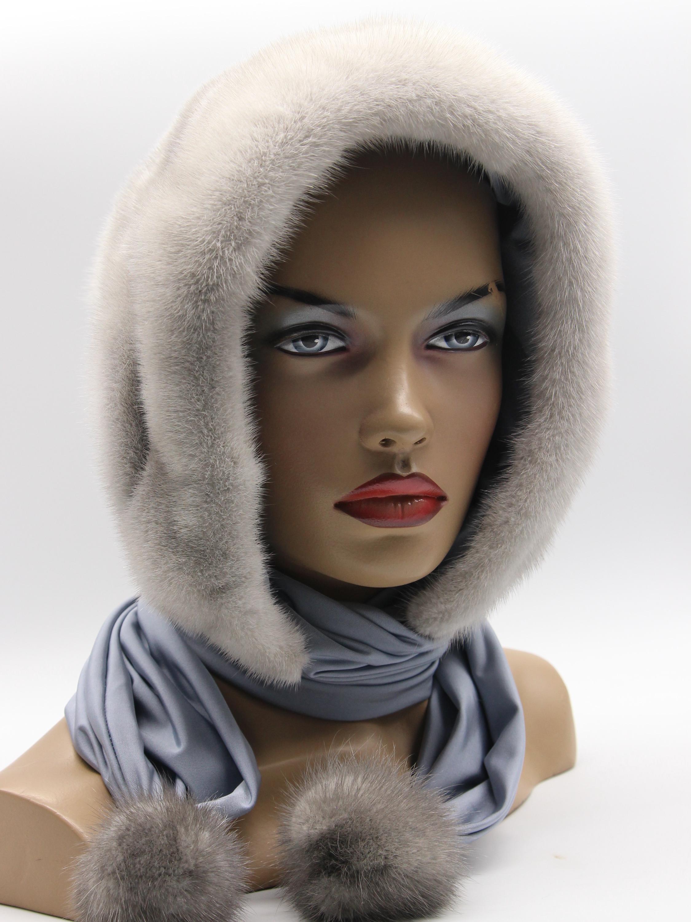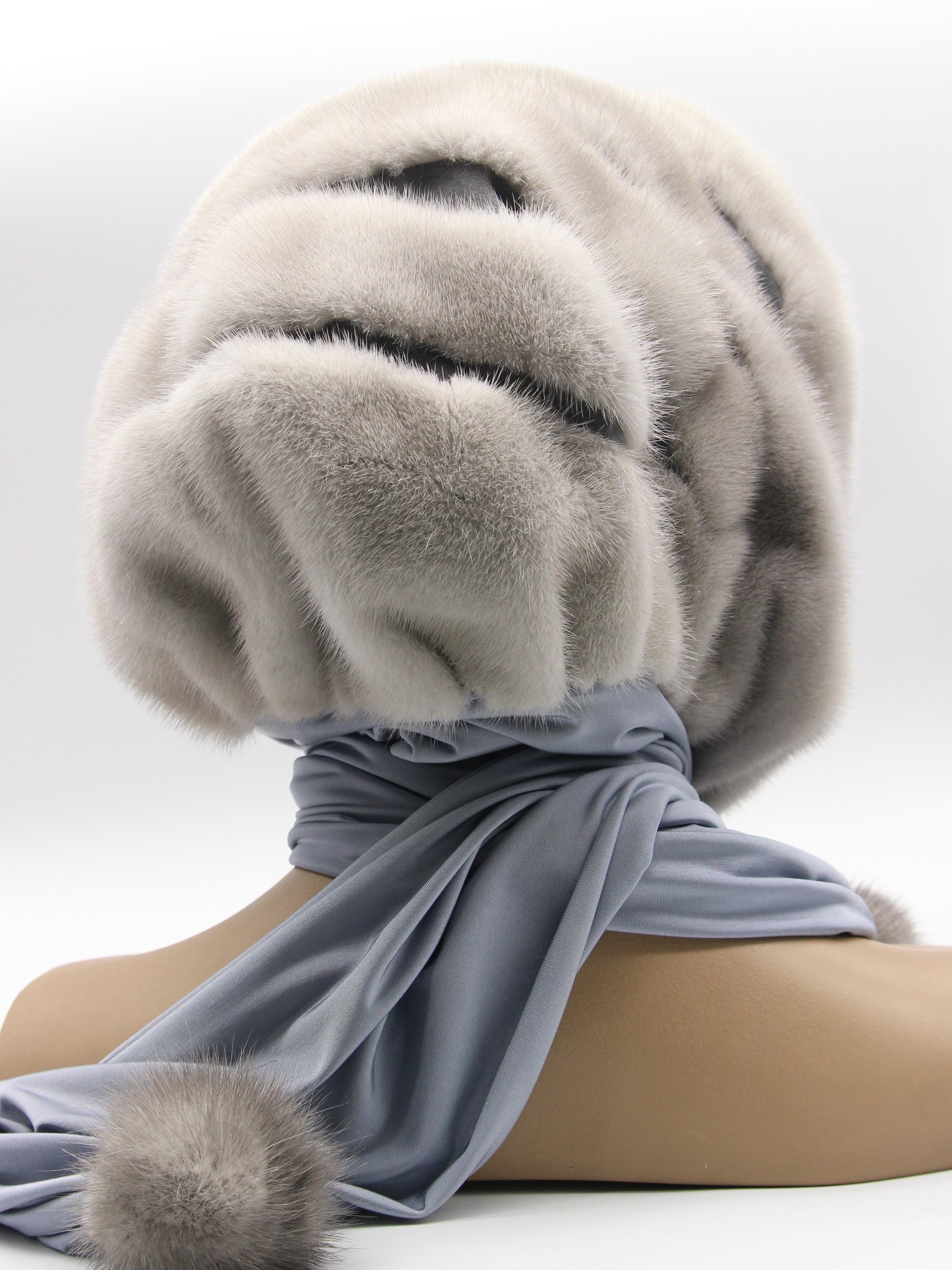 Women's winter hat meets hooded scarf in this natural sapphire mink fur design with striped fabric accents. Real blue grey mink fur hood wraps your head while striped fabric scarf portion covers neck and shoulders. One piece construction eliminates gaps between hat and scarf. Cold weather accessory handmade with striped fabric ties and soft lining. Sapphire mink fur head warmer for harsh winter conditions in Milwaukee, Edmonton, and similar climates.