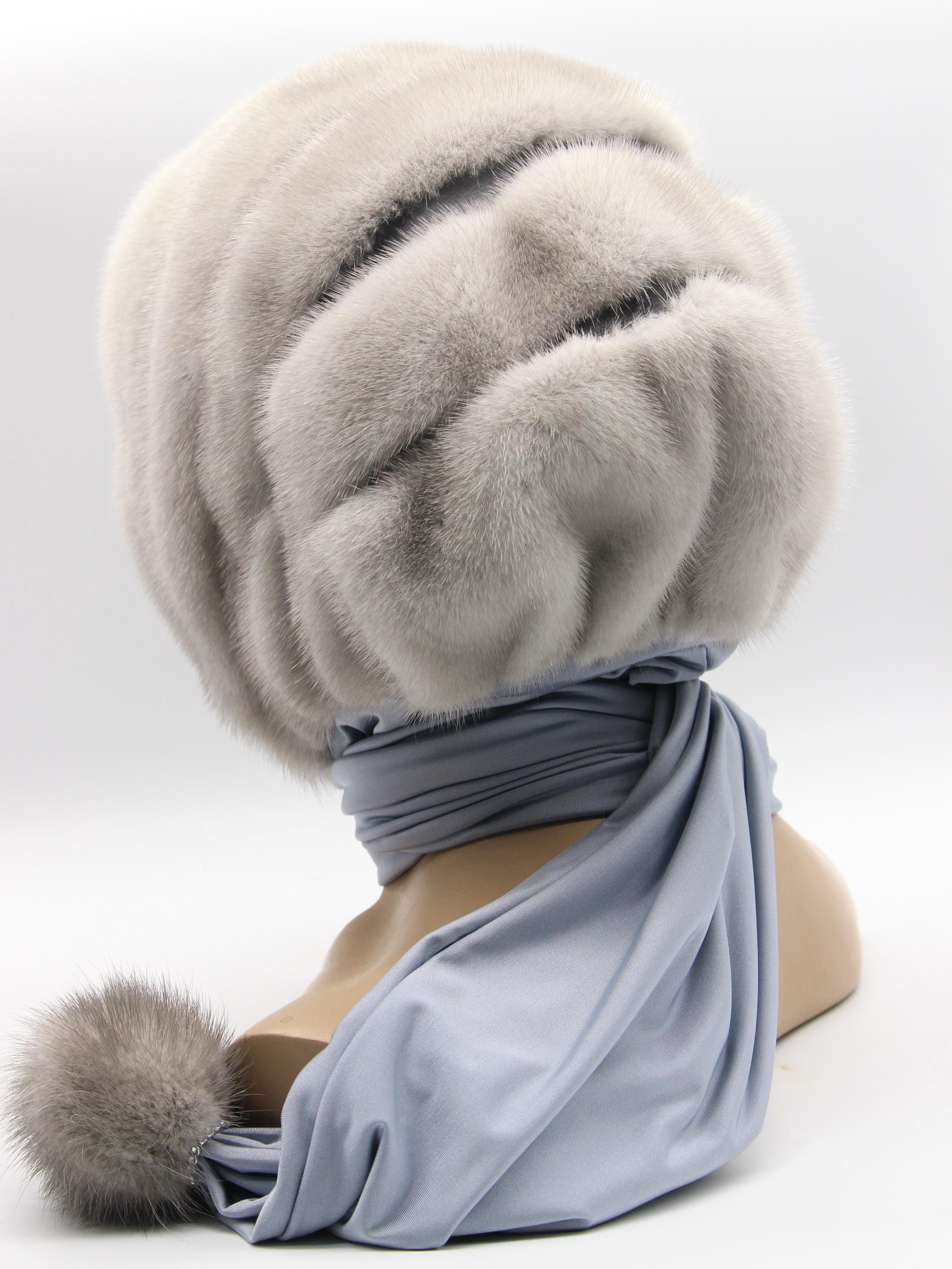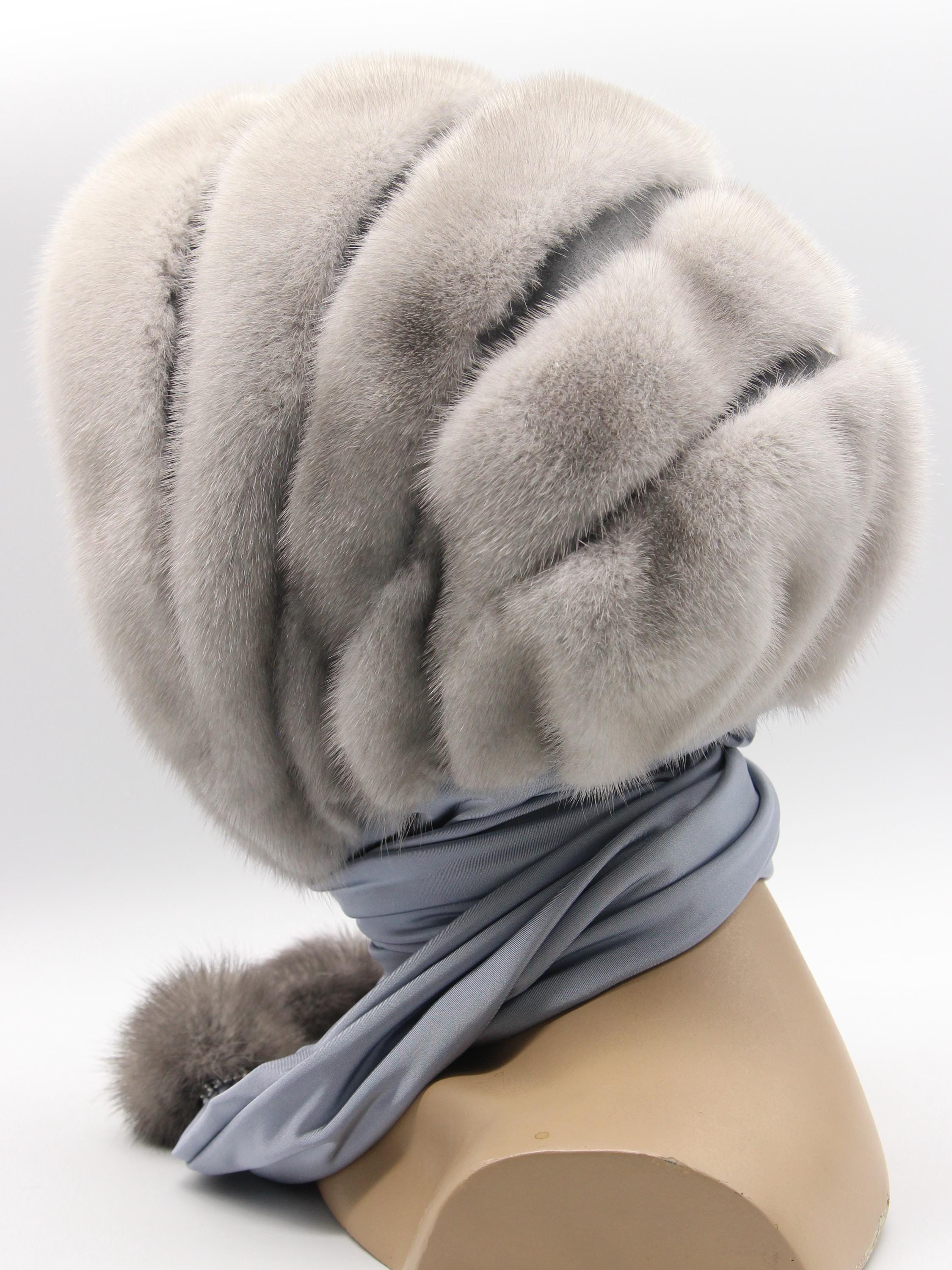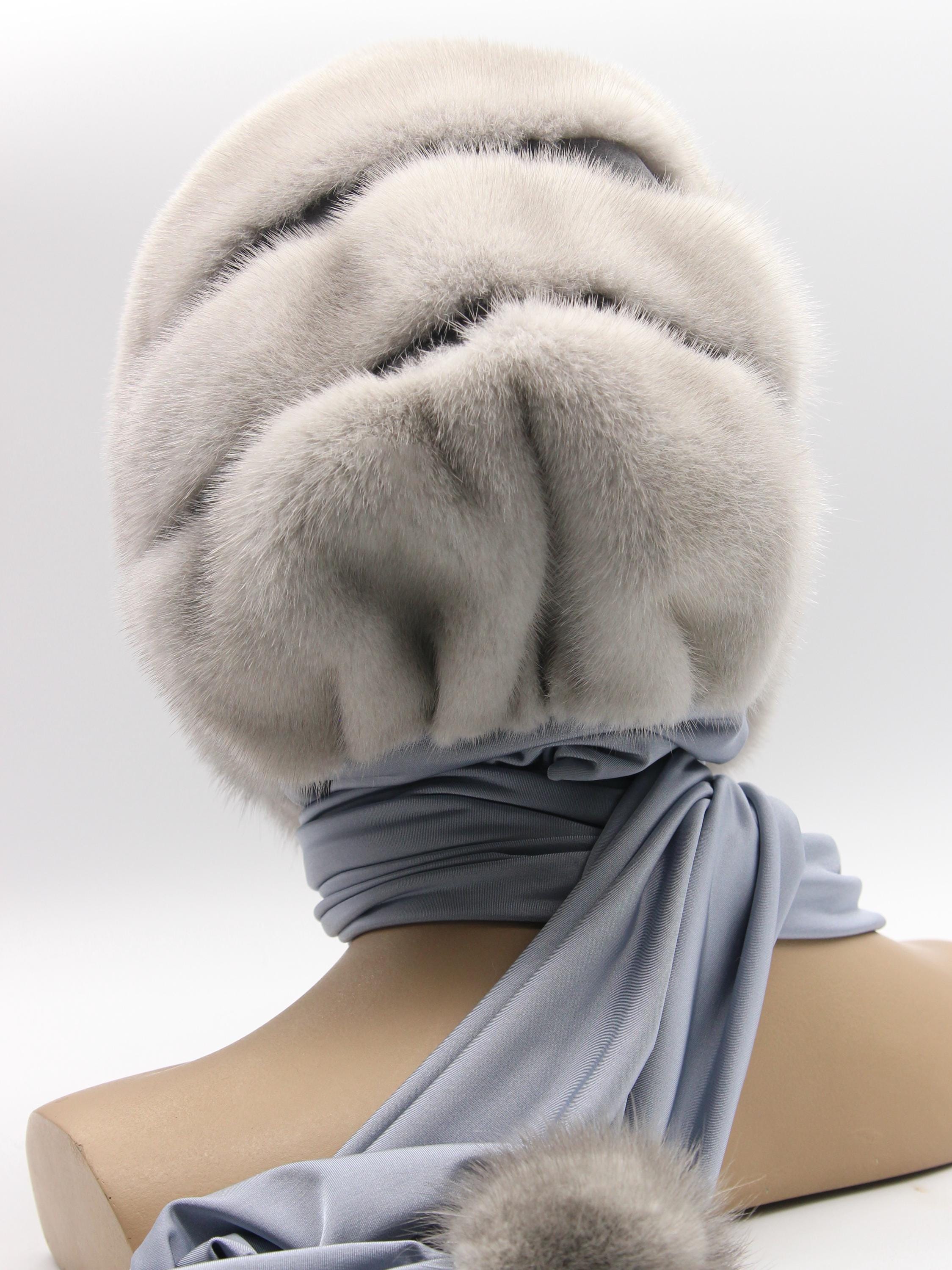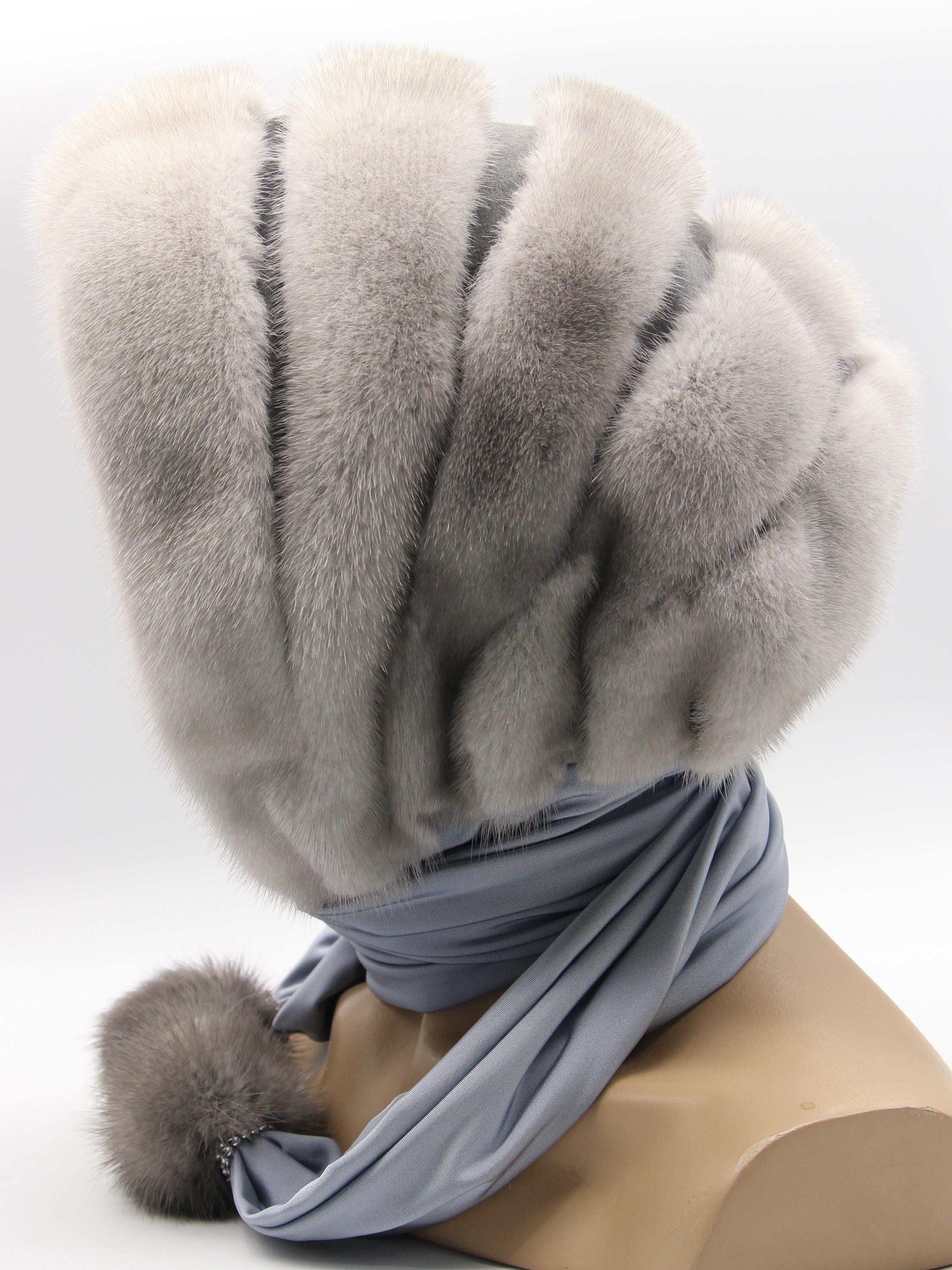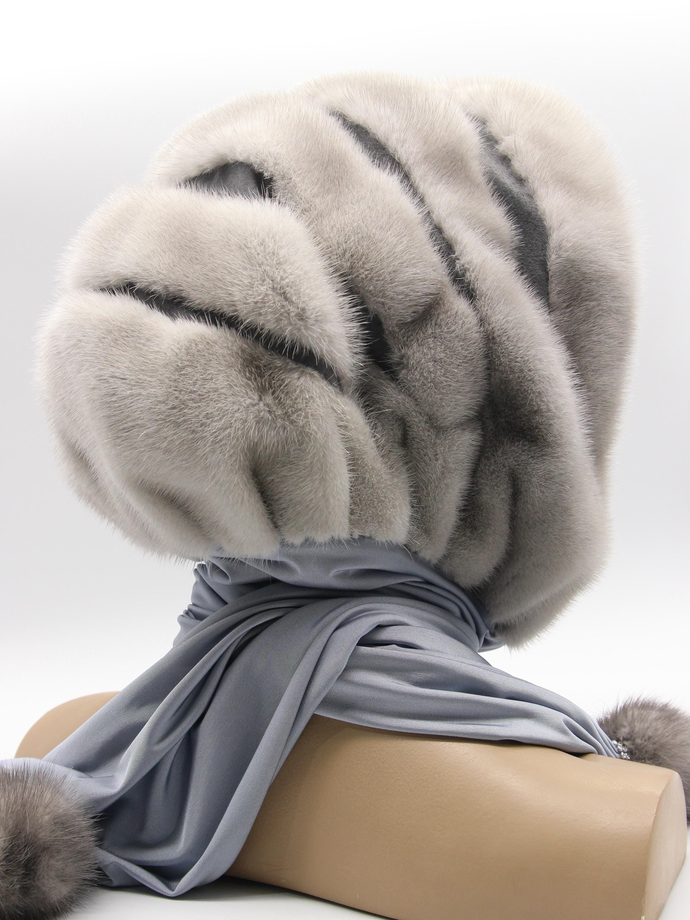 Women's winter hat meets hooded scarf in this natural sapphire mink fur design with striped fabric accents. Real blue grey mink fur hood wraps your head while striped fabric scarf portion covers neck and shoulders. One piece construction eliminates gaps between hat and scarf. Cold weather accessory handmade with striped fabric ties and soft lining. Sapphire mink fur head warmer for harsh winter conditions in Milwaukee, Edmonton, and similar climates.