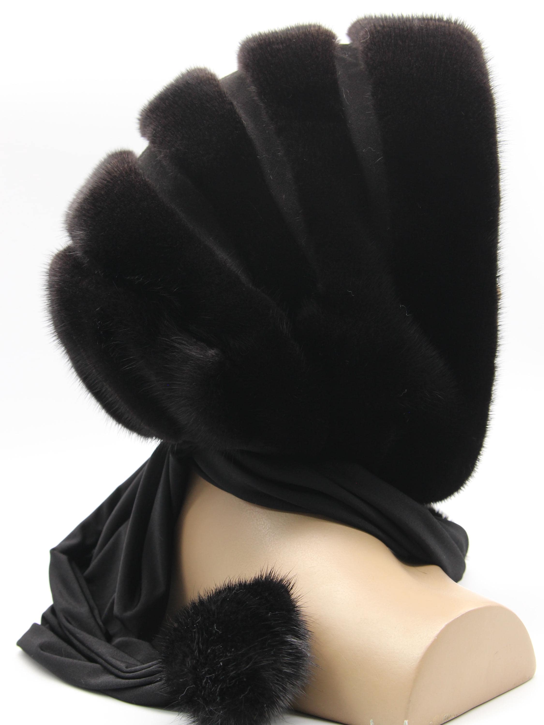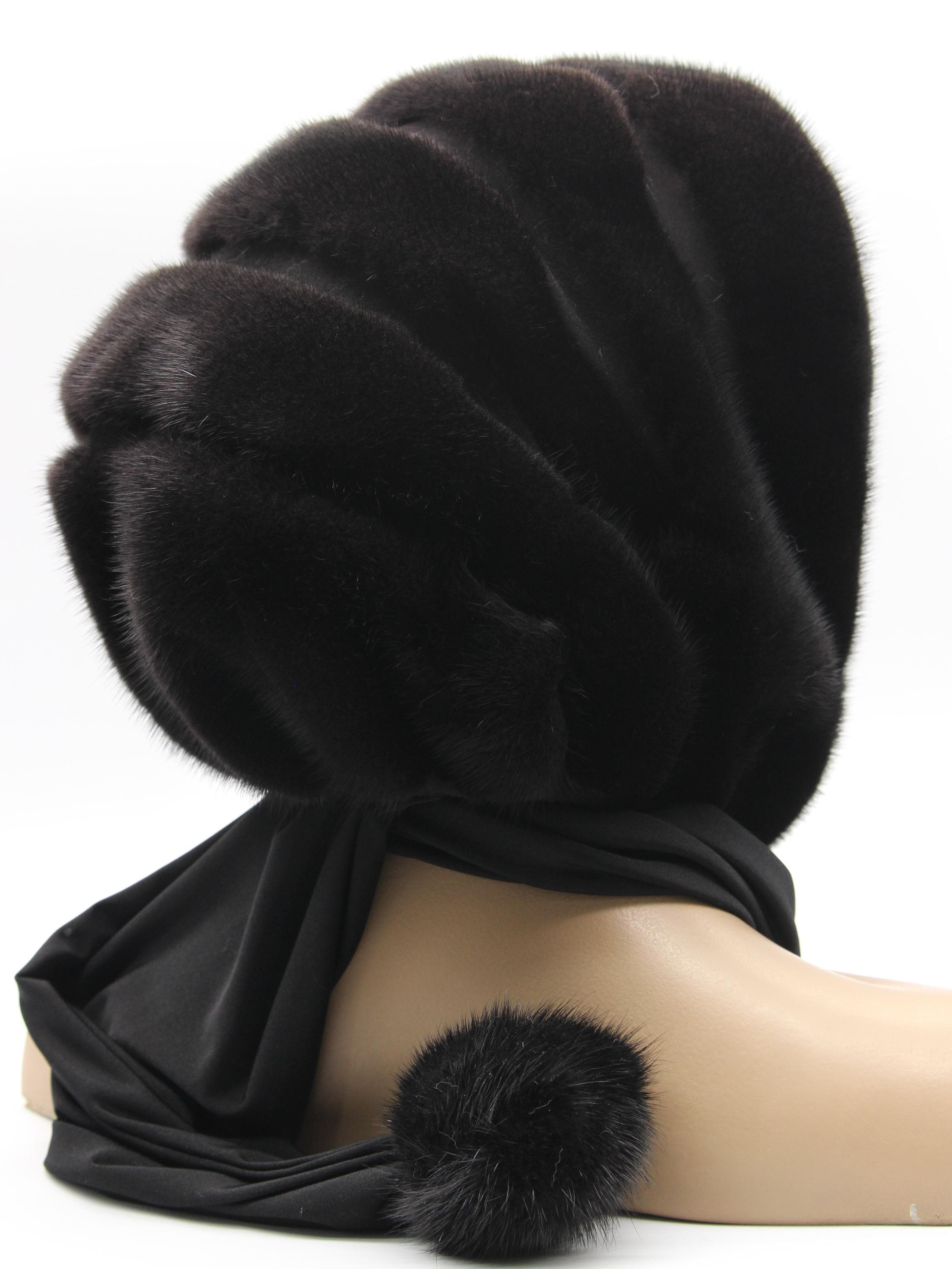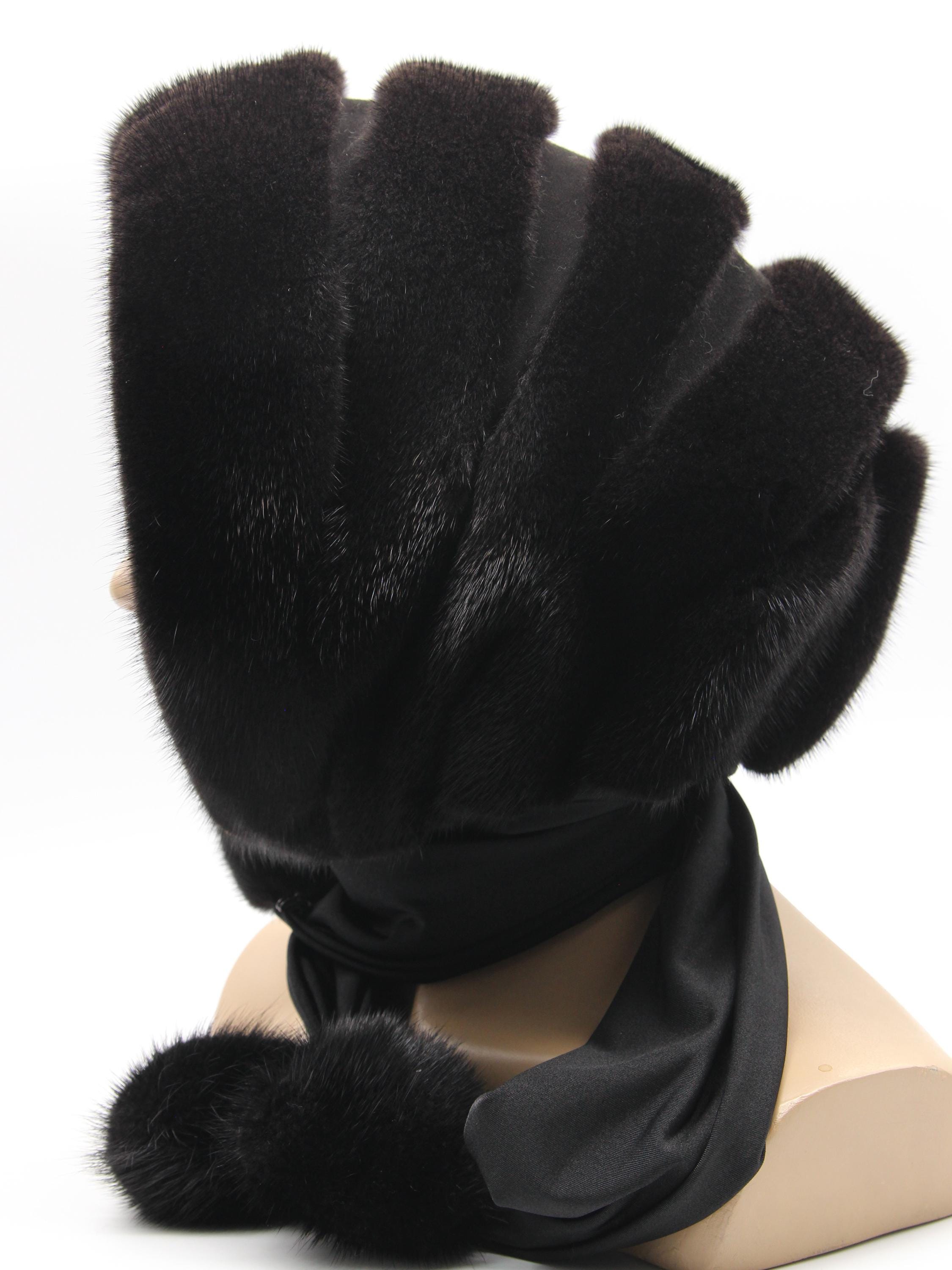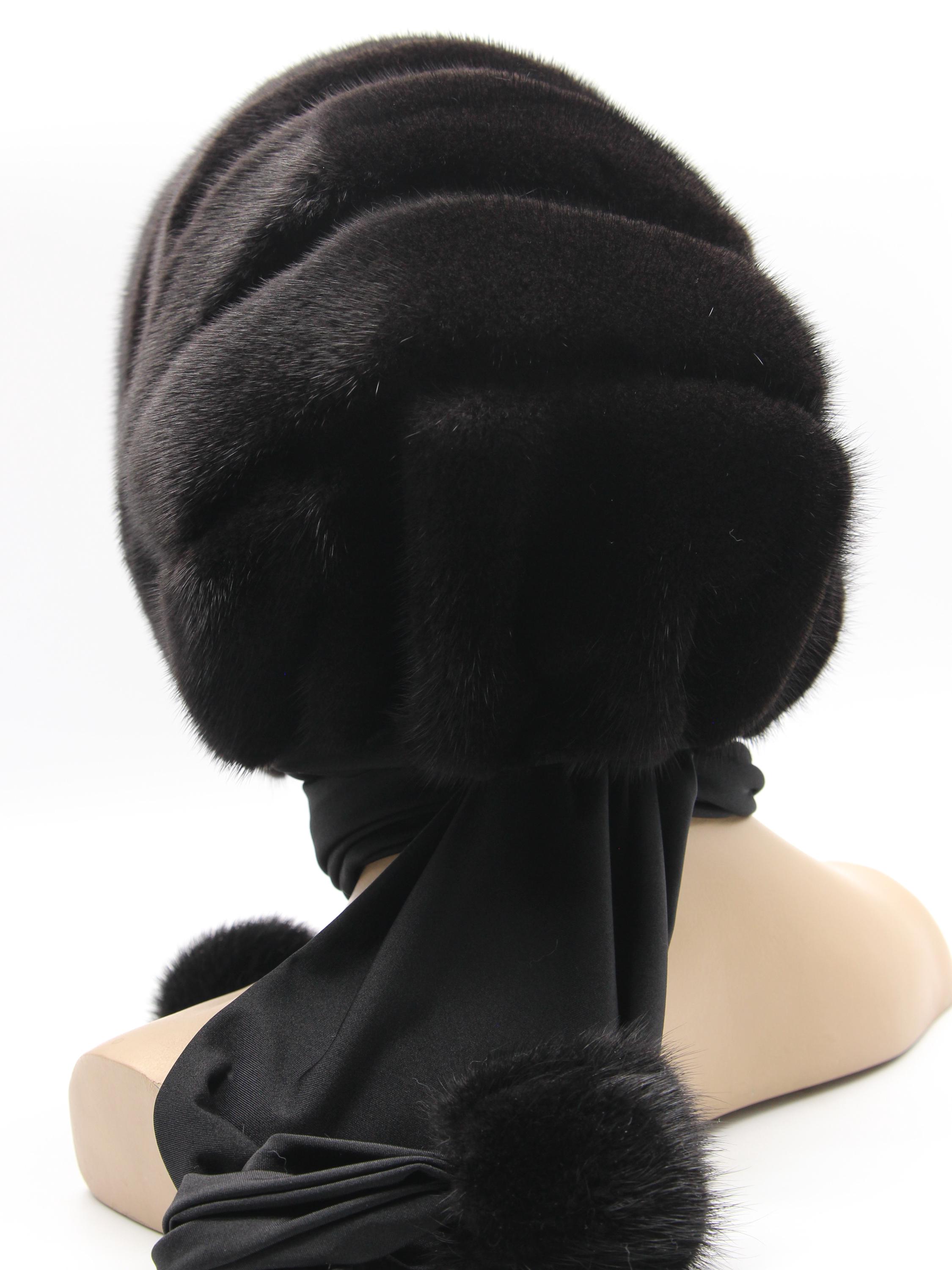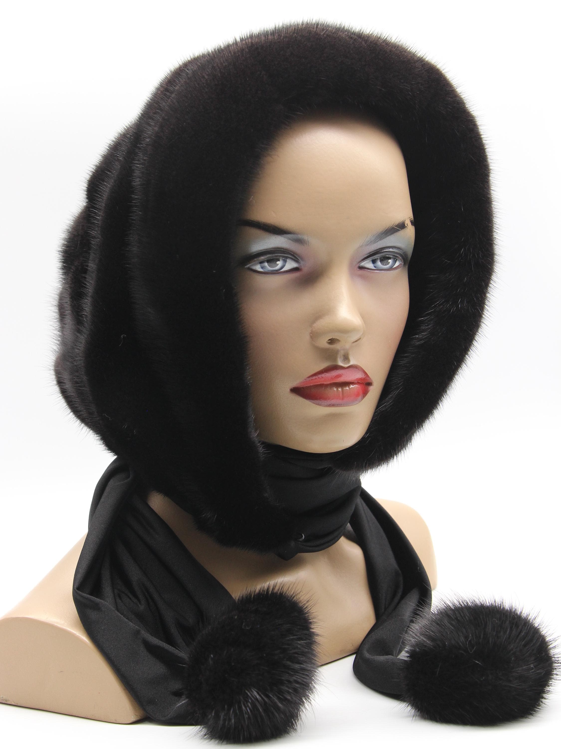 Natural dark brown mink fur forms the main hood portion, combined with carefully matched black fabric for the tie system and a soft lining against your skin. The dark brown and black combination creates that sophisticated elegant look that works with any winter wardrobe. The pom pom accents on the ties add that little touch of luxury.