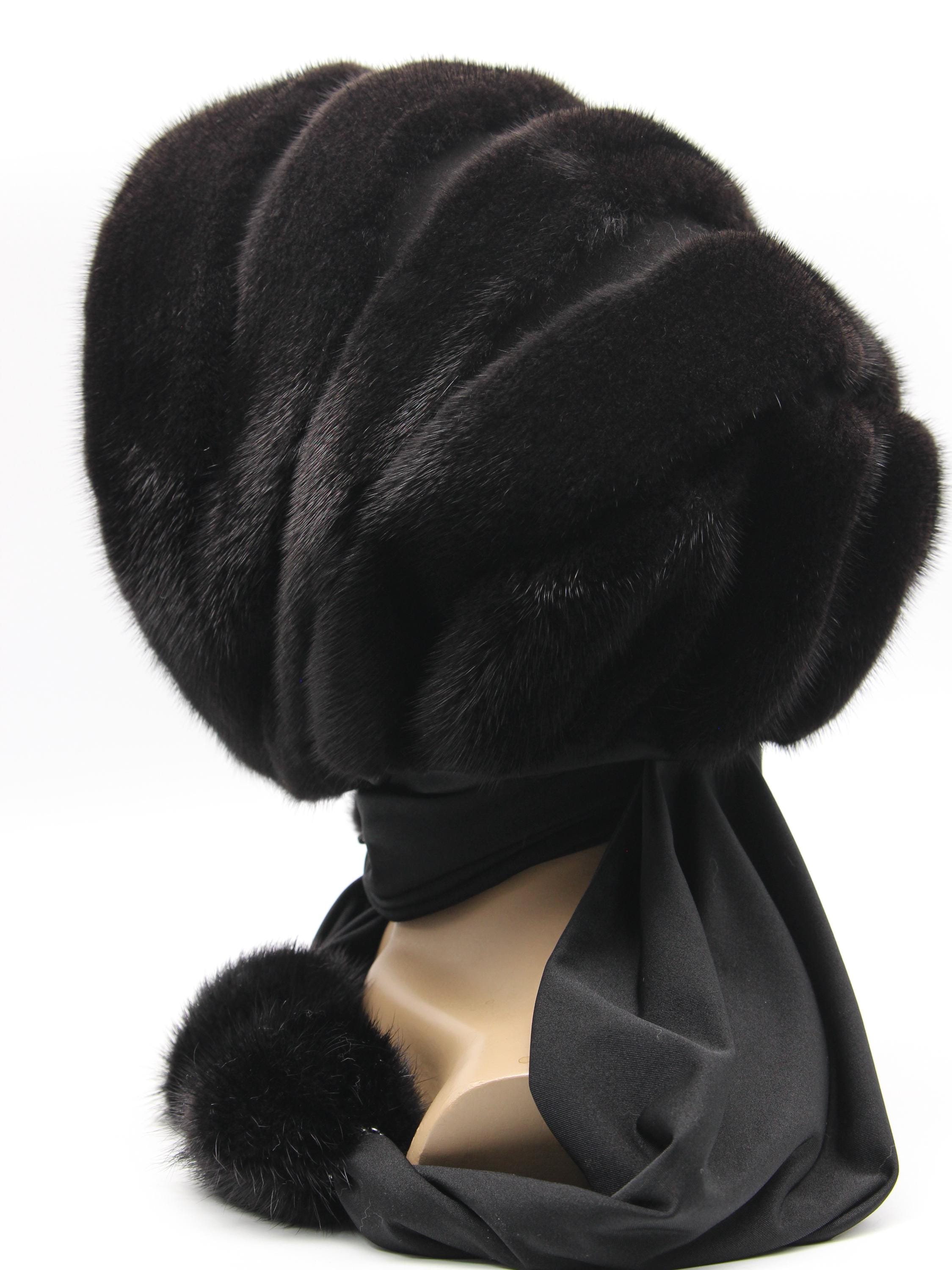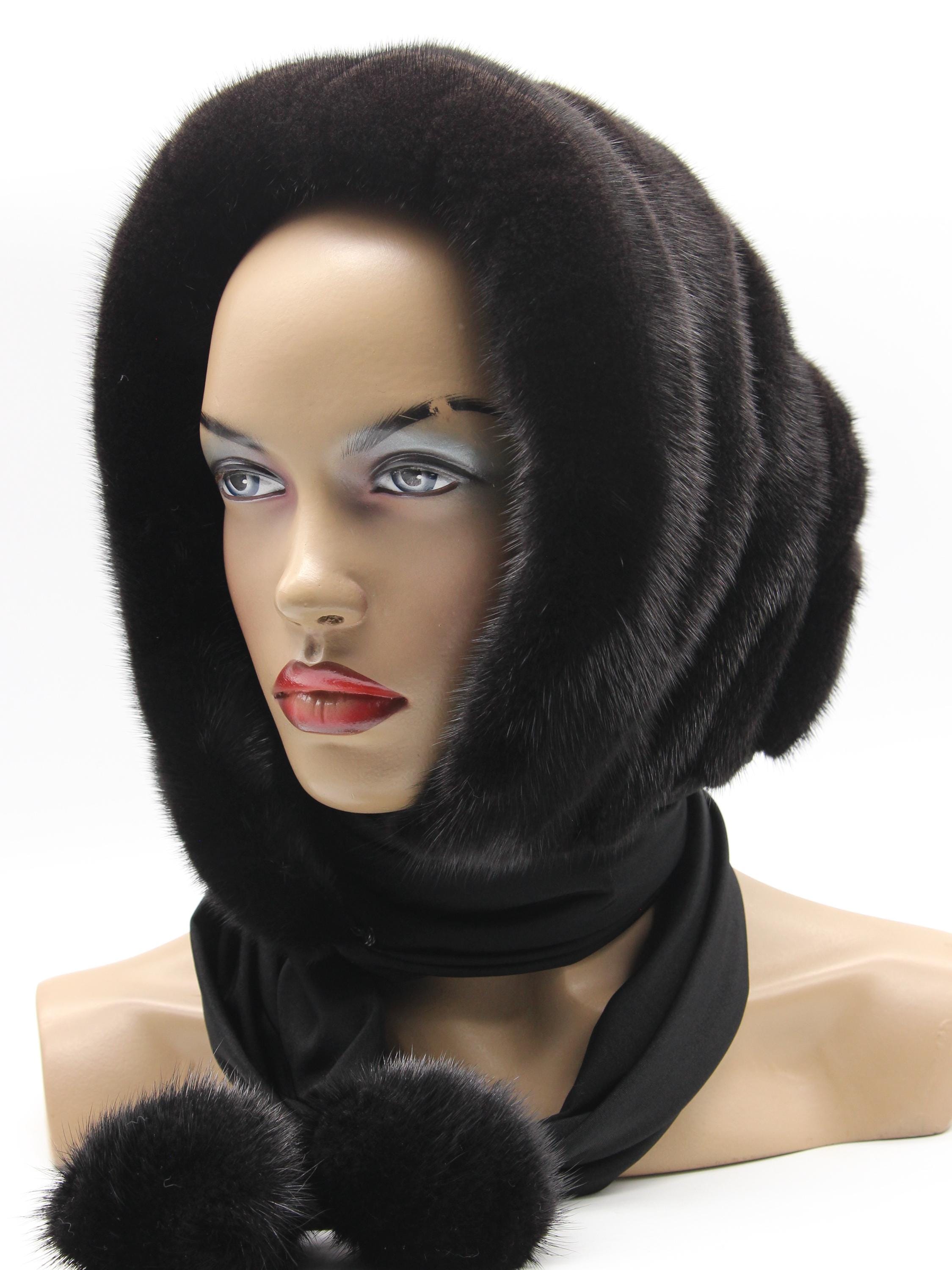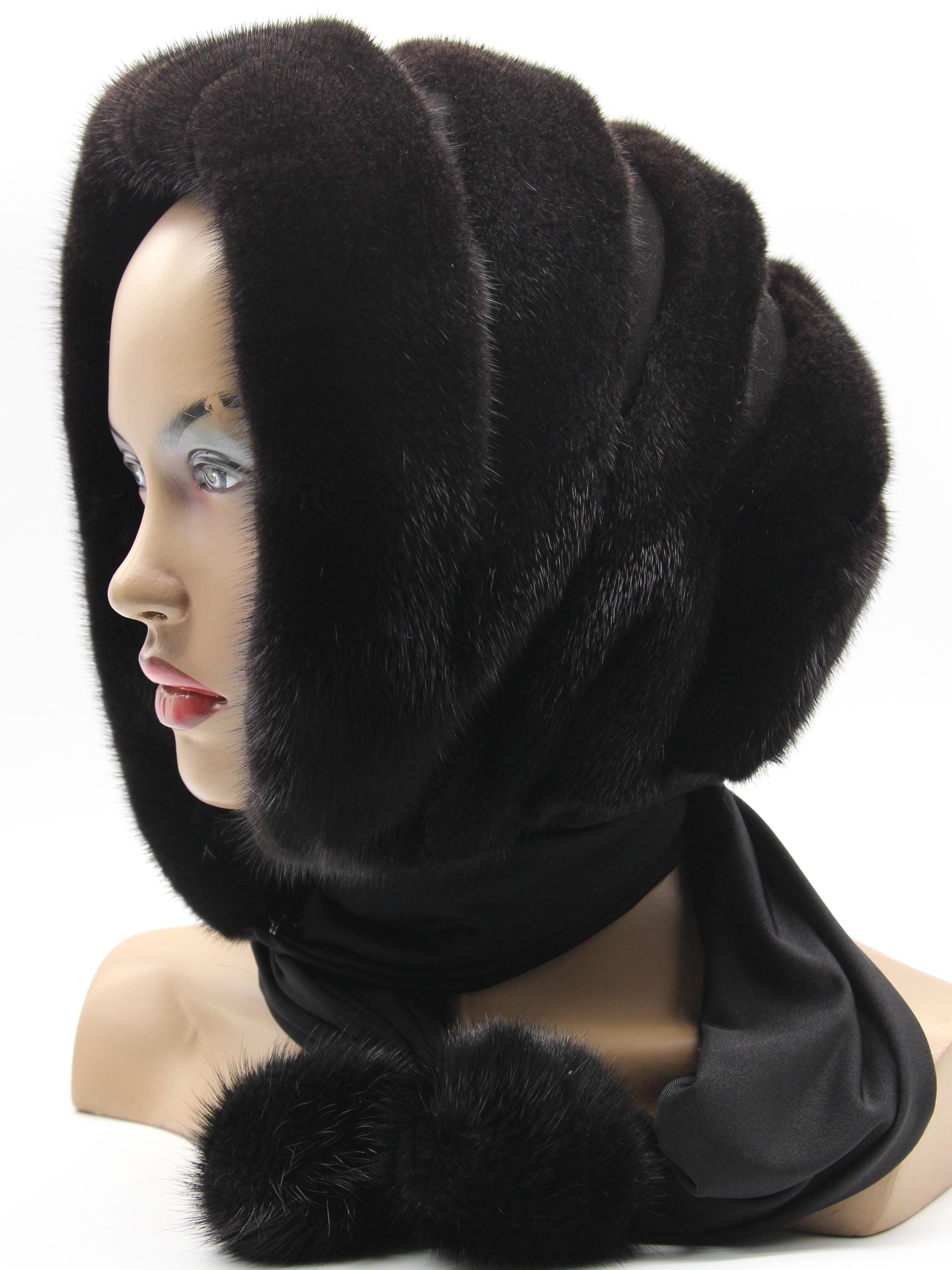 Women's winter hat meets hooded scarf in this natural dark brown mink fur design. Real dark brown mink fur hood wraps your head while black fabric scarf portion covers neck and shoulders. One piece construction eliminates gaps between hat and scarf. Cold weather accessory handmade with black fabric ties and soft lining. Dark brown mink fur head warmer for harsh winter conditions in Detroit, Winnipeg, and similar climates.