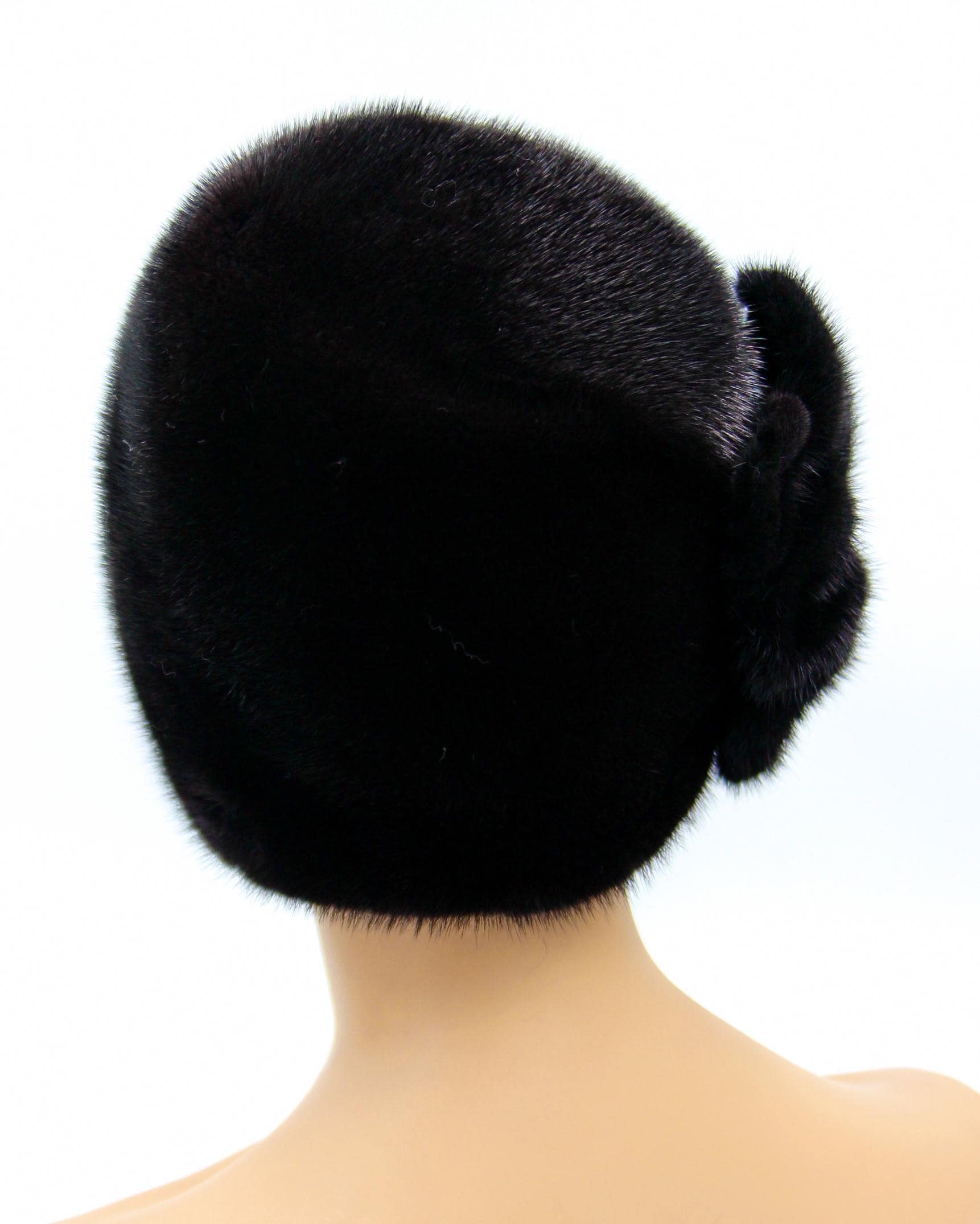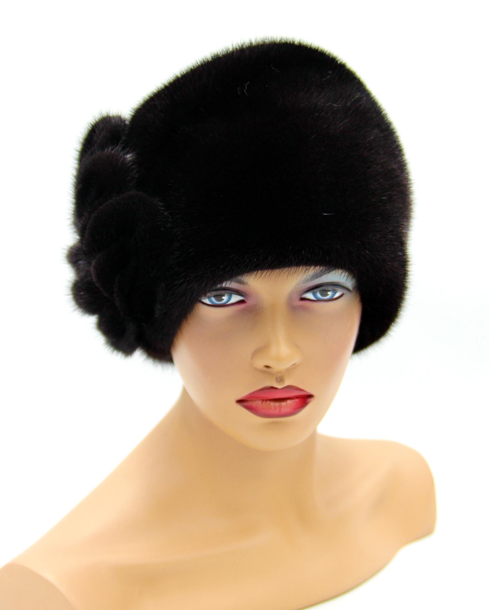 Black mink fur hat Lola with decorative applique - this is the go-with-everything option. Deep black pairs with literally any winter coat you own. That classic elegance some colors just naturally have. The ornamental detail shows up beautifully against solid black creating visual interest through texture rather than color contrast.