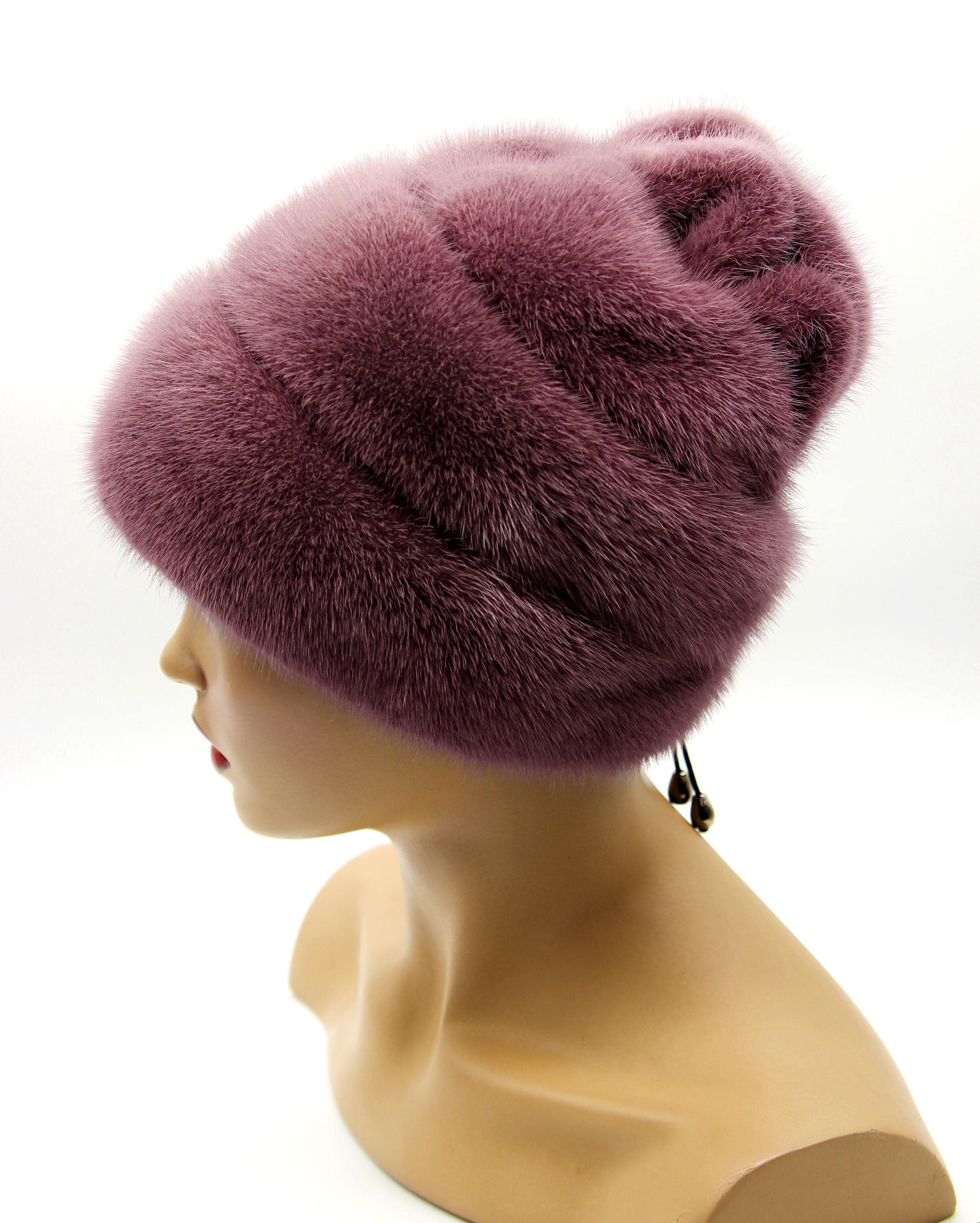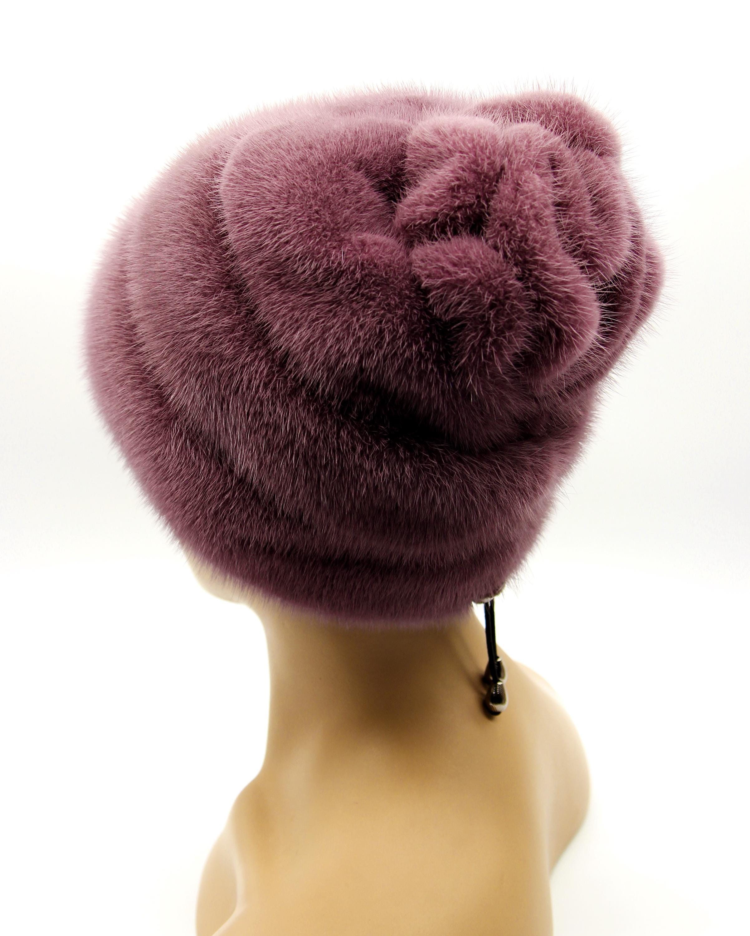Lilac Purple Mink Fur Hat Rosette Women Winter Striped