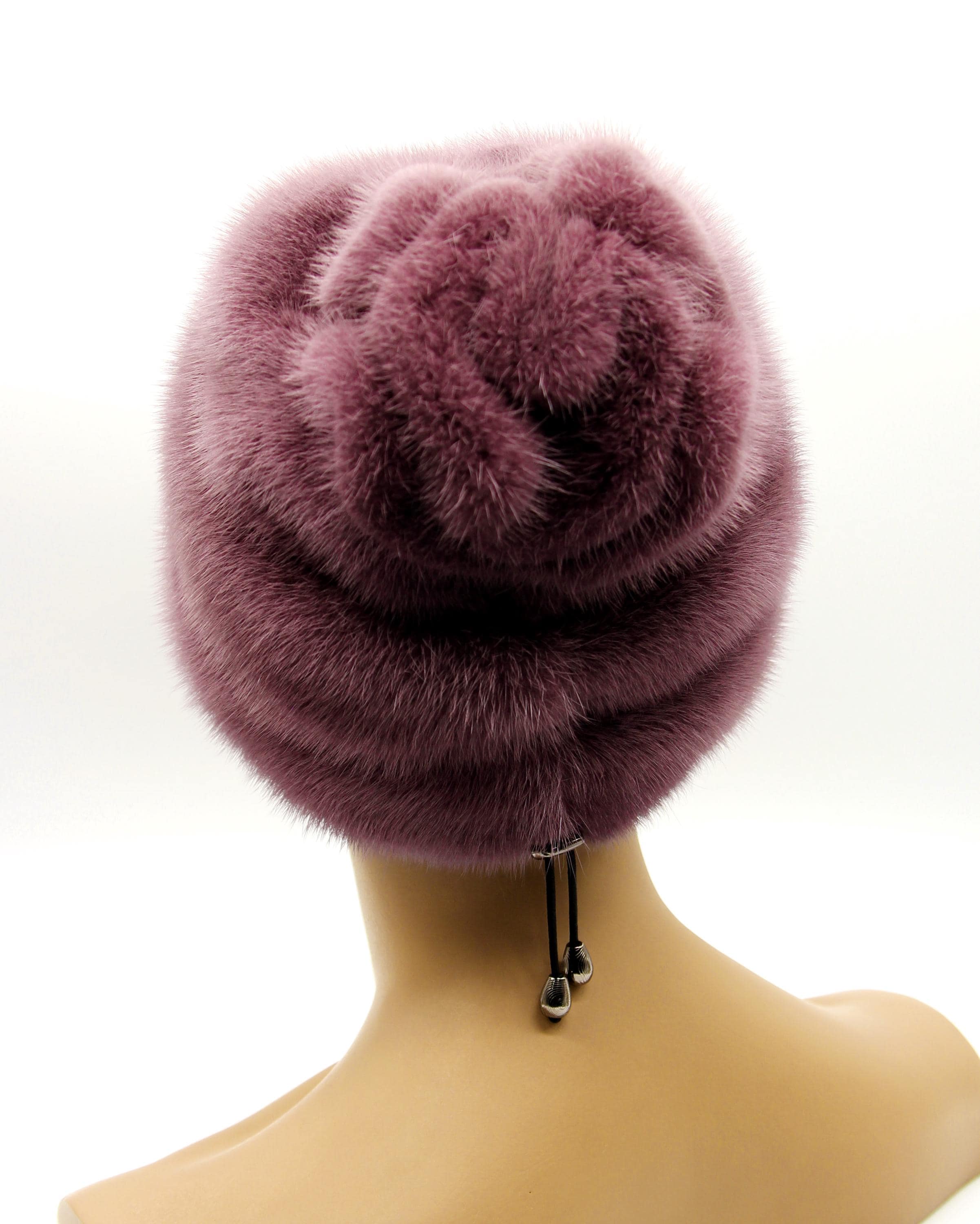 Fur hat lilac Rosette featuring alternating construction - four mink bands with thin suede strips between them going full circle. Back has gathered fur creating soft rose-like detail. Developed this design wanting something more architecturally interesting than standard solid fur caps.