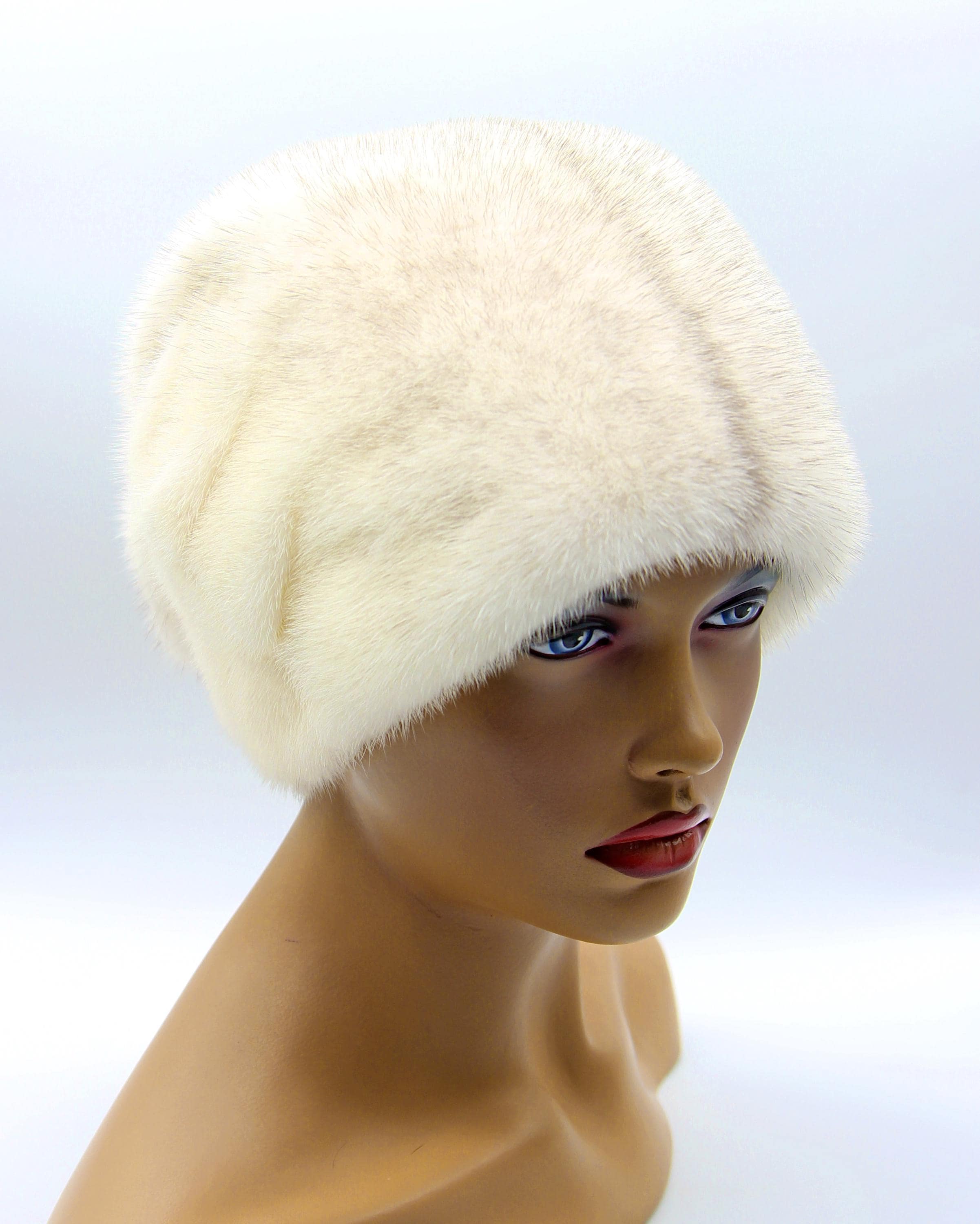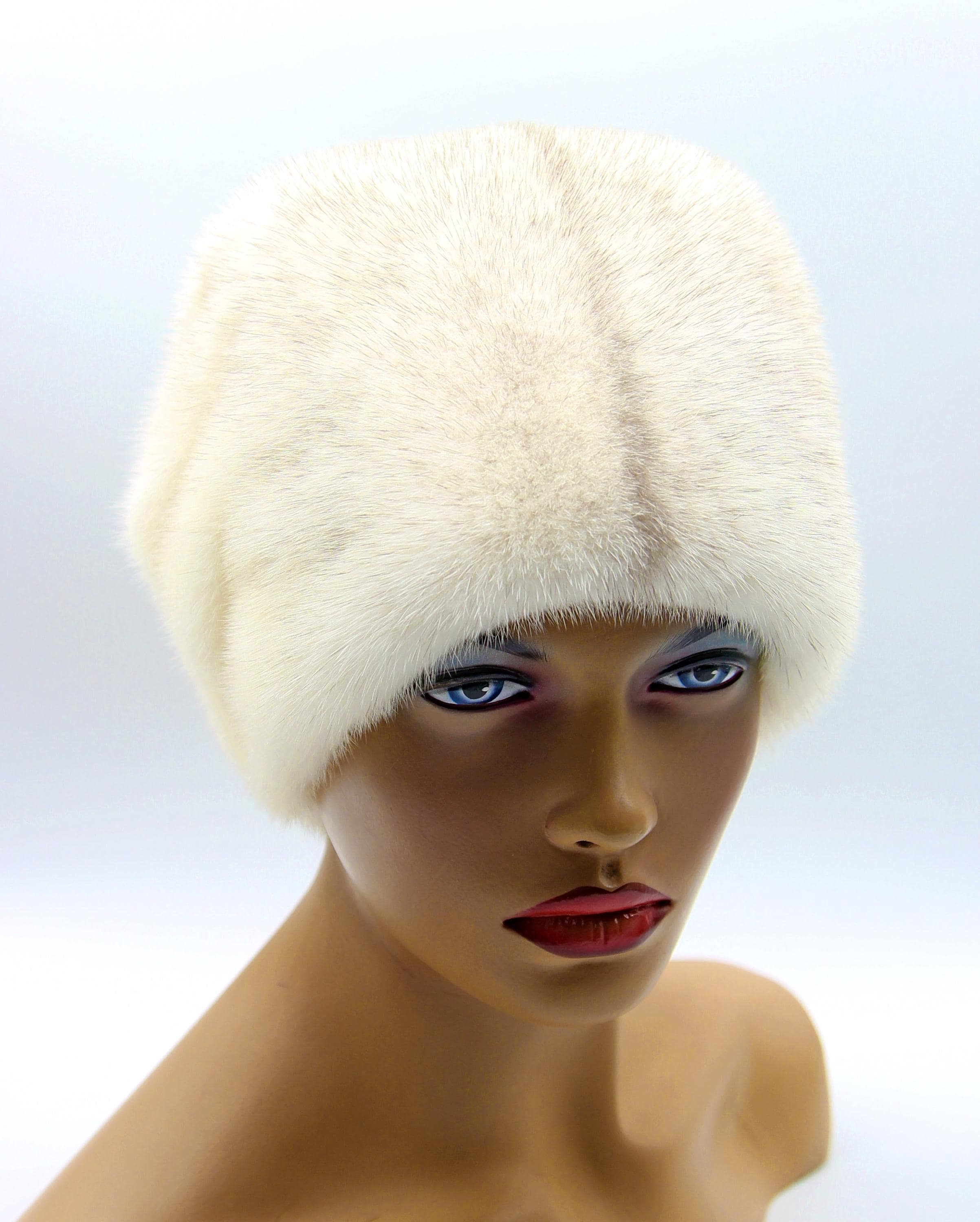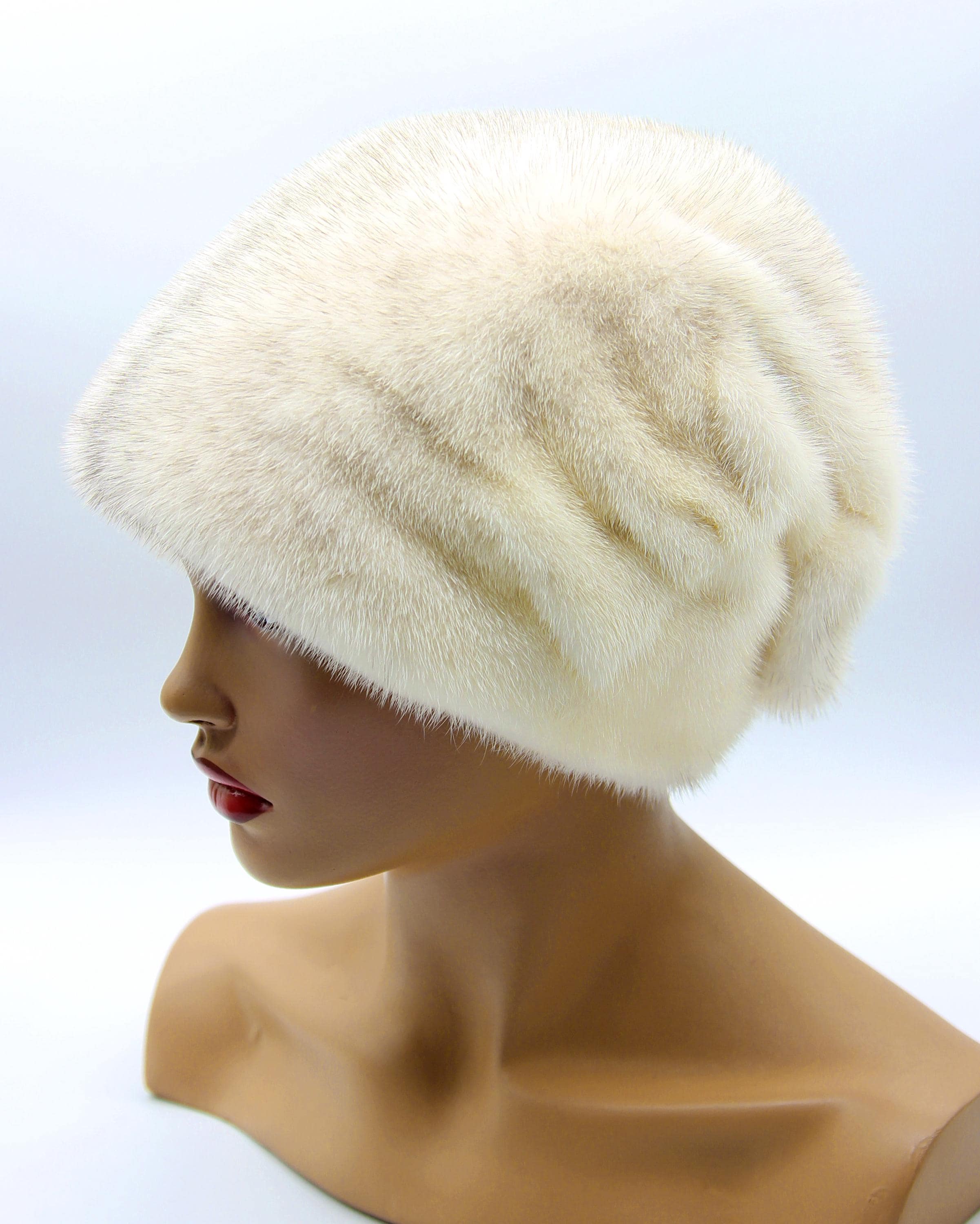 Silver Cross Mink Fur Hat for Women - Handmade Natural Ivory Winter Headwear