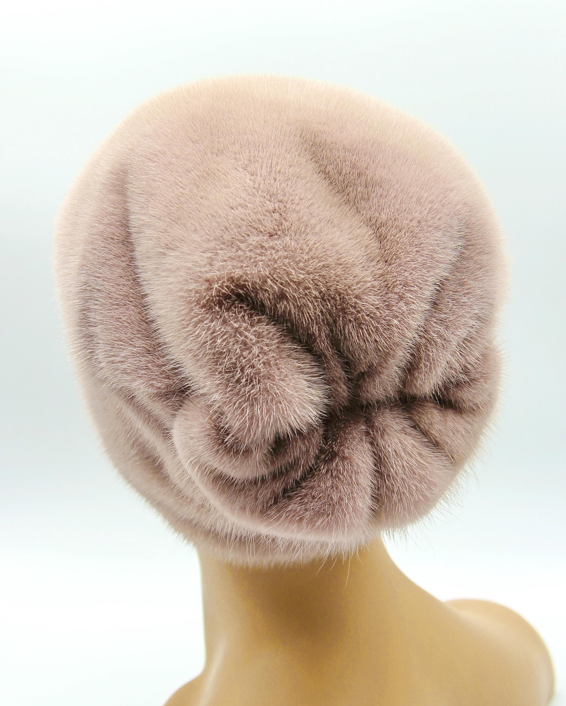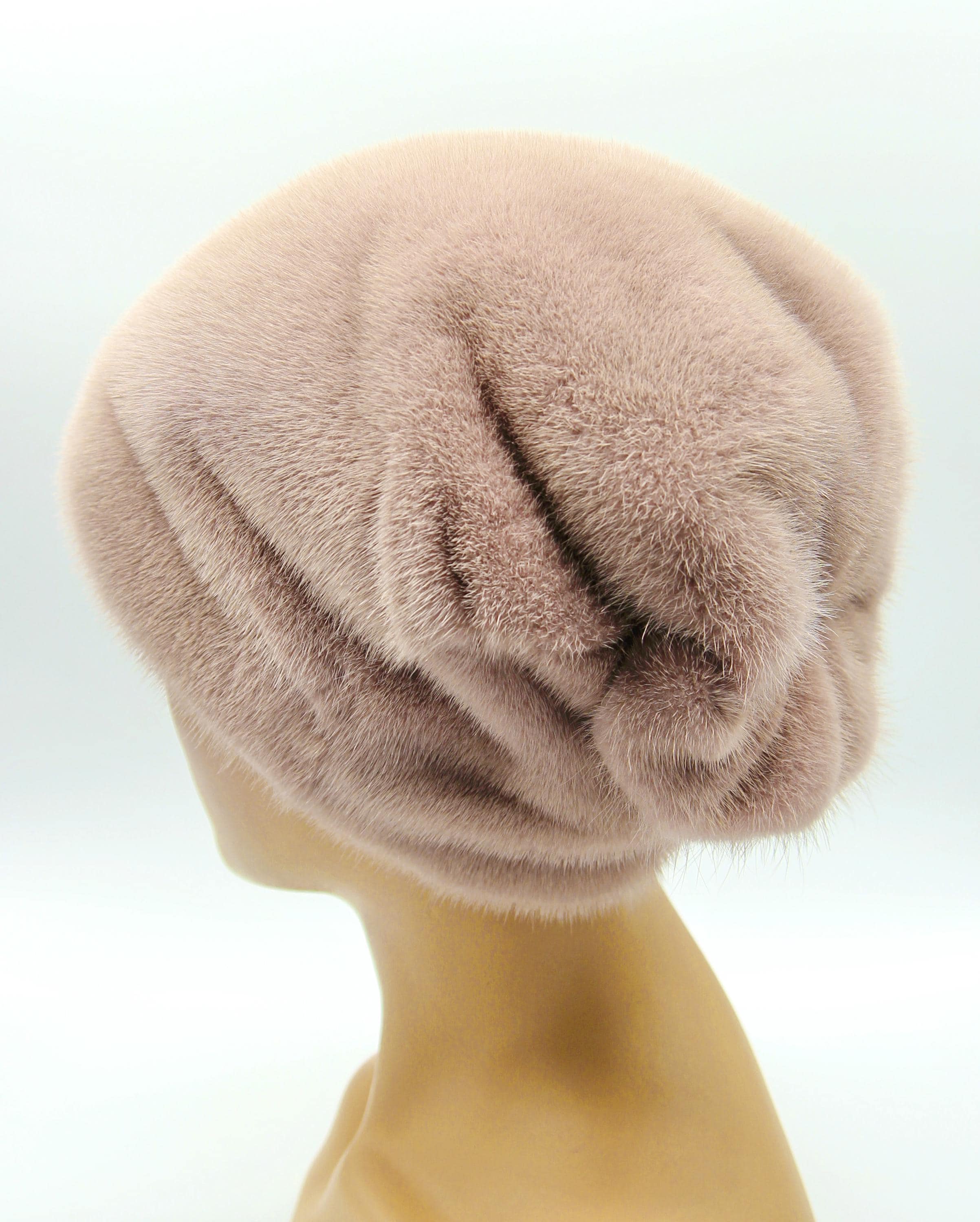 Mink hat gathered back creates interesting softness with powder specifically. Color enhances texture rather than competing. Customer described "looks like wearing warm cloud" pretty accurate honestly.