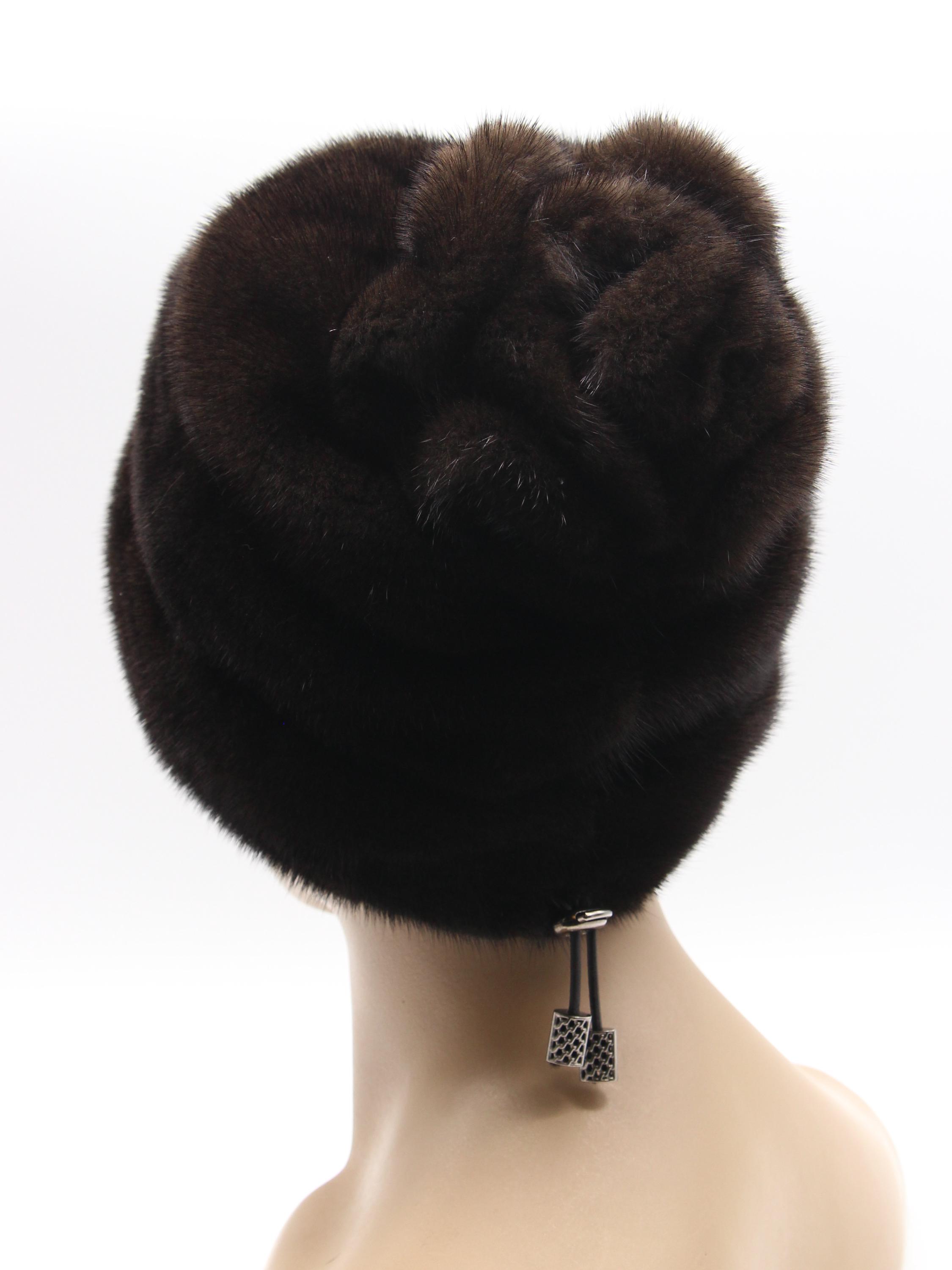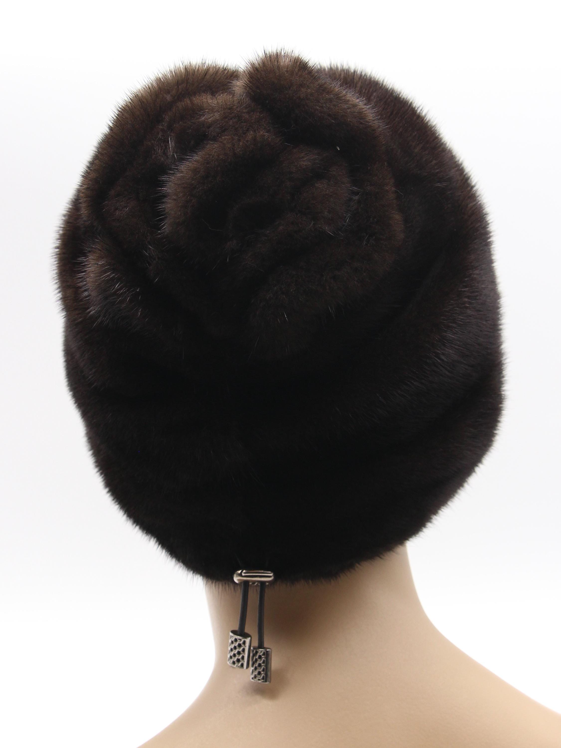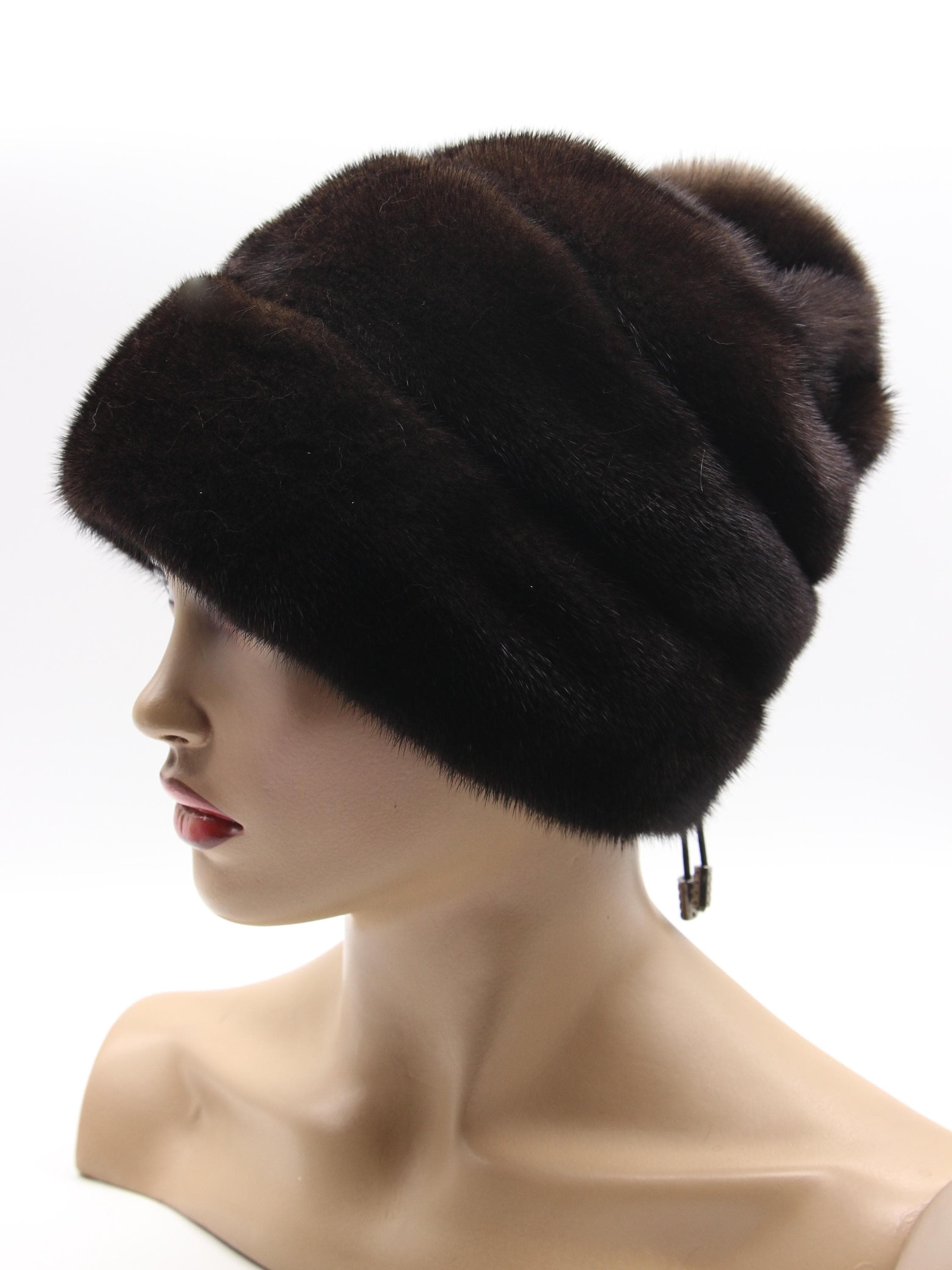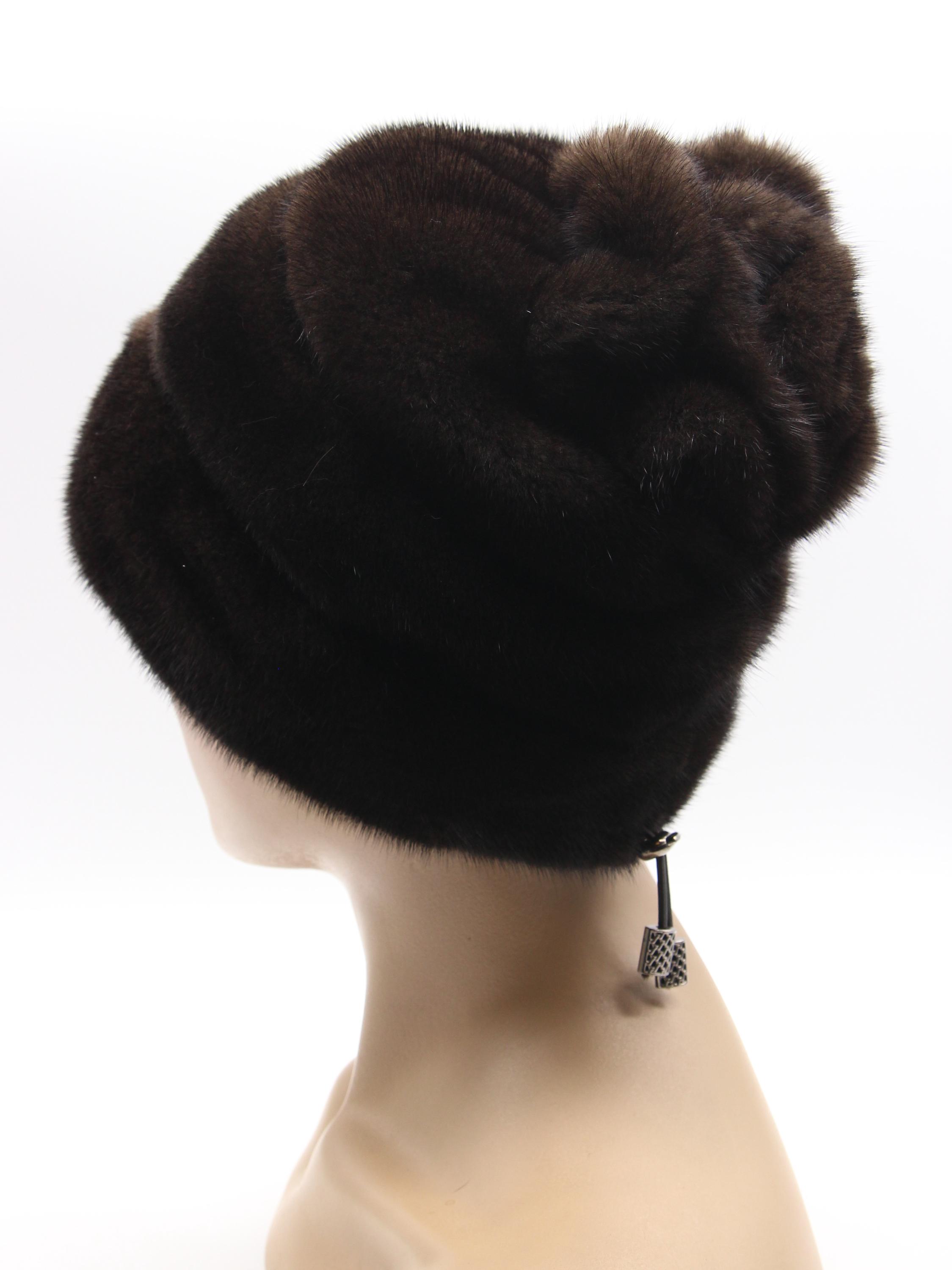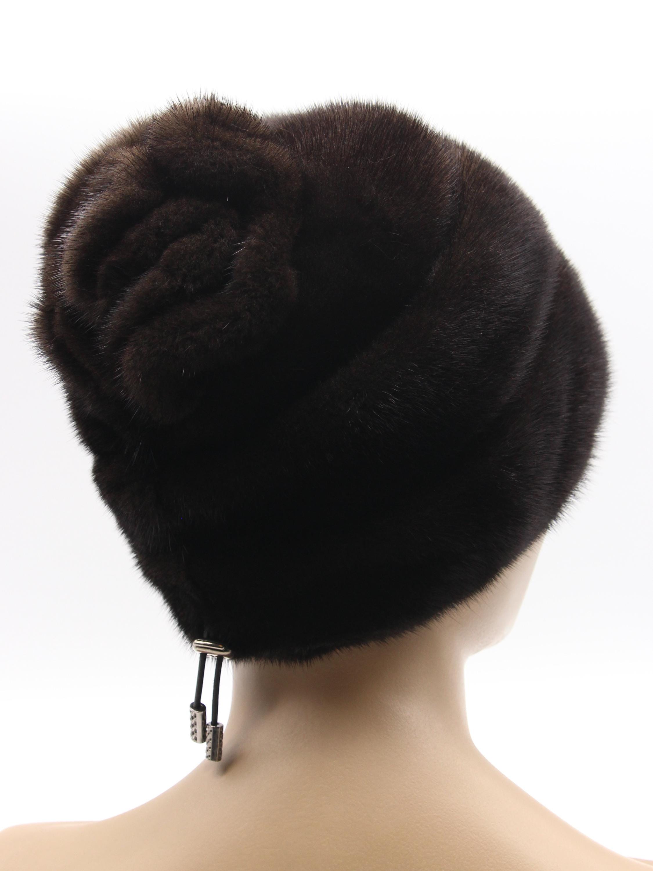 Brown Mink Fur Hat with Suede Strips Rose Detail for Women - Handmade Natural Winter