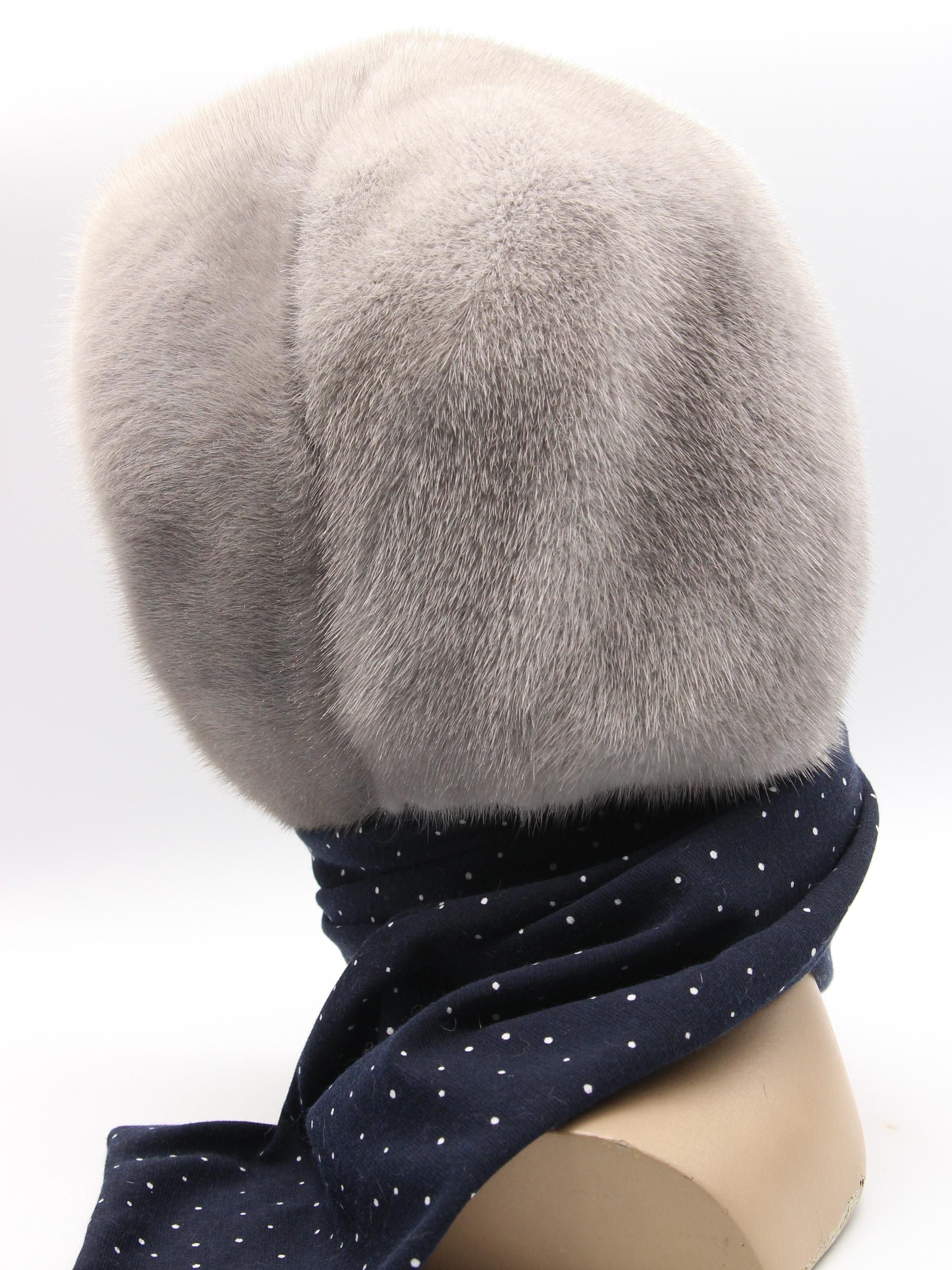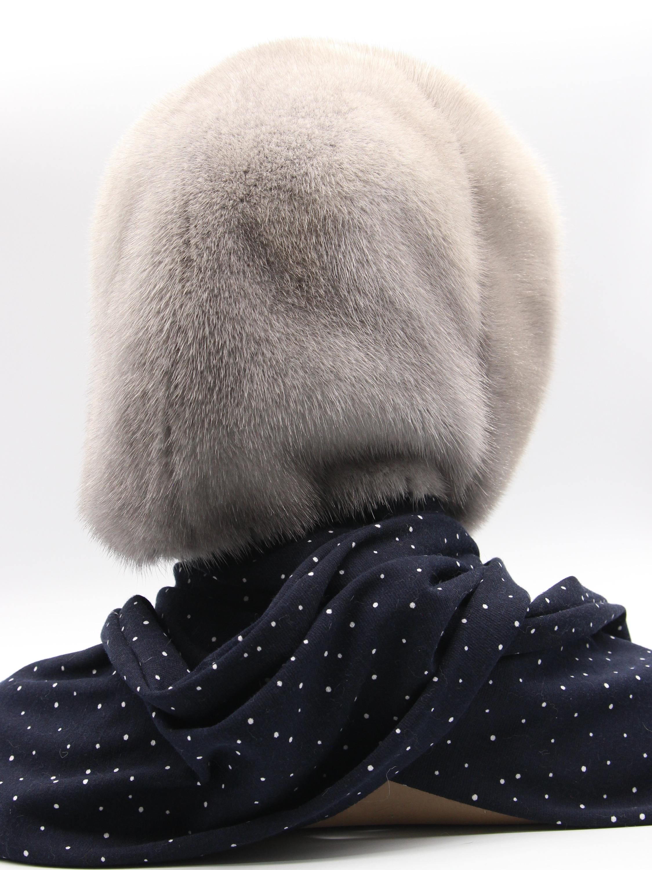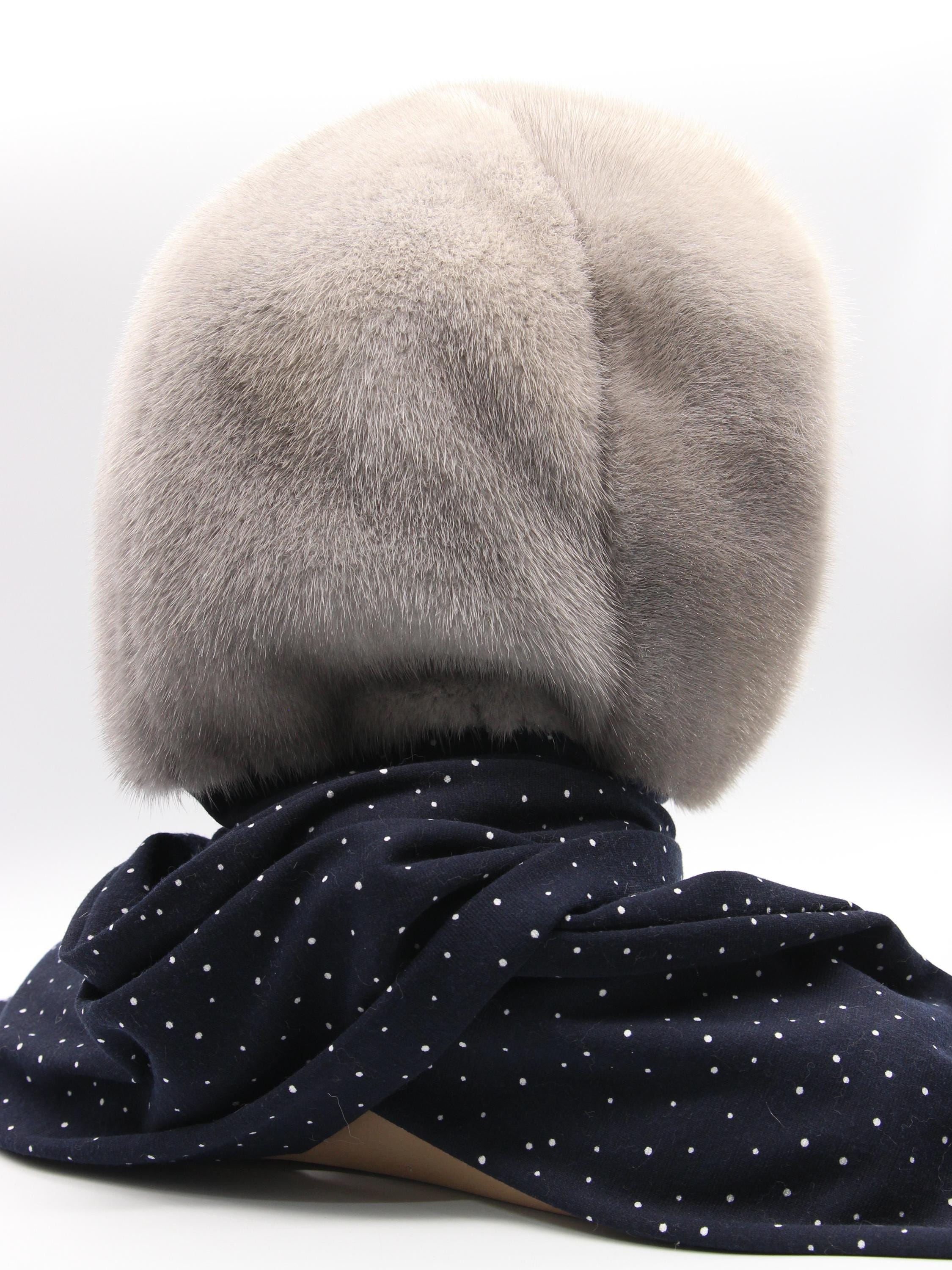 Here's the thing about this sapphire fur hat. From outside it's all sophisticated blue gray mink, classic winter luxury. Then you fold it back and boom, navy fabric with white dots inside. That contrast makes people do a double take every single time.