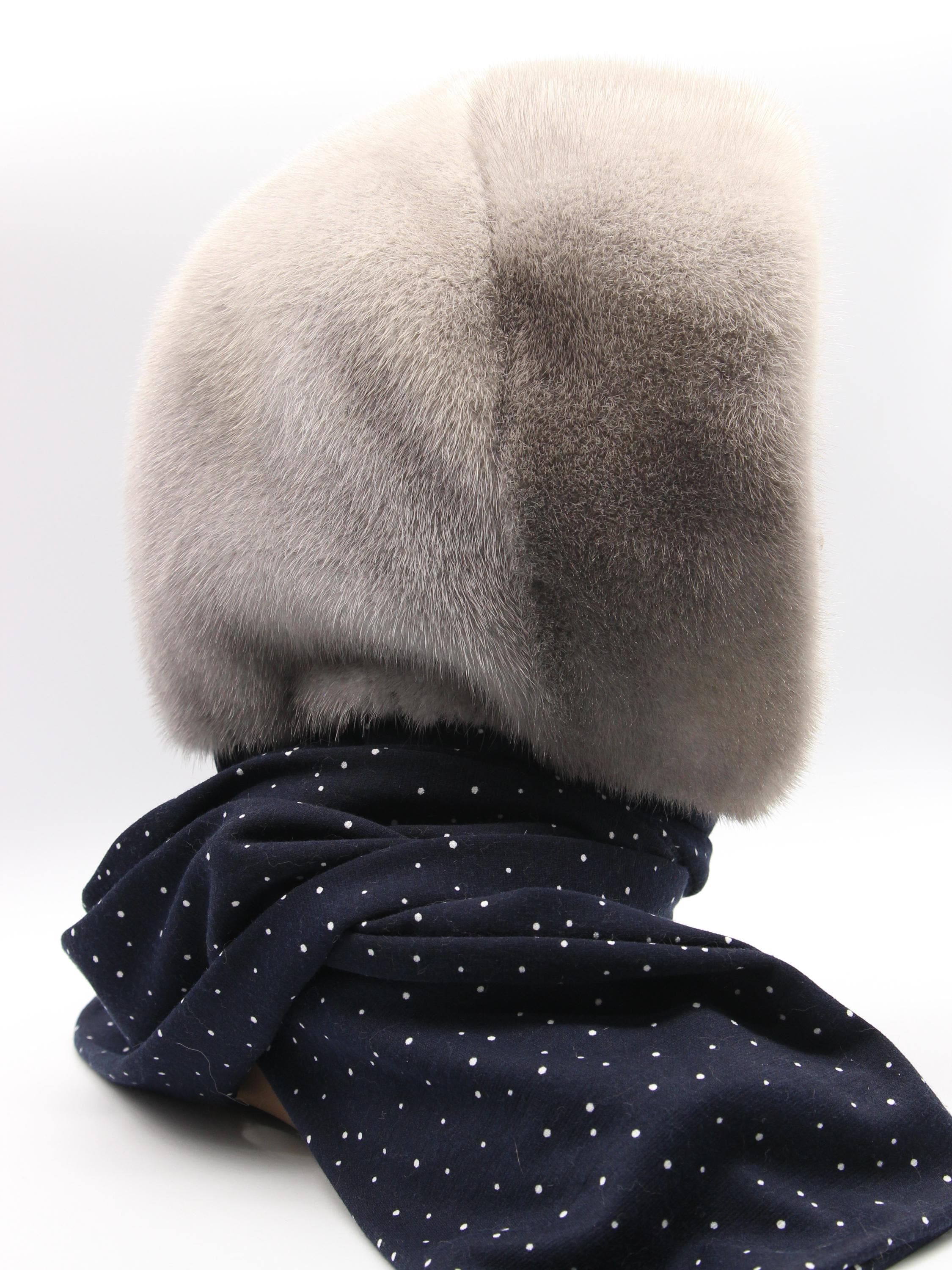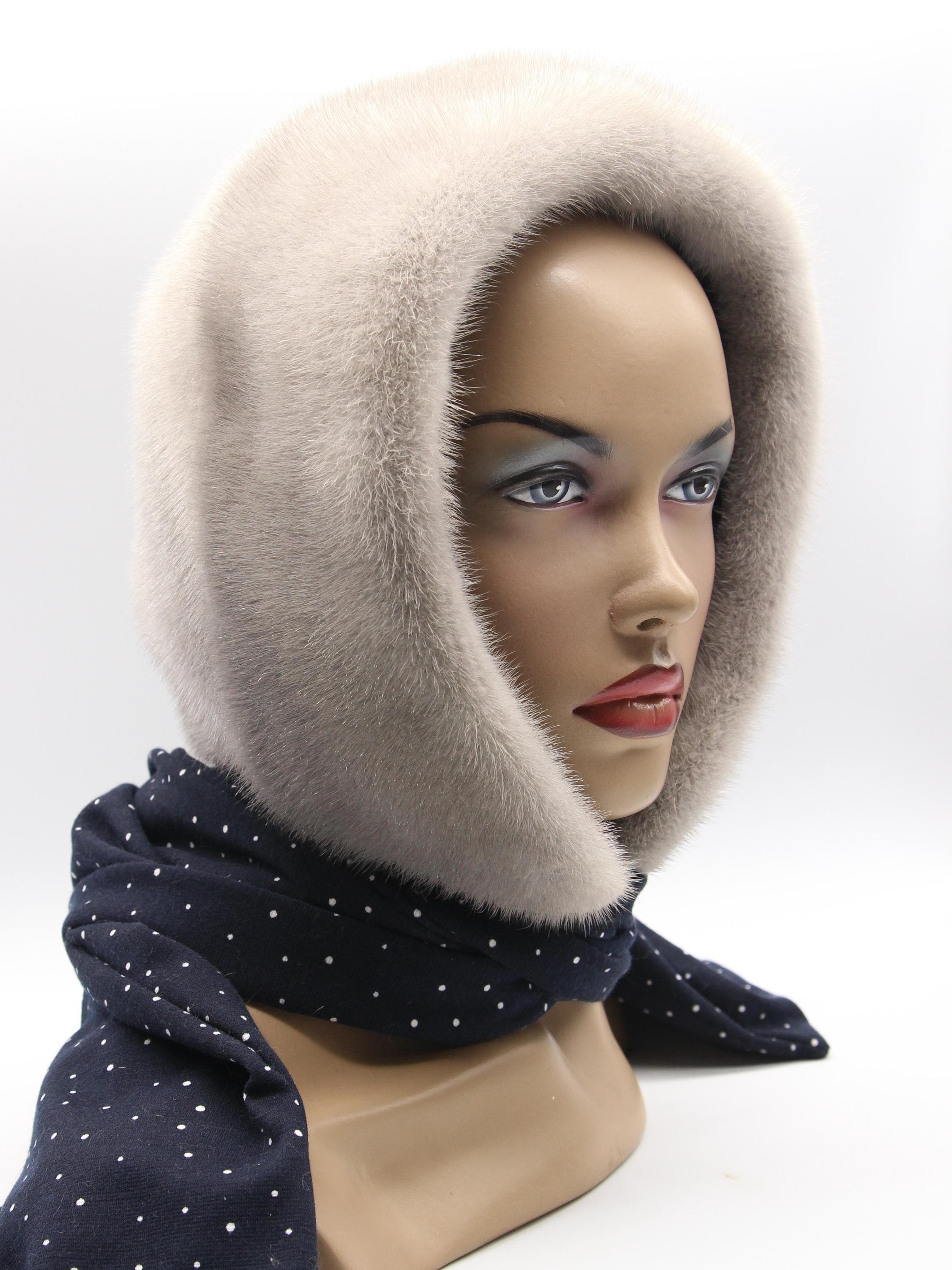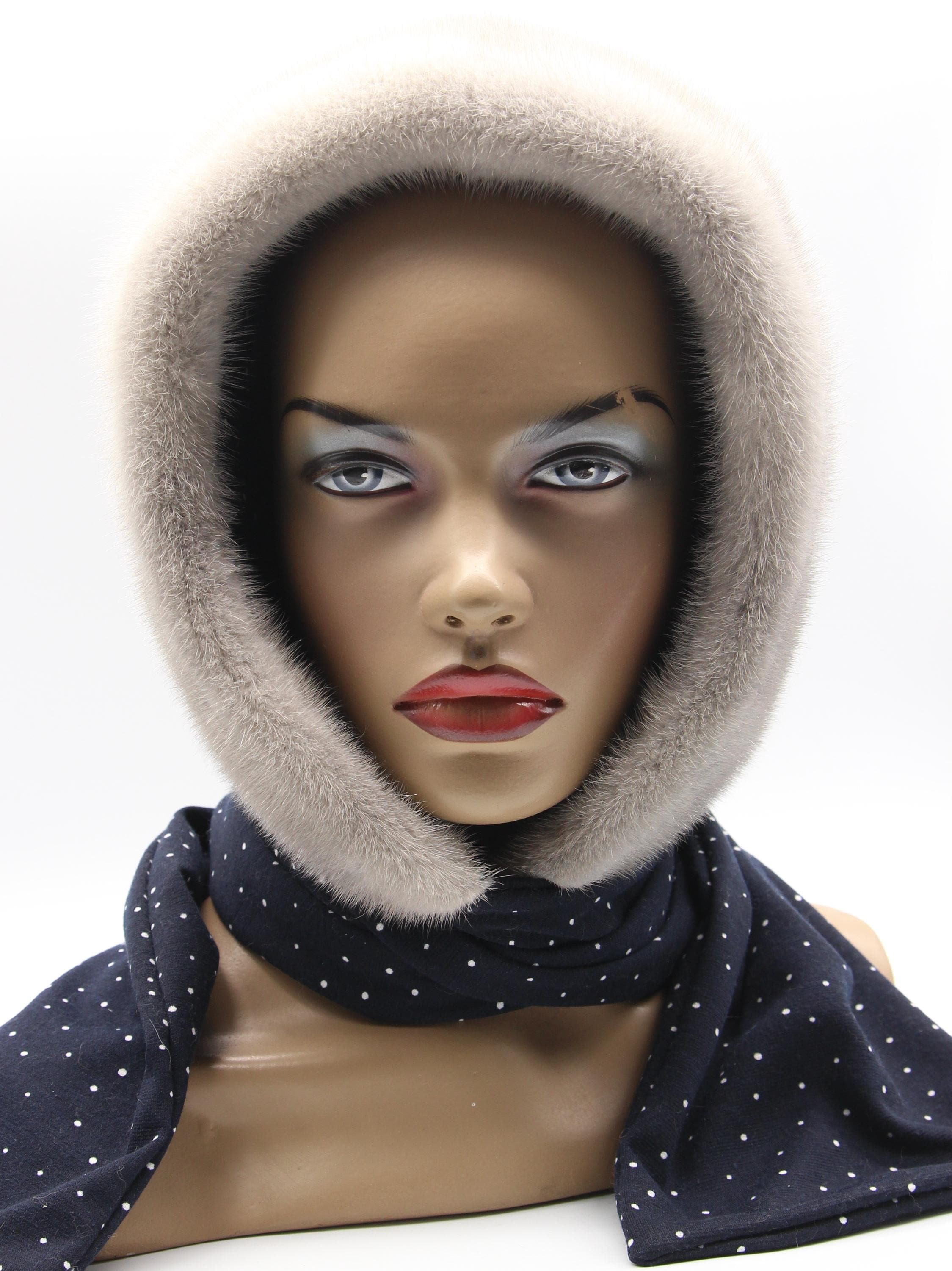 Sapphire Mink Fur Hat Women Hooded Scarf Handmade Winter Hood Navy White Dots Lining Luxury