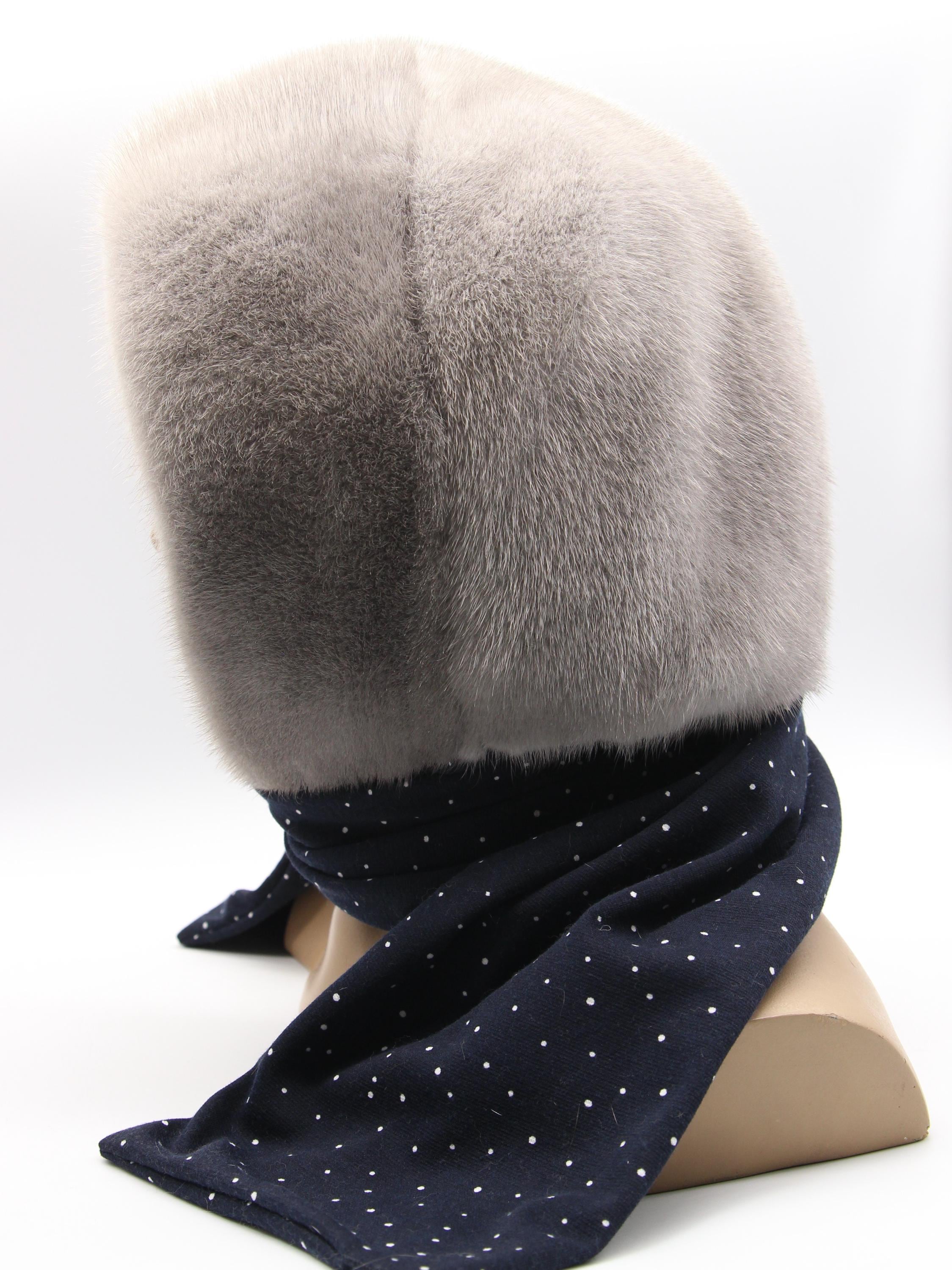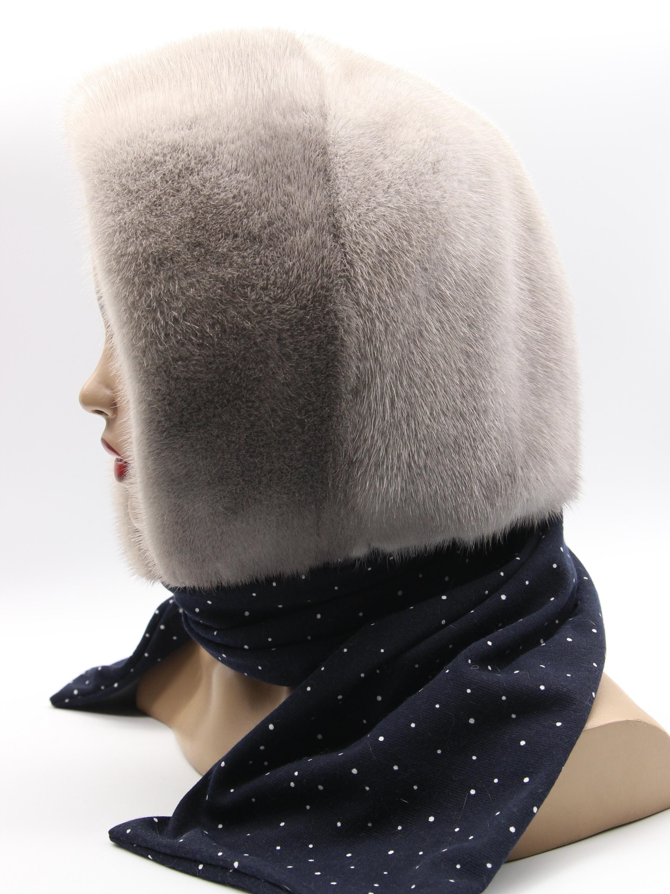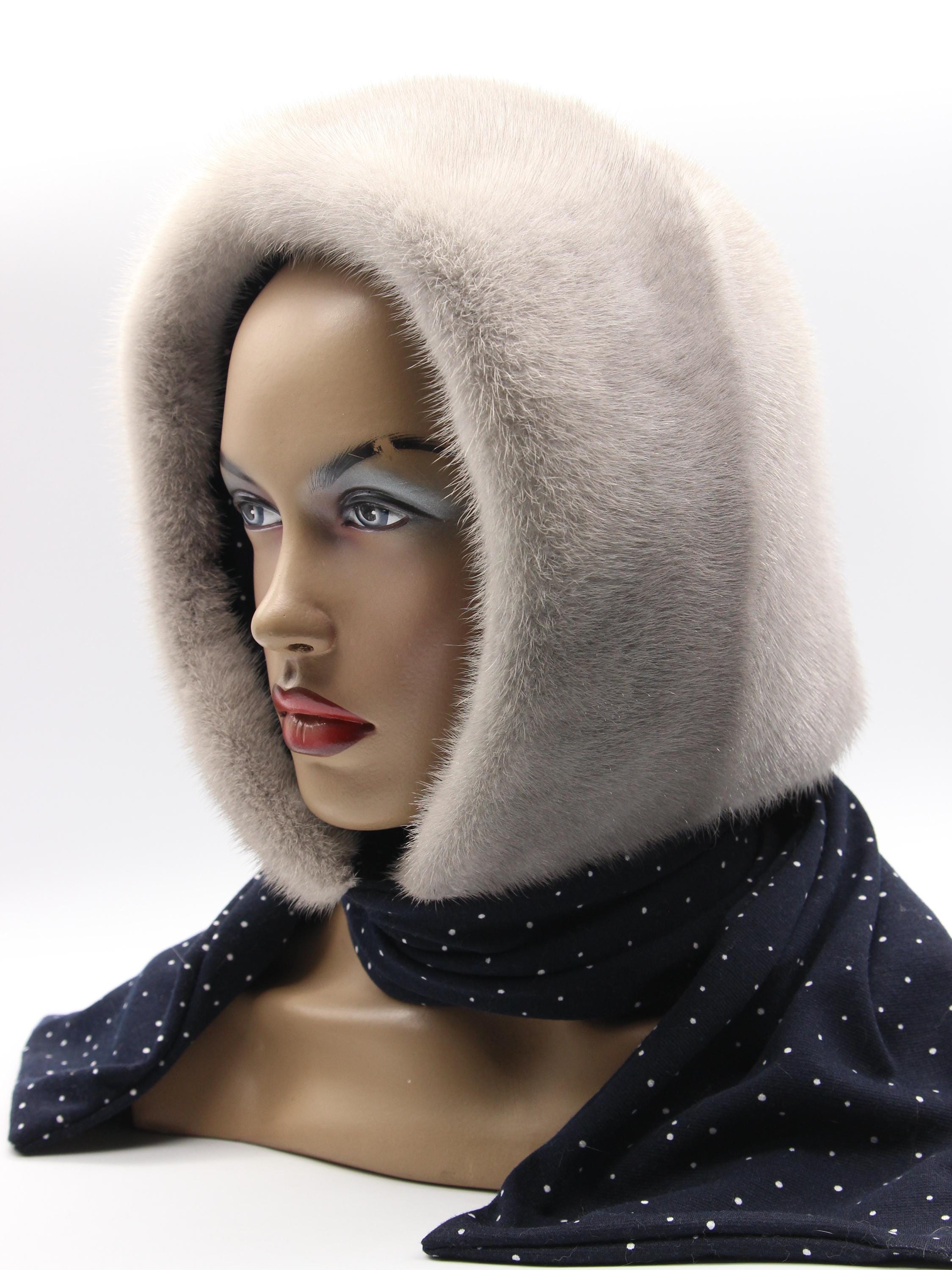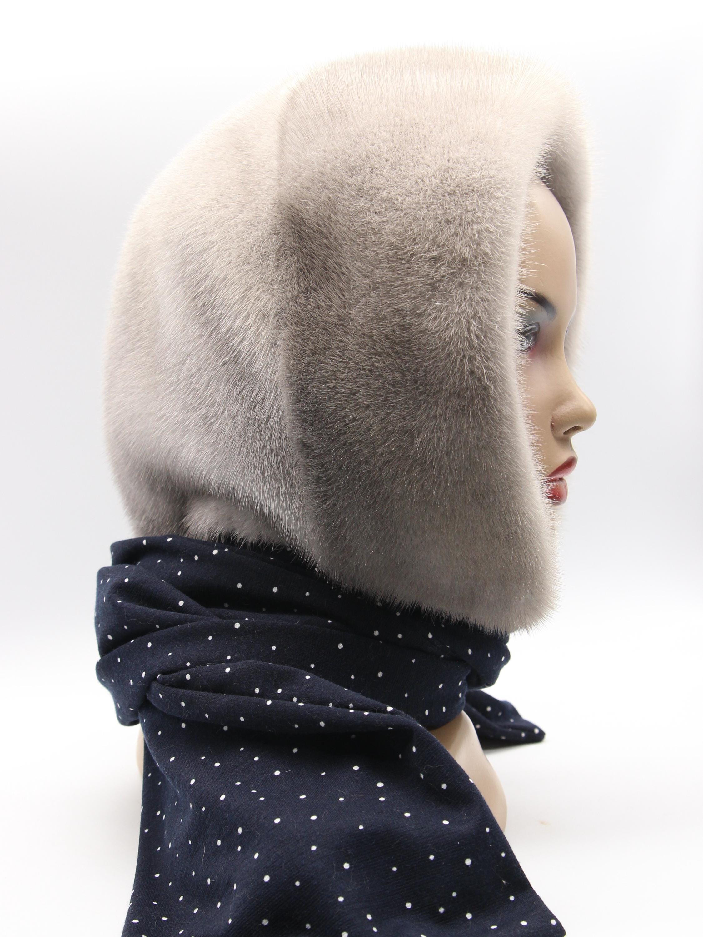 Sapphire Mink Fur Hat Women Hooded Scarf Handmade Winter Hood Navy White Dots Lining Luxury