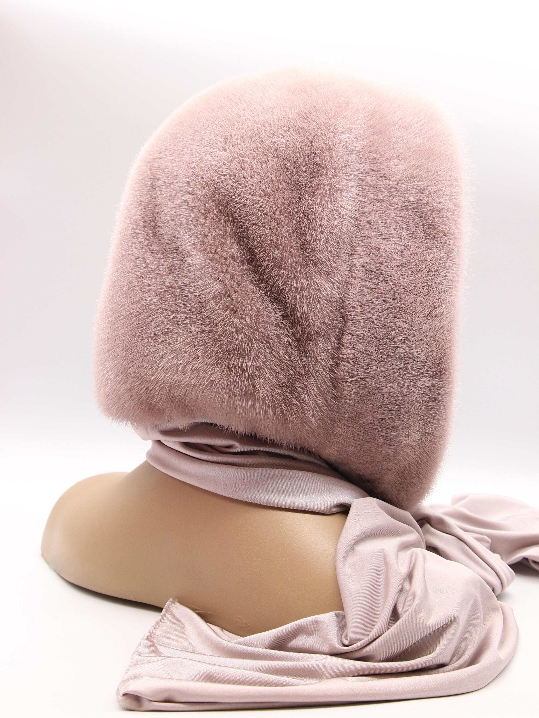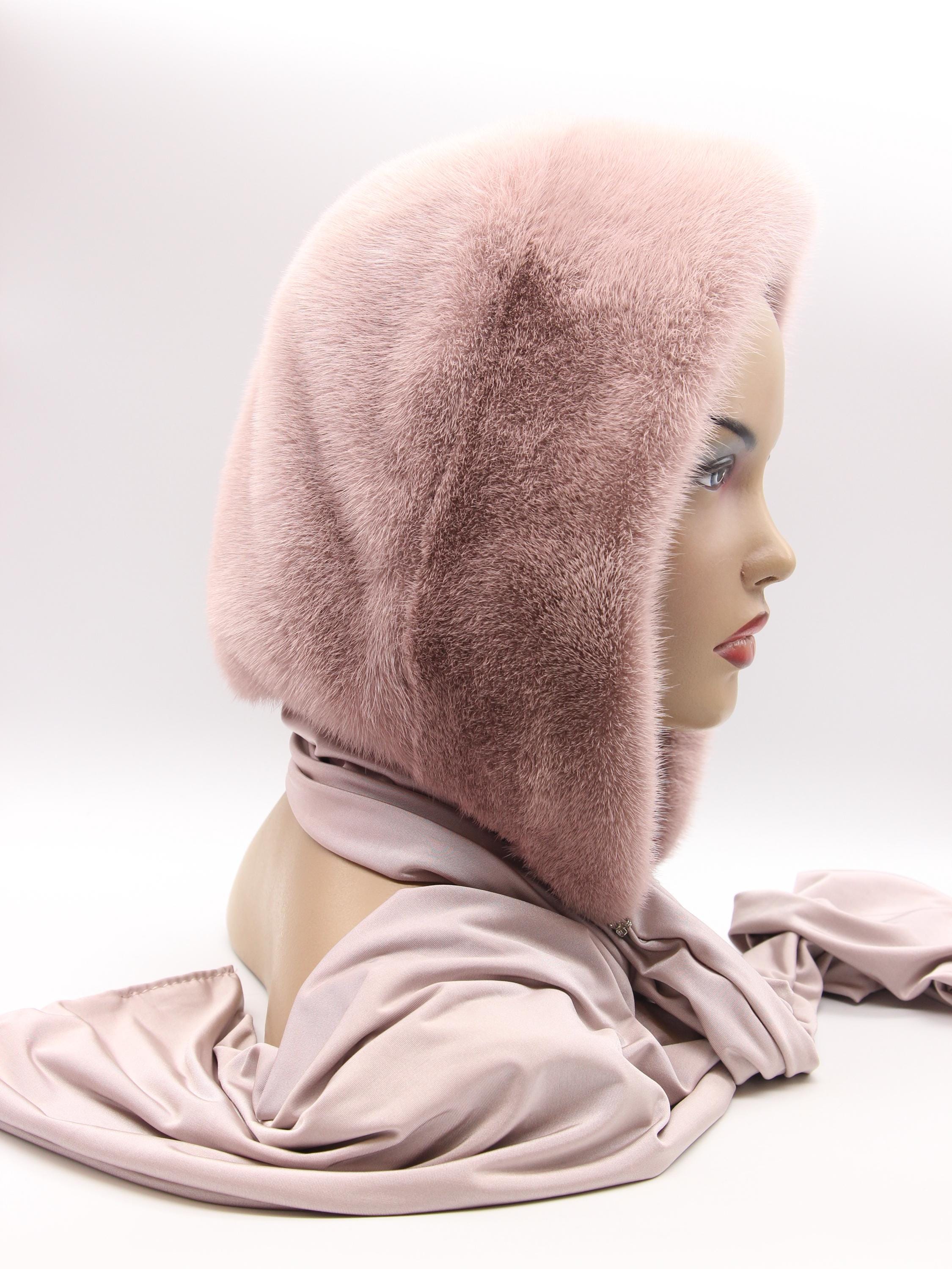 Powder Pink Mink Fur Hat Women Hooded Scarf Handmade Winter Hood Beige Lining Luxury Head Wrap