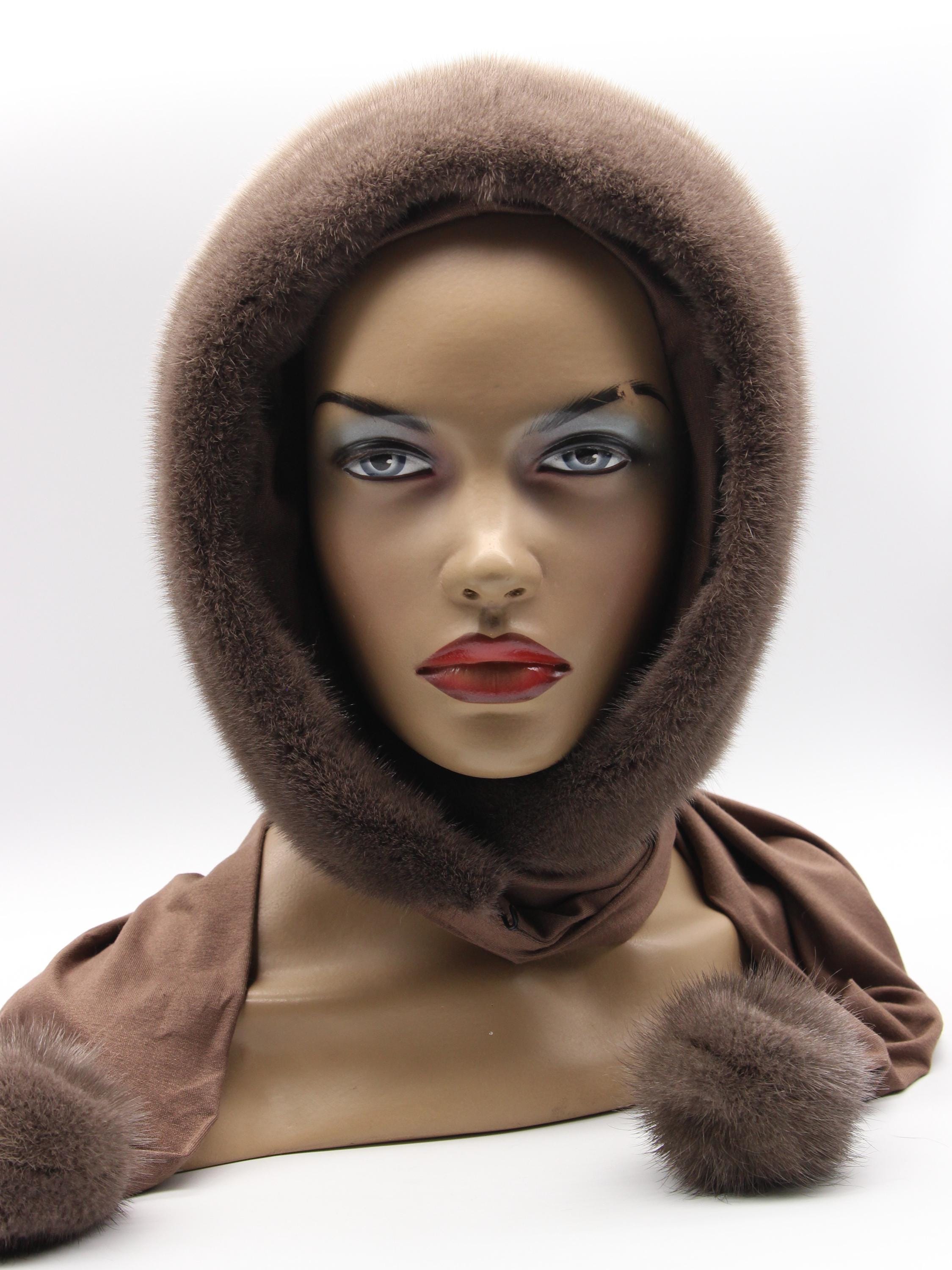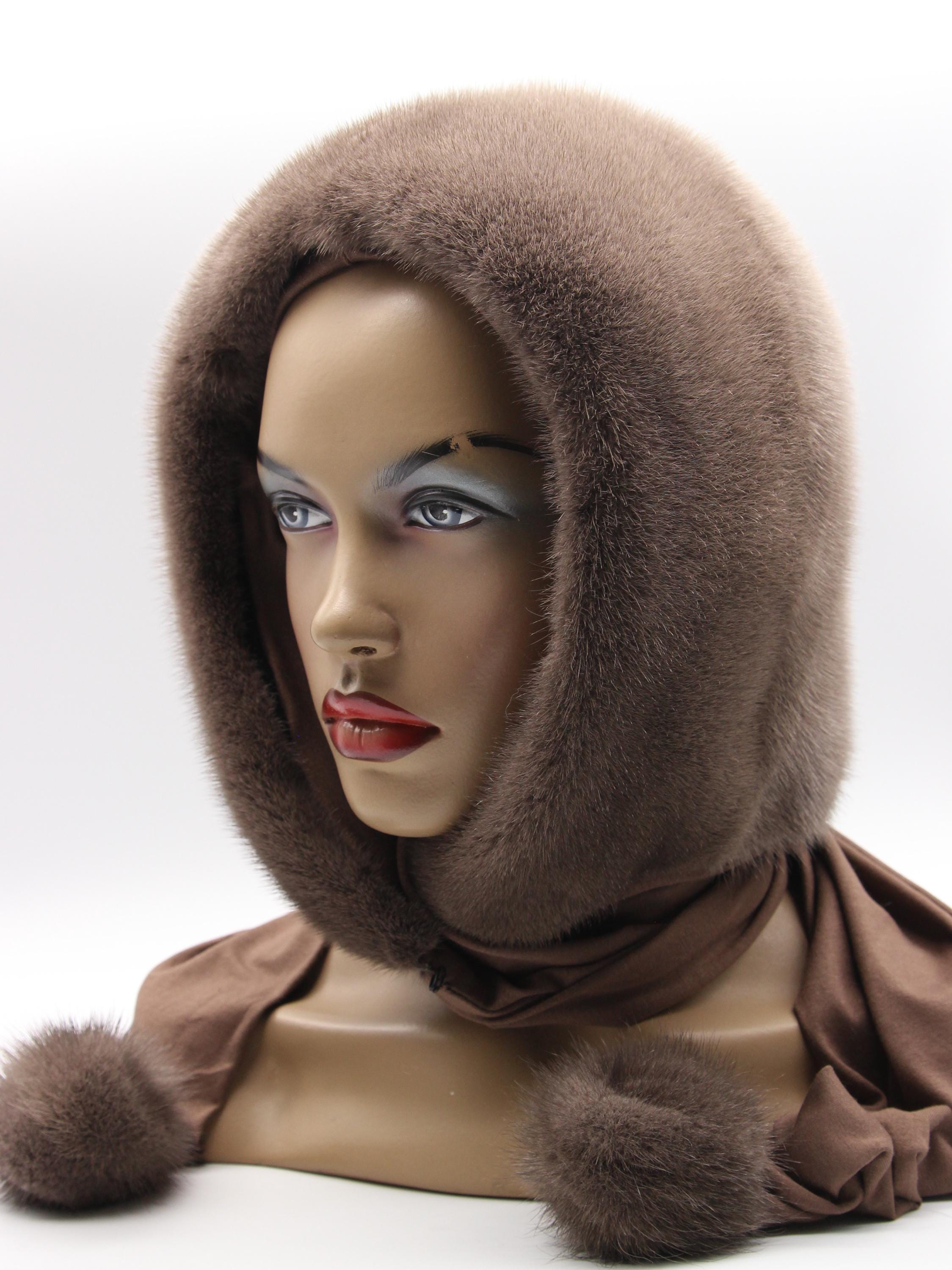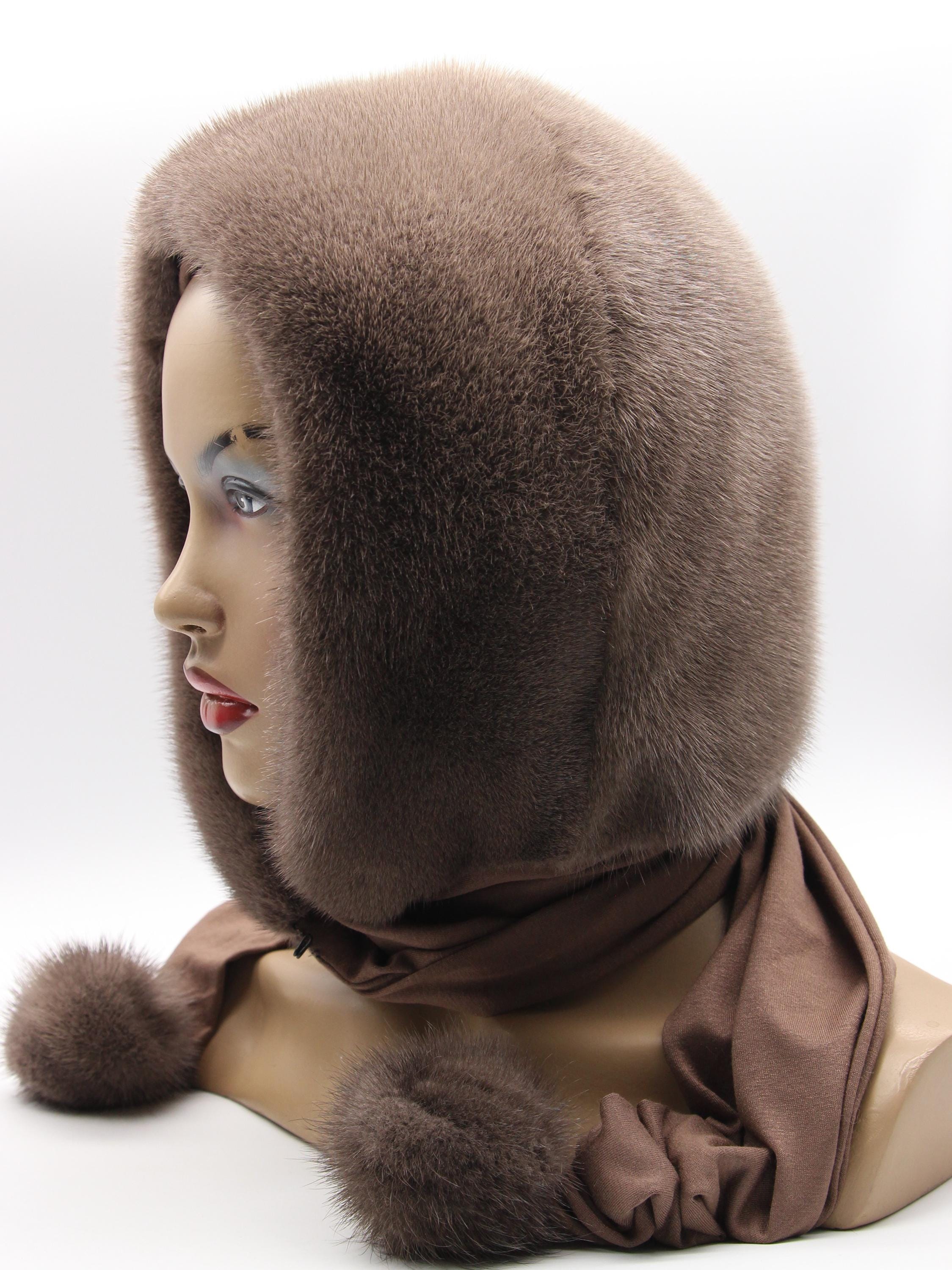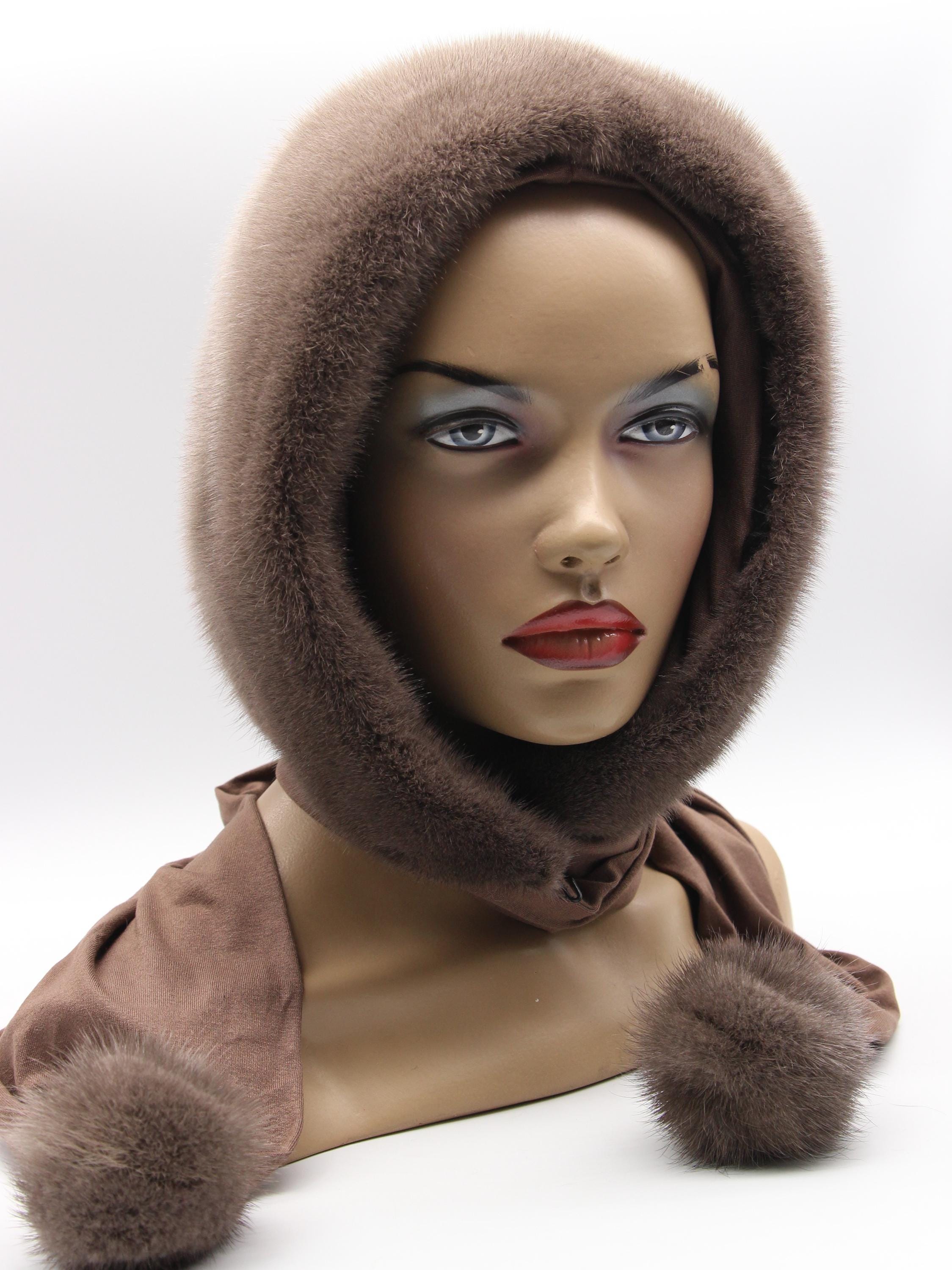 Cappuccino Mink Fur Hat Women Hooded Scarf Handmade Winter Hood Dyed Brown Beige Lining Luxury
