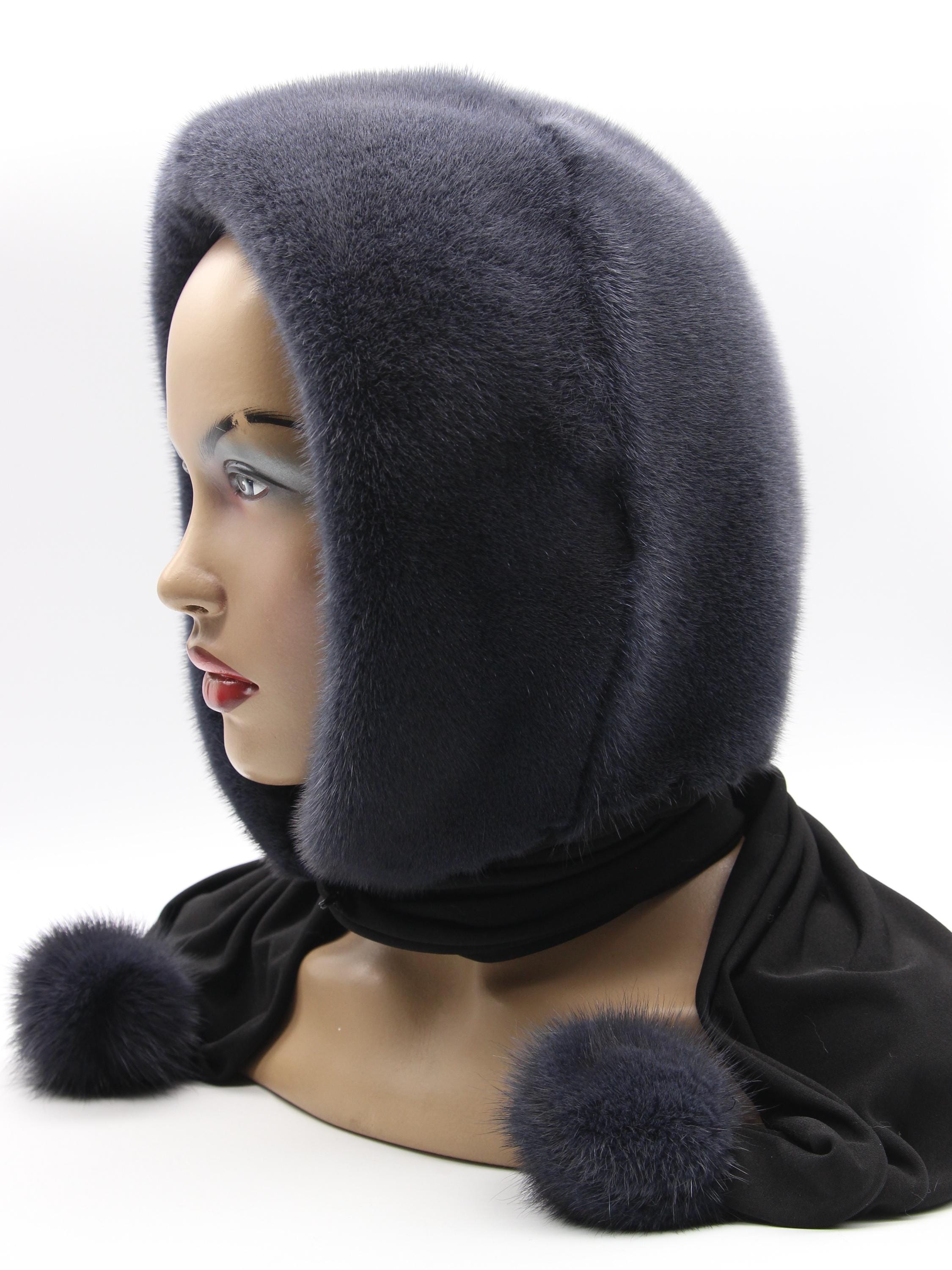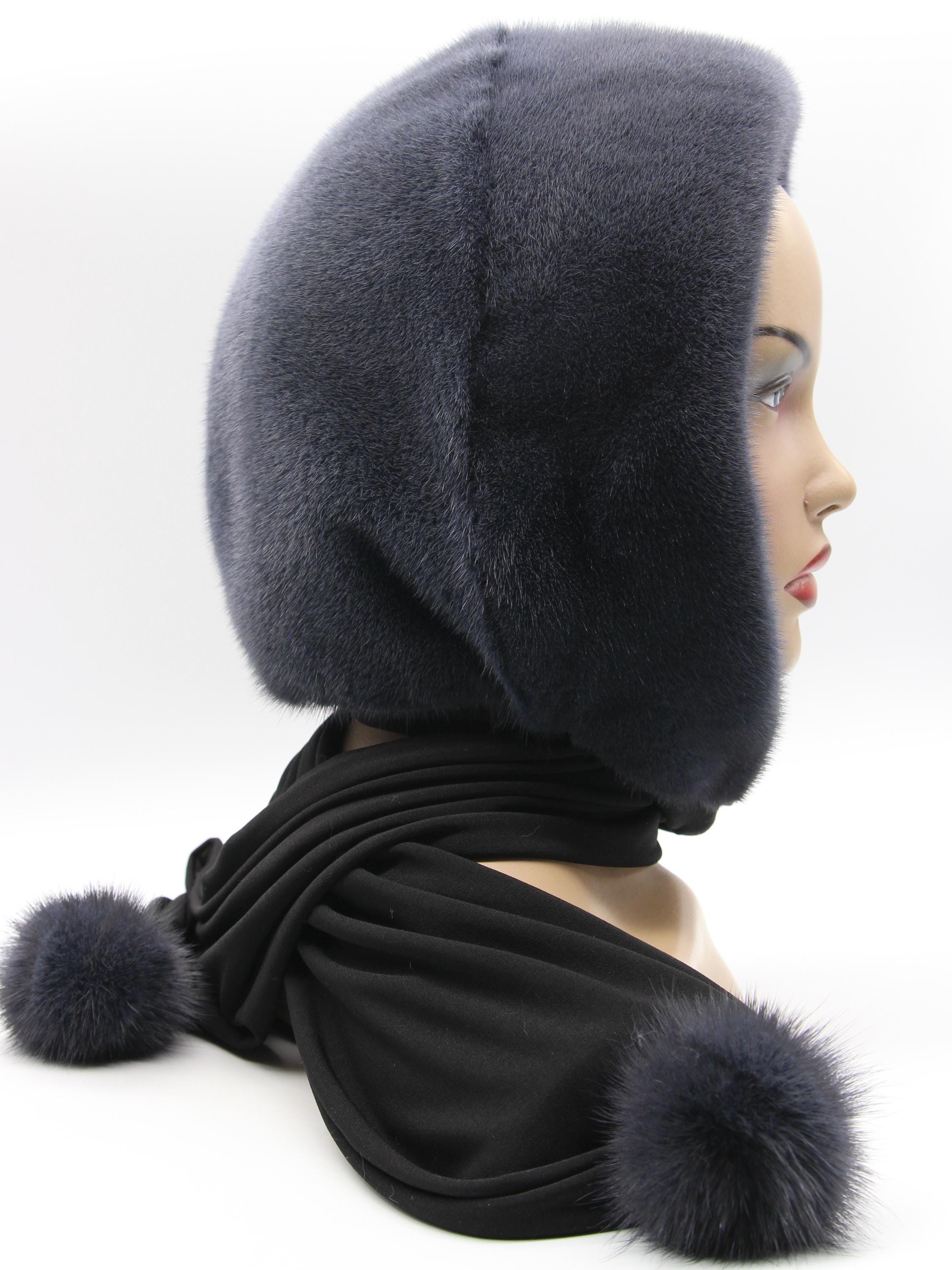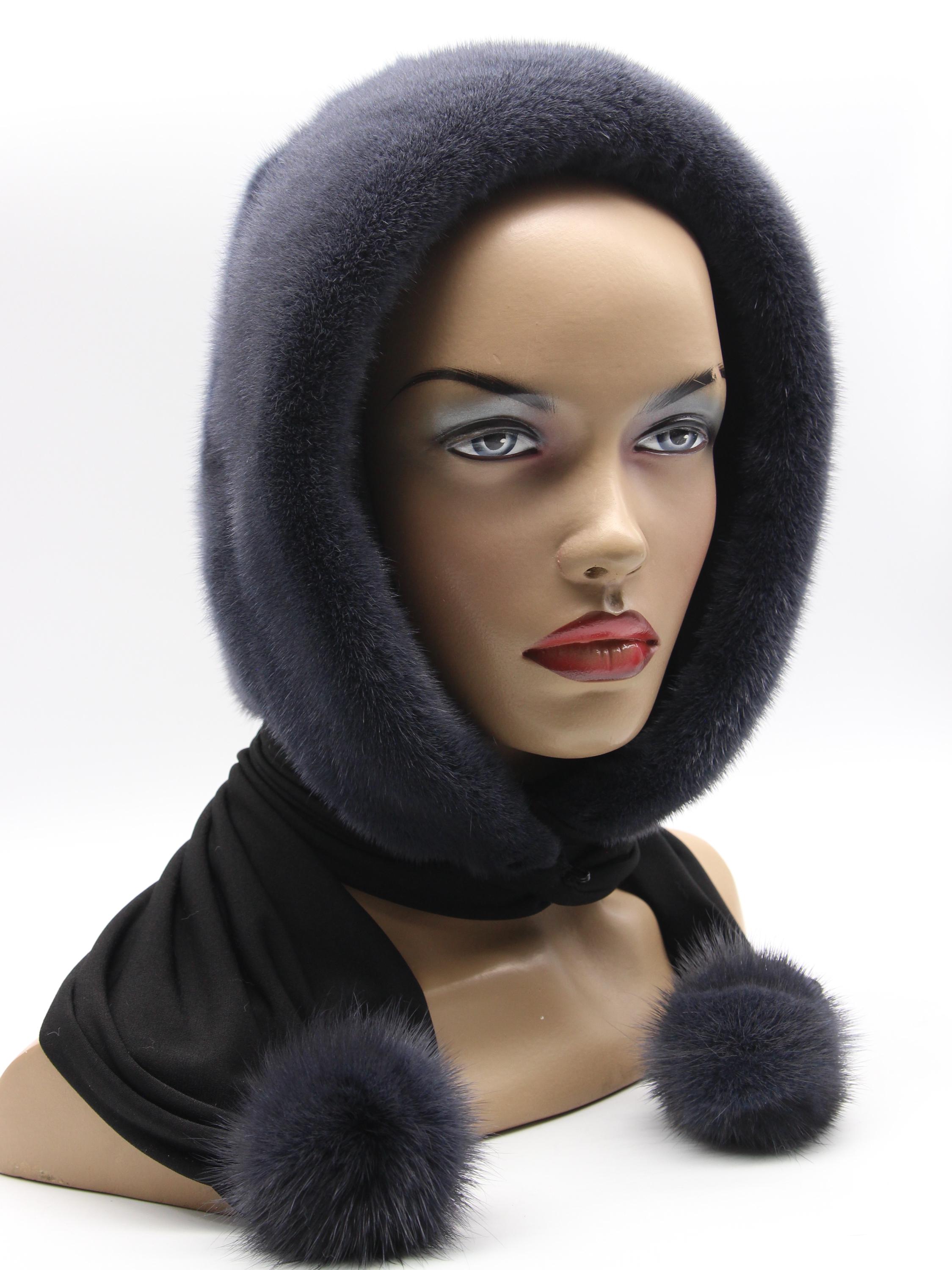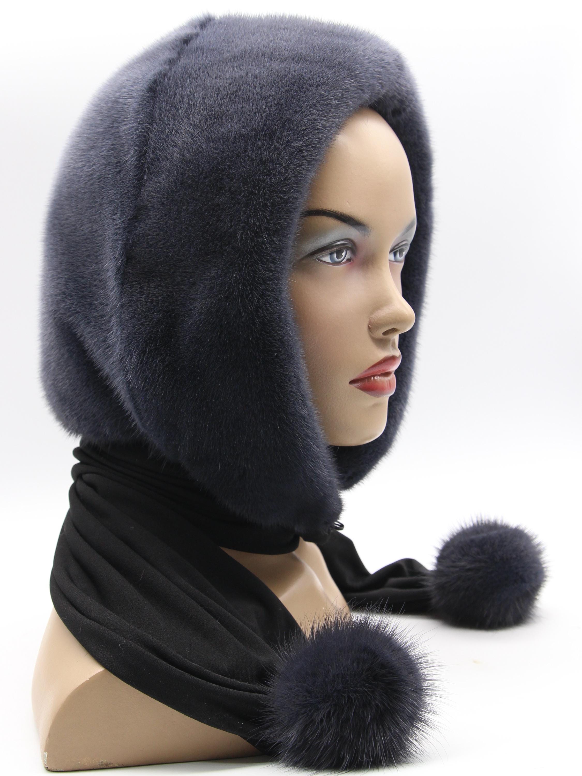 Graphite Mink Fur Hat Women Hooded Scarf: Deep Black Done Properly