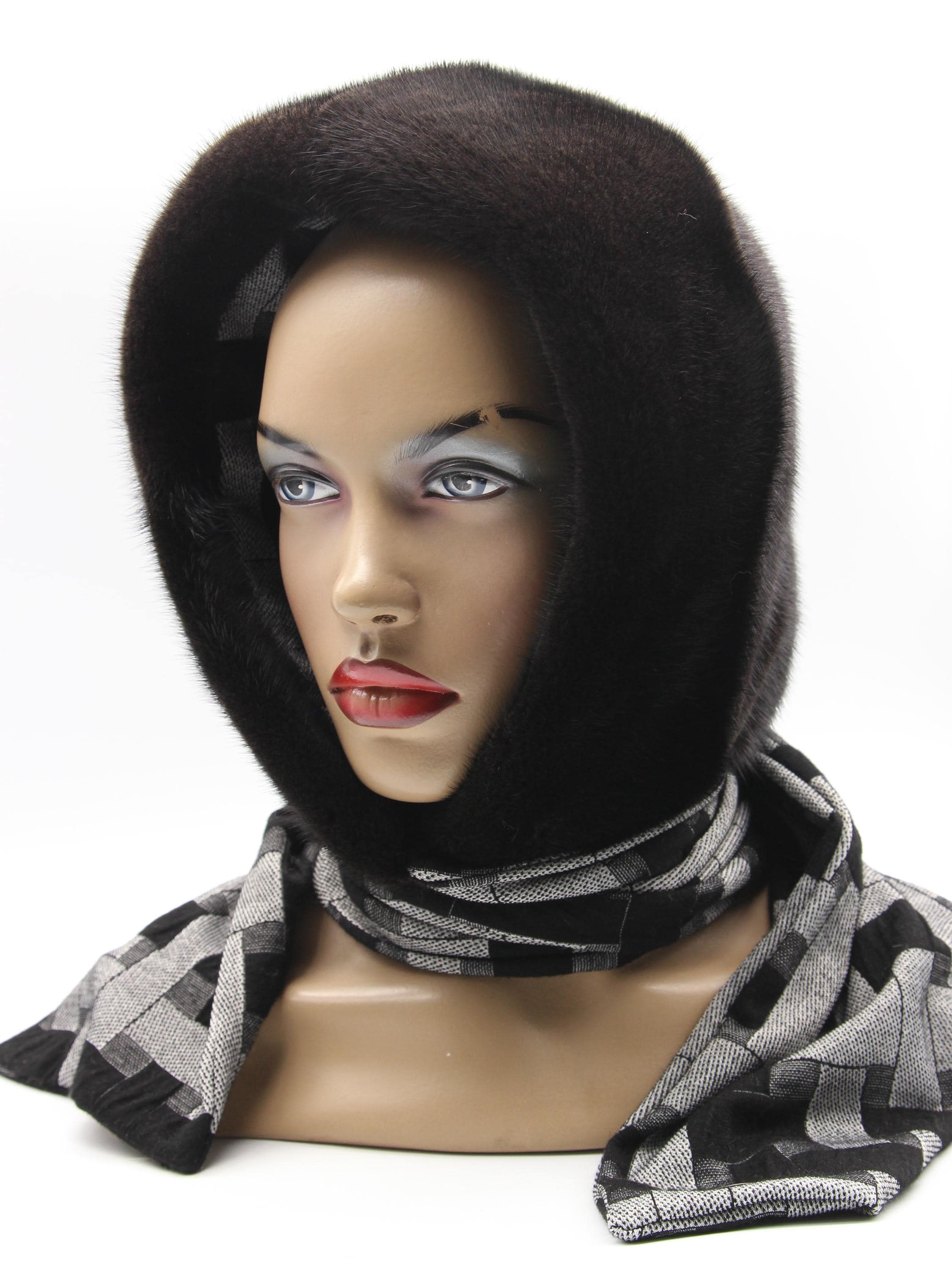Dark Brown Mink Fur Hat Women Hooded Scarf Handmade Winter Hood Gray Plaid Lining Luxury