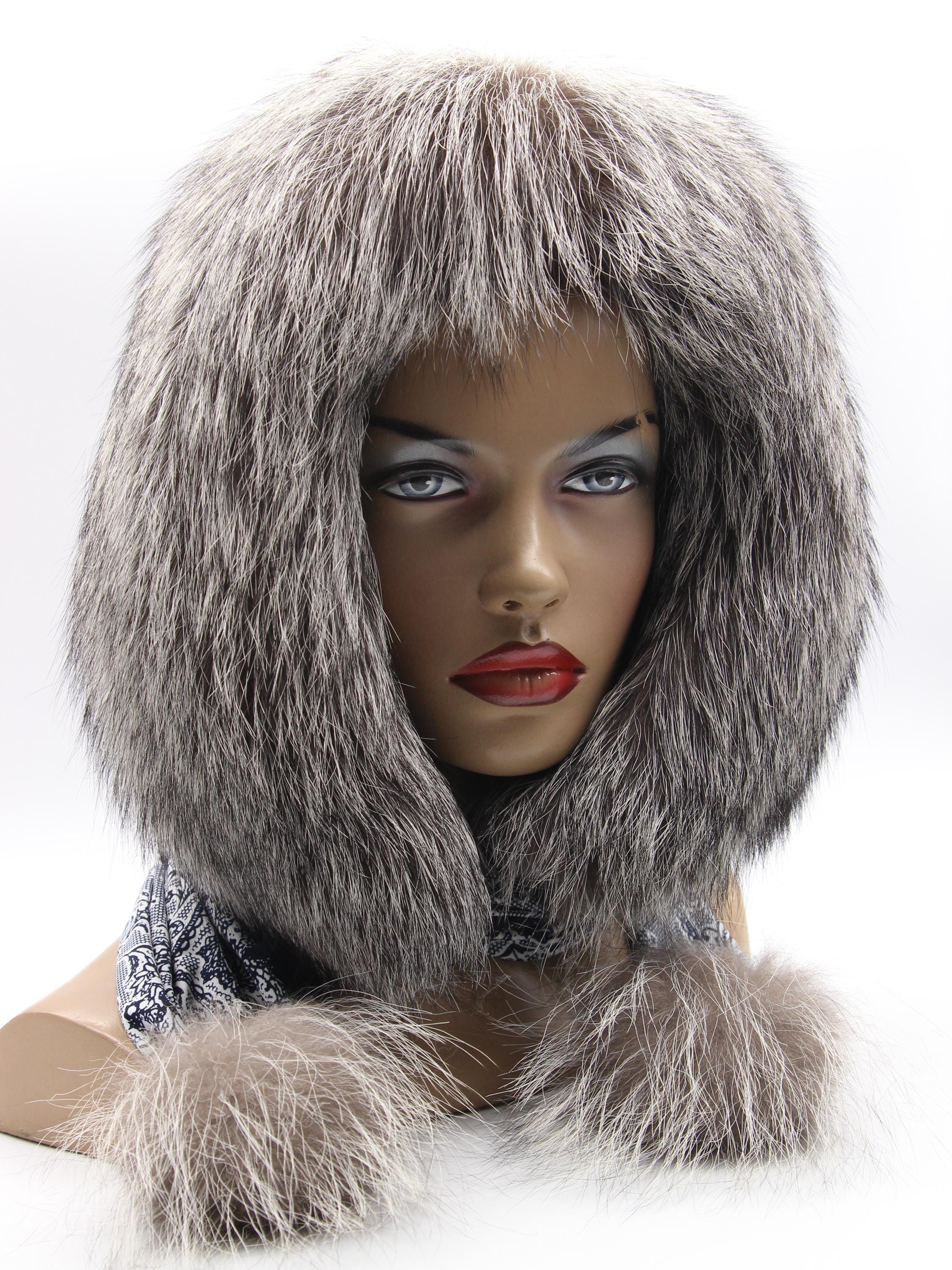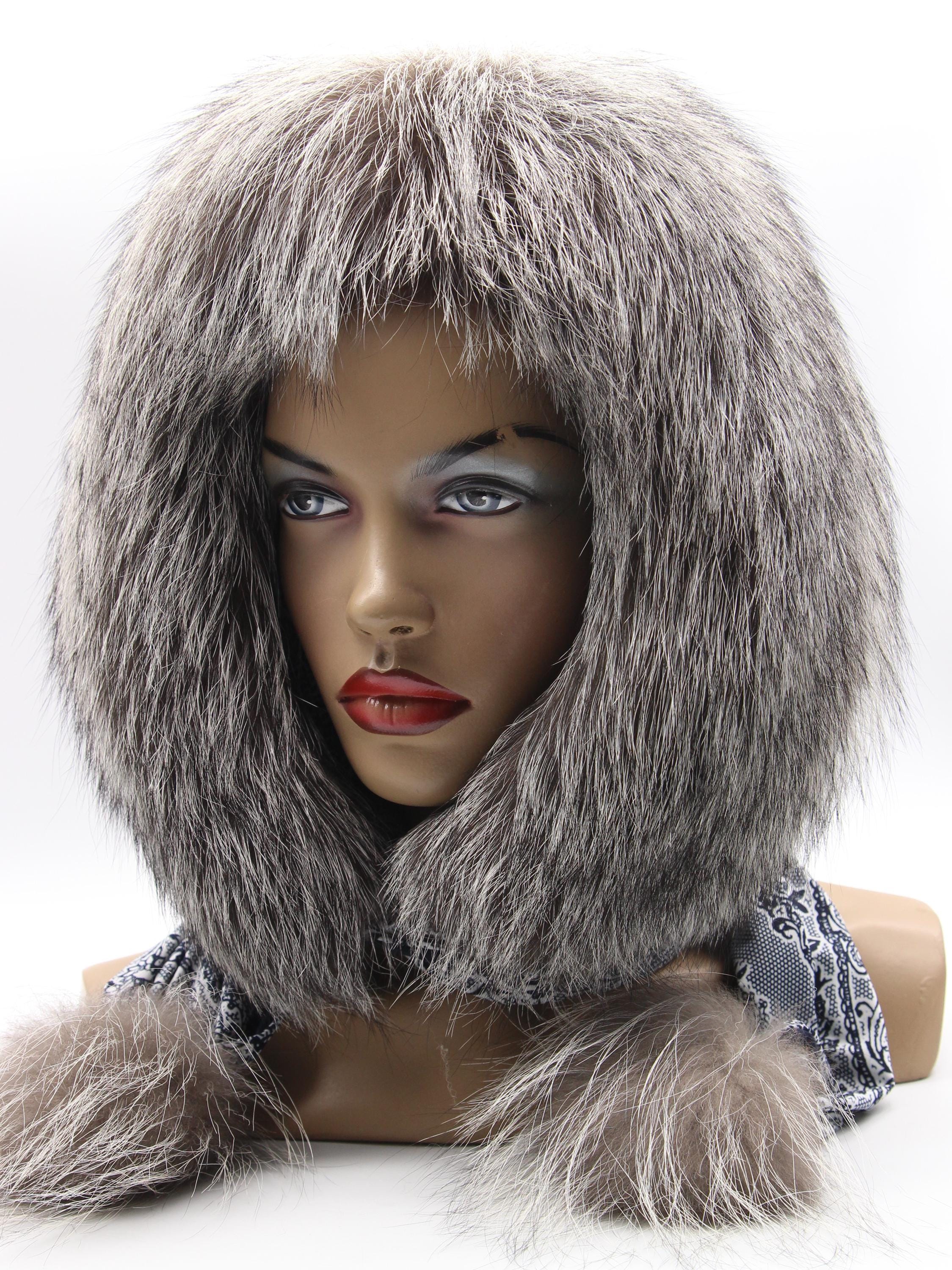 Silver Fox Sapphire Mink Fur Hat Women Hooded Scarf Handmade Winter Hood Natural Undyed Luxury