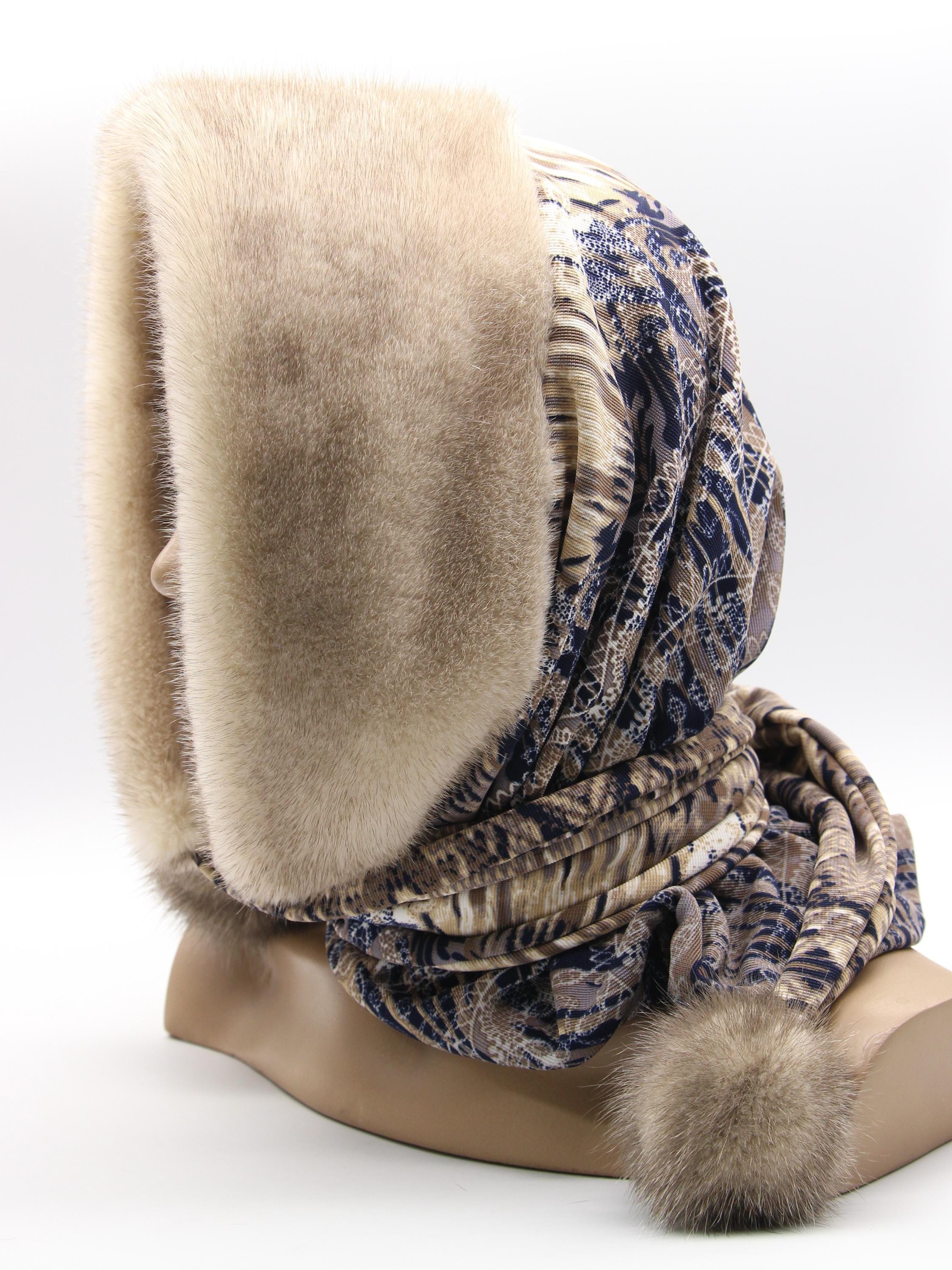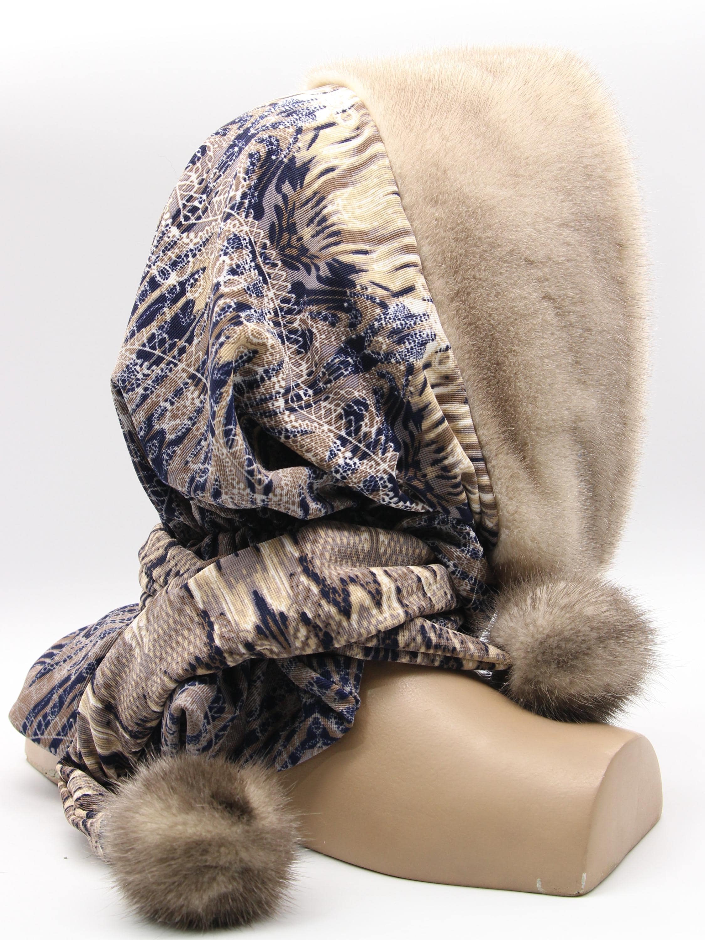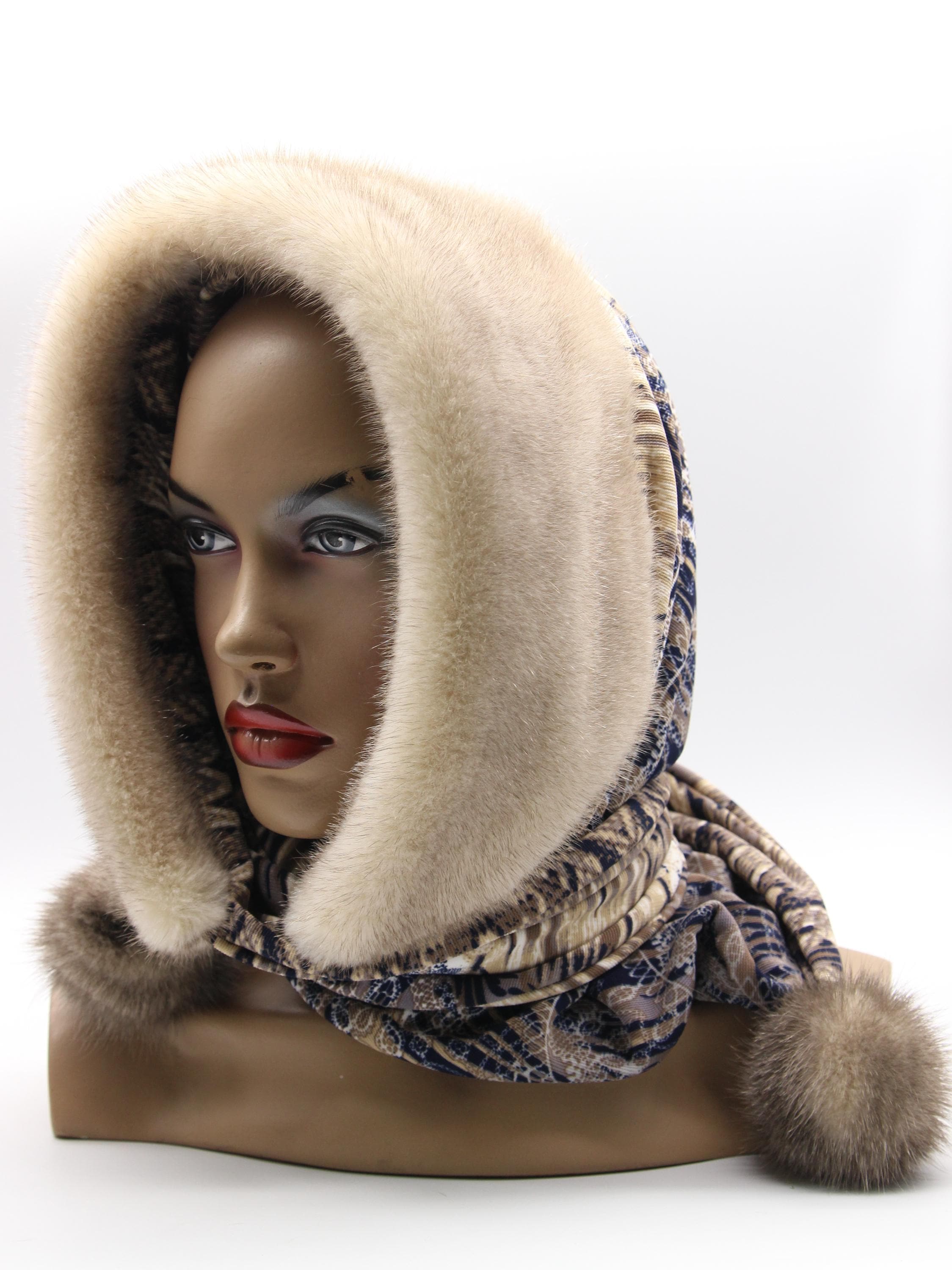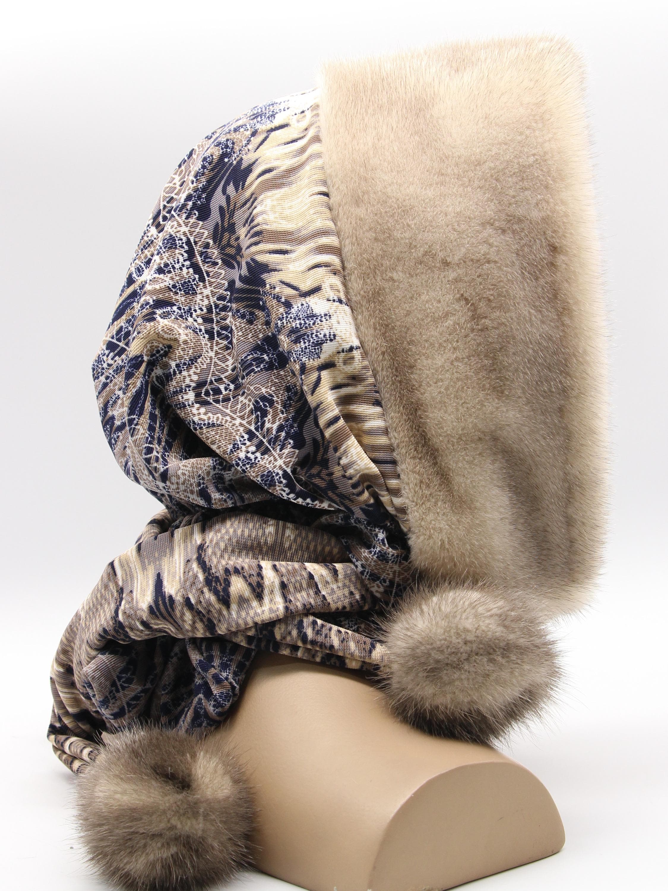 Message from Chicago arrives early December. Woman explaining she's exhausted by all-black winter wardrobe but nervous about adding color. Asks if natural beige mink fur on this hooded scarf really works as neutral. More versatile than black actually, I tell her - beige mink warms up your face, goes with everything. This fur stole pairs patterned knit base with natural beige mink trim. Orders it somewhat doubtfully, writes enthusiastic message later - wore it to work meeting, client lunch, grocery run all same day, looked appropriate for everything, got complimented three separate times.