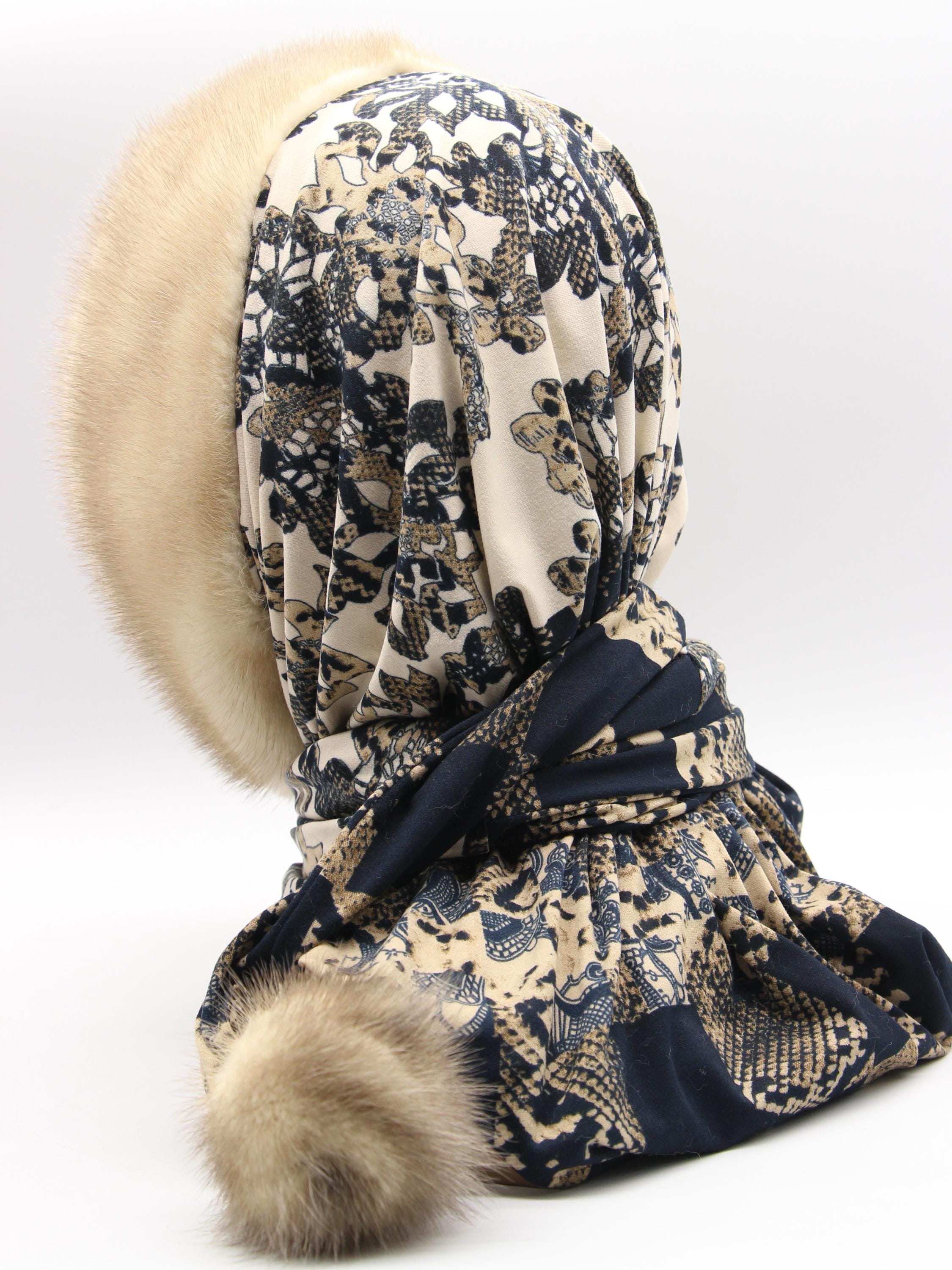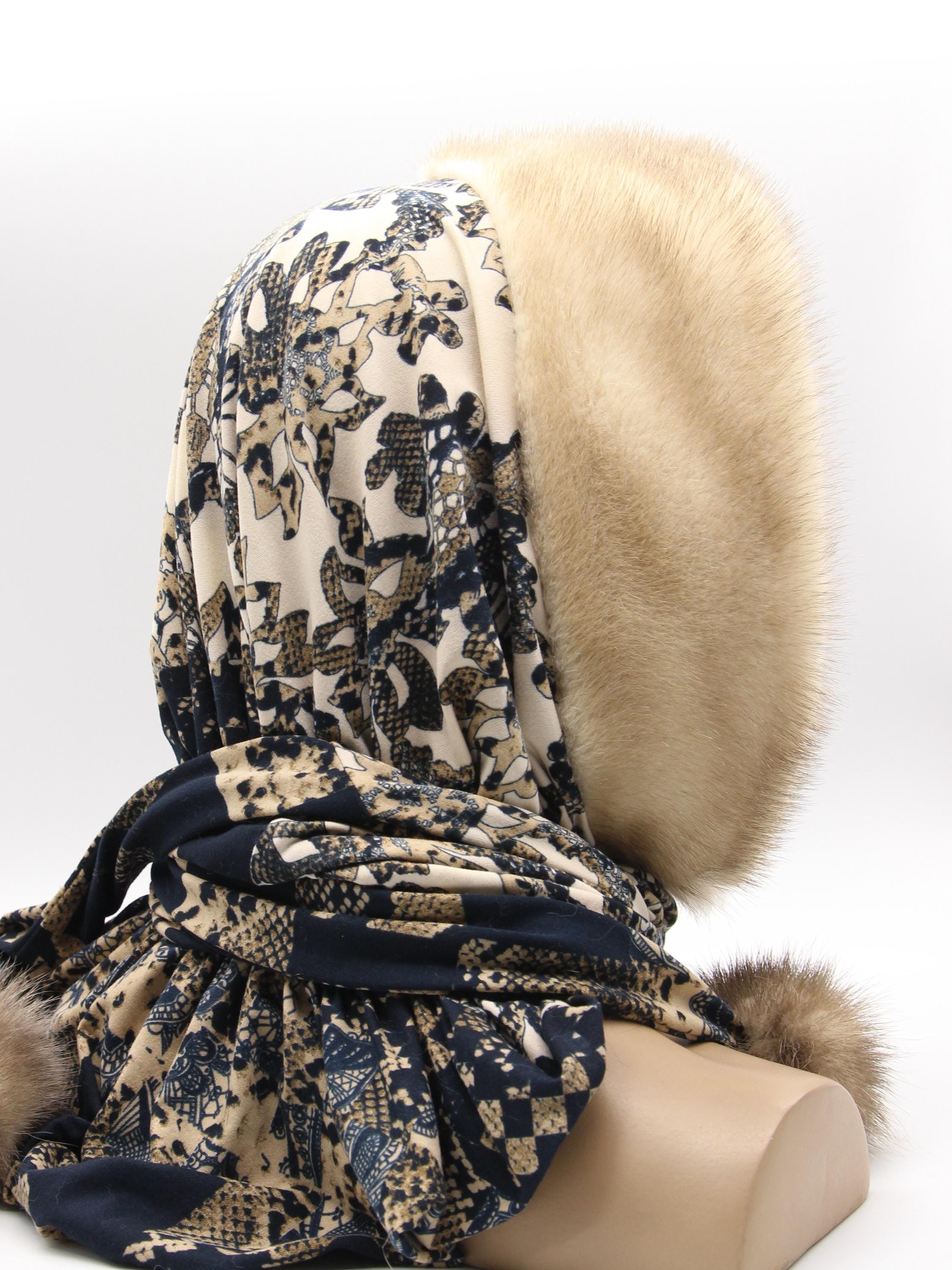 Beige Mink Fur Hooded Scarf Ornate Pattern - Handmade Classic Neutral Winter Hood Wrap Women