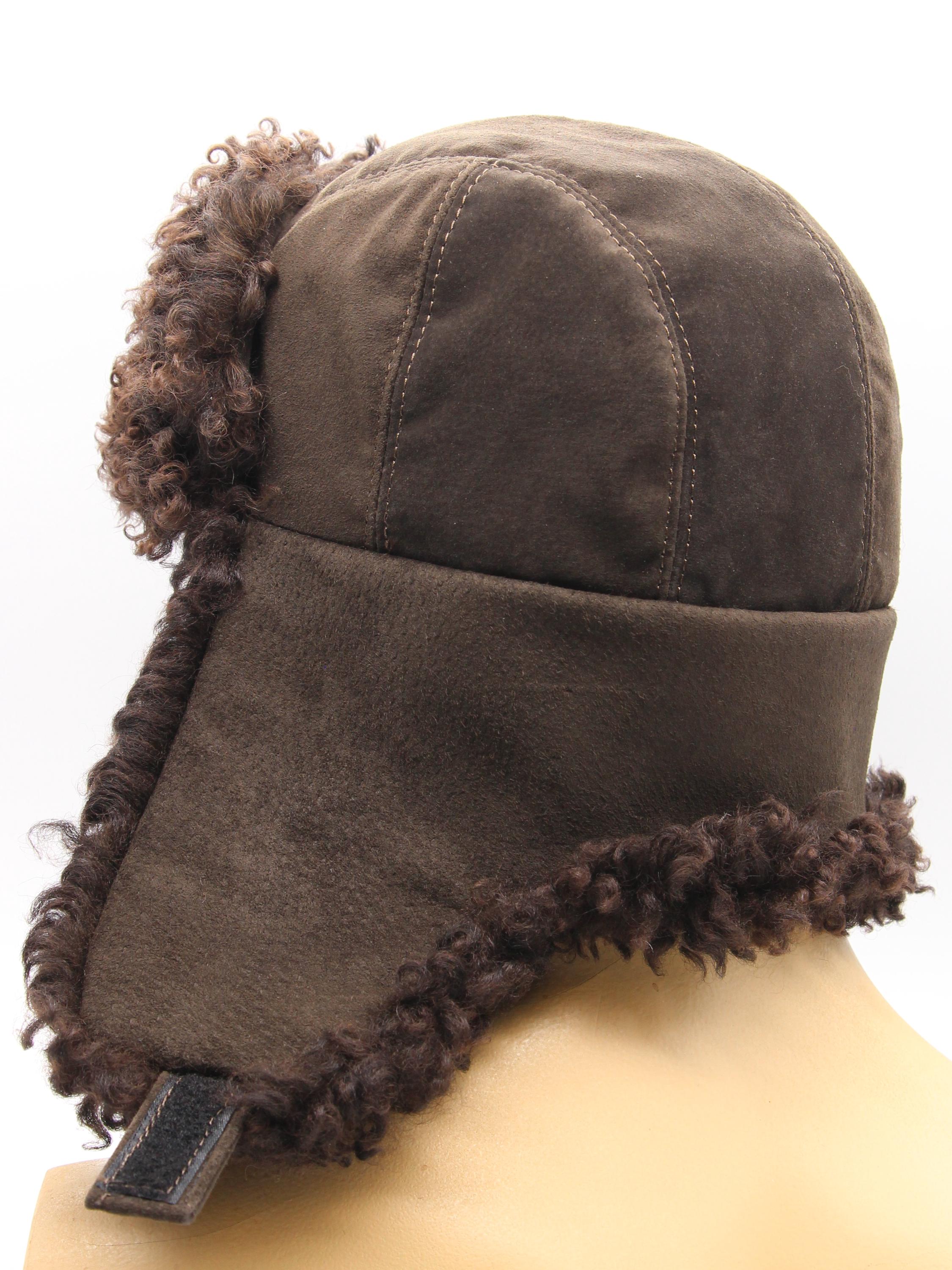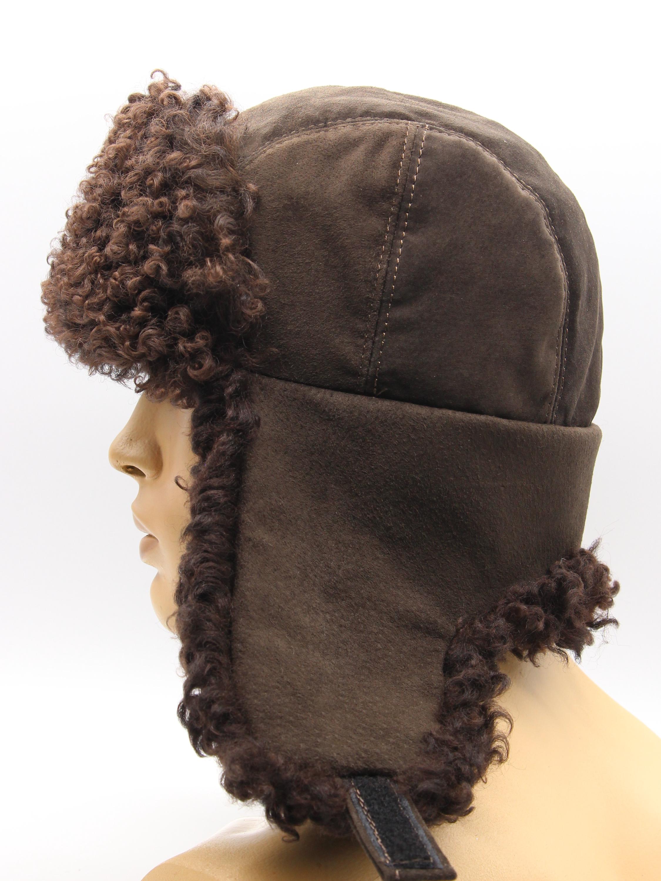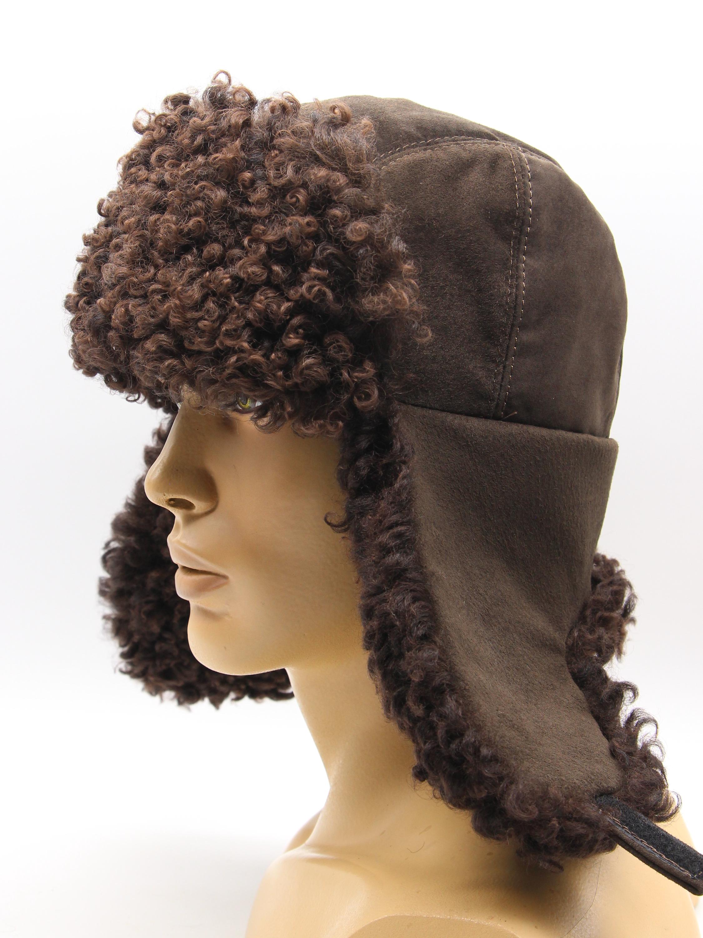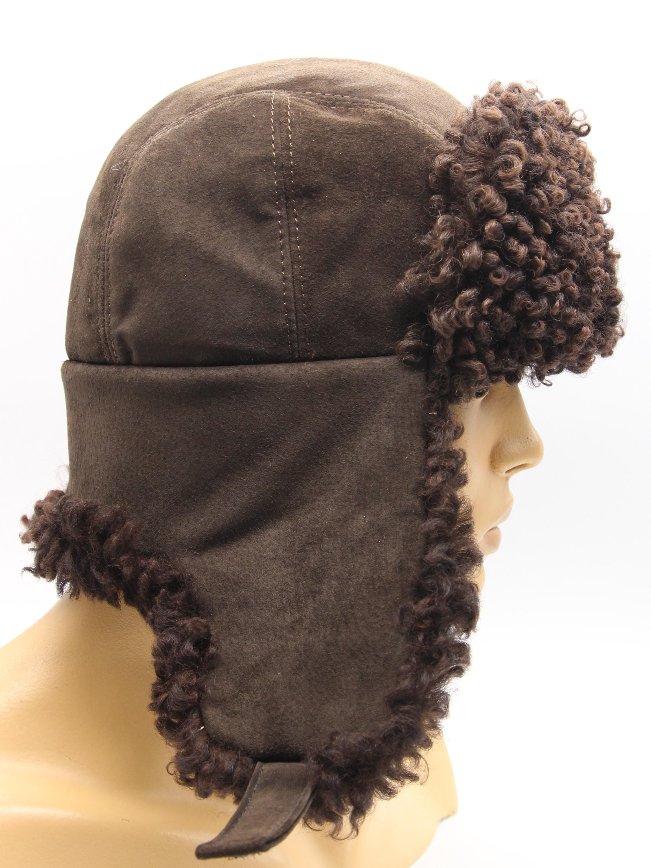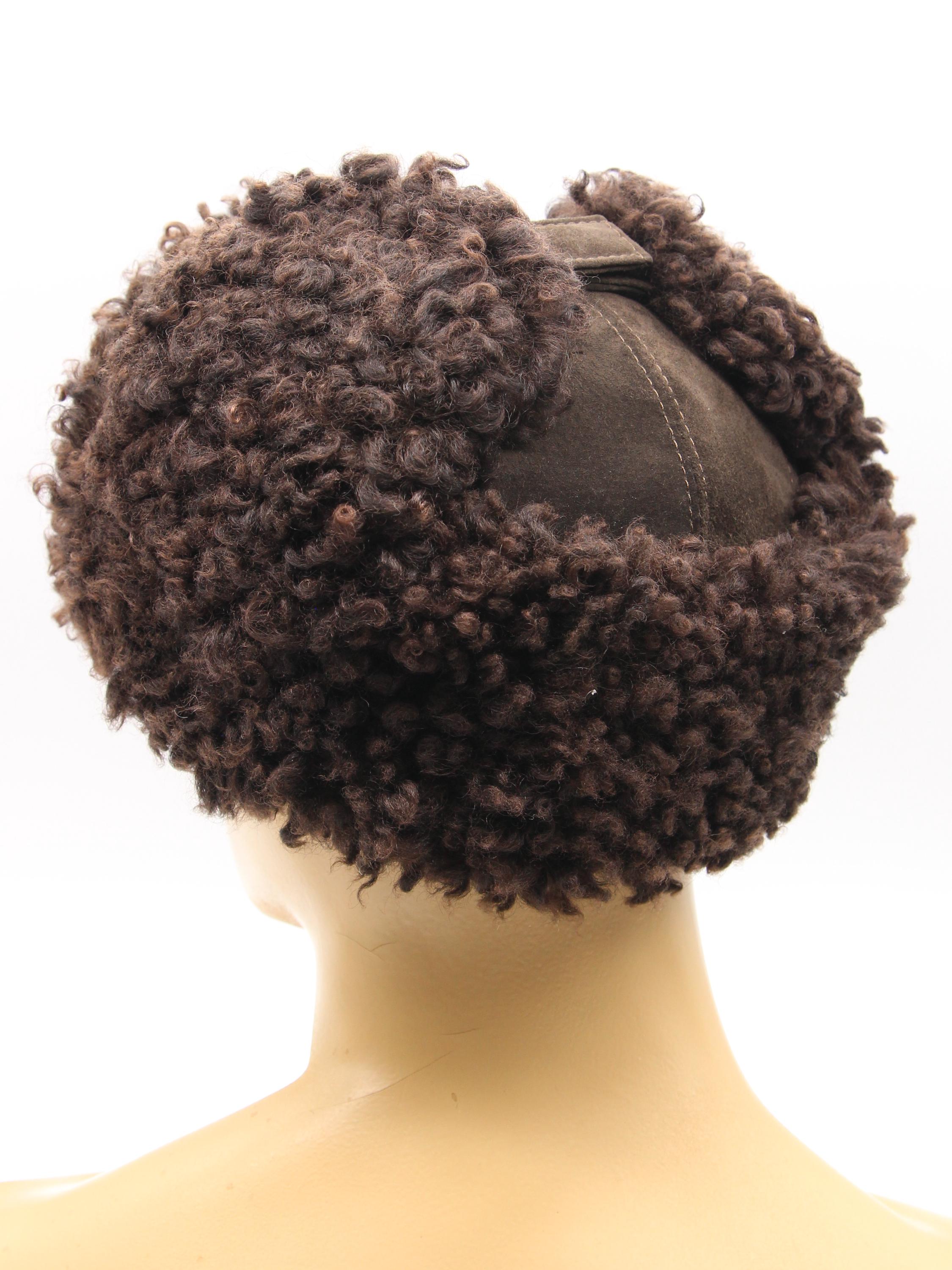 Construction differs other models. Karakul covers forehead ears back sections brown suede handles crown. Earflaps lower suede visible two-tone appearance. Wear down or fastened back weather styling preference.