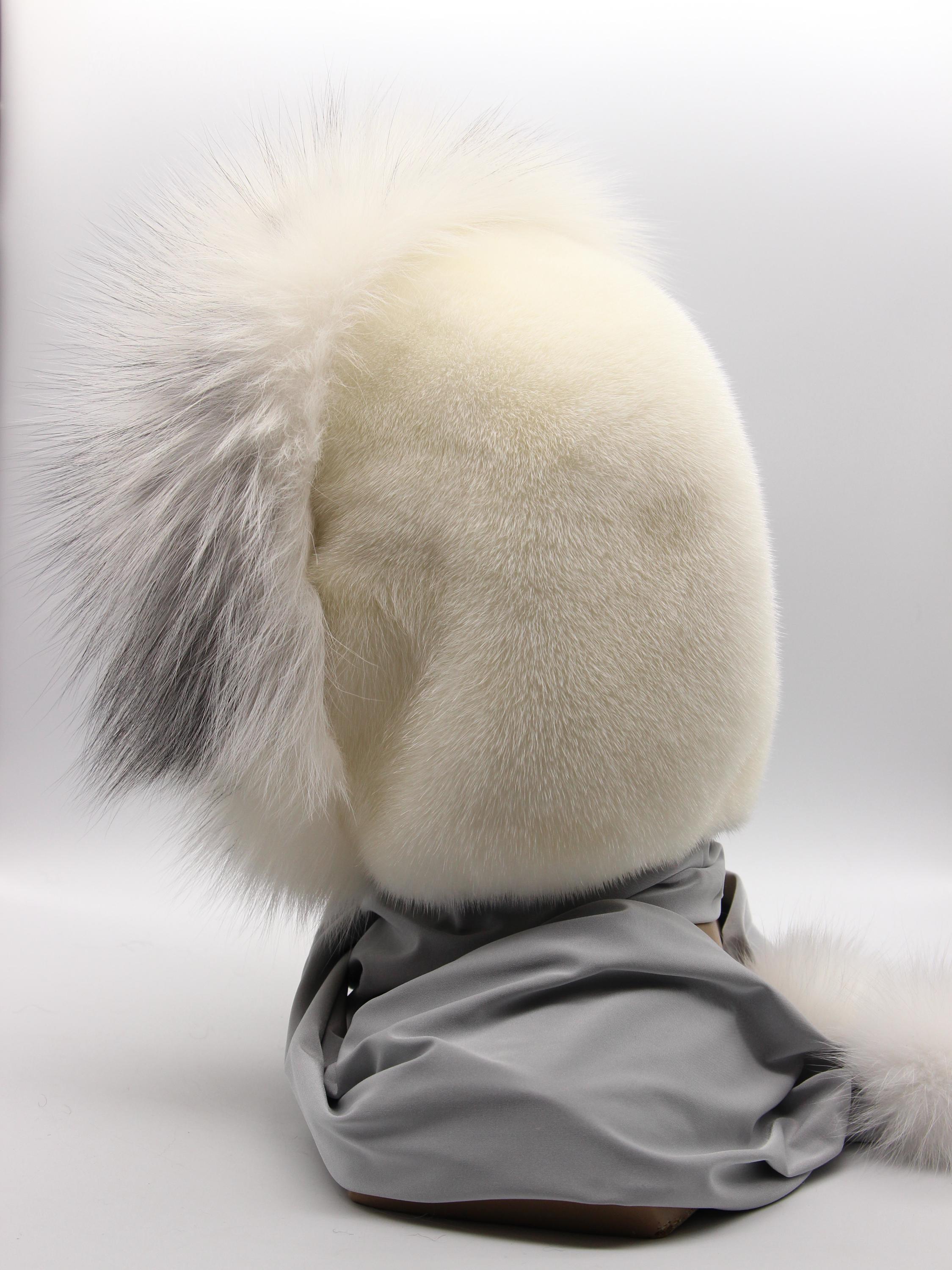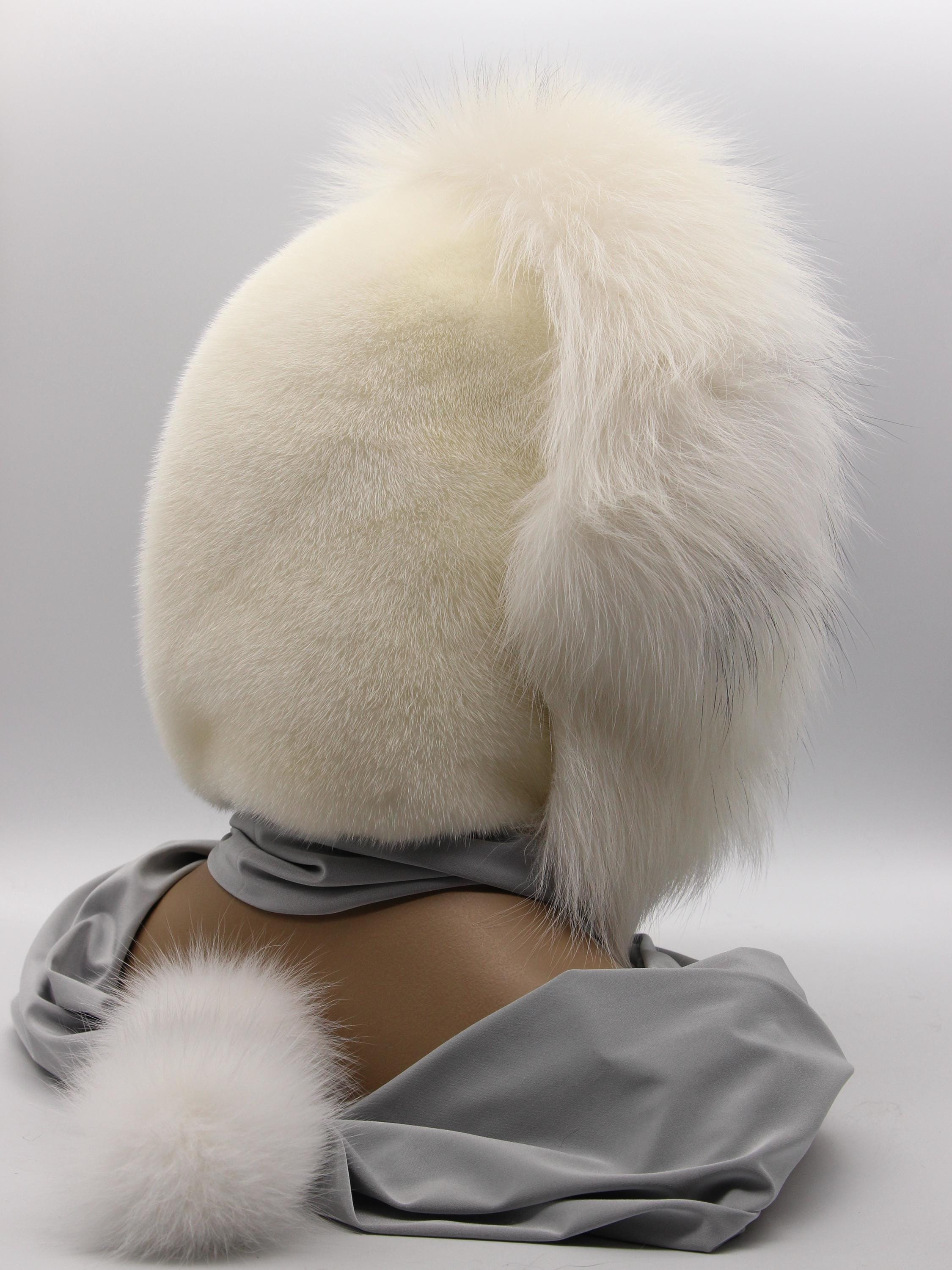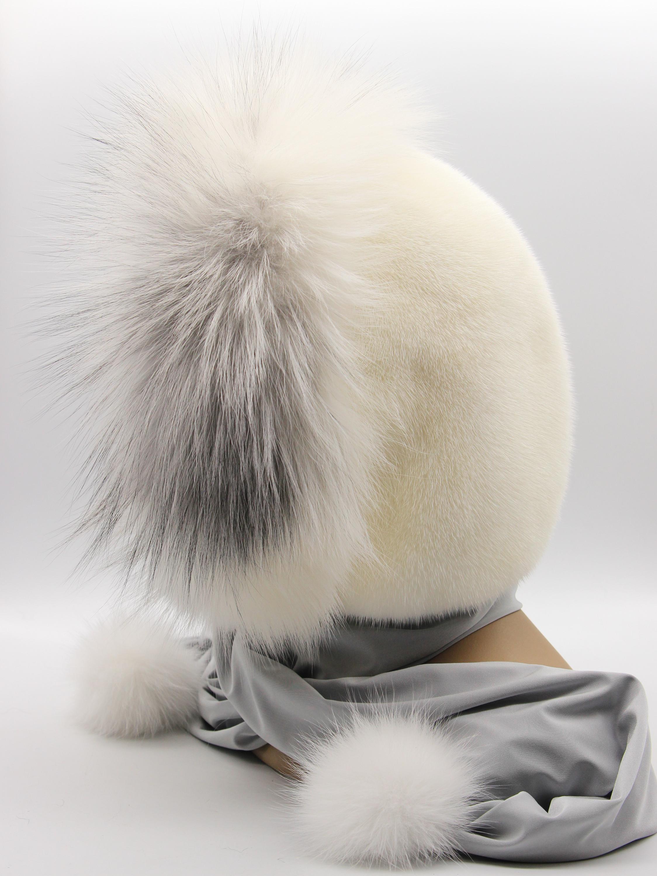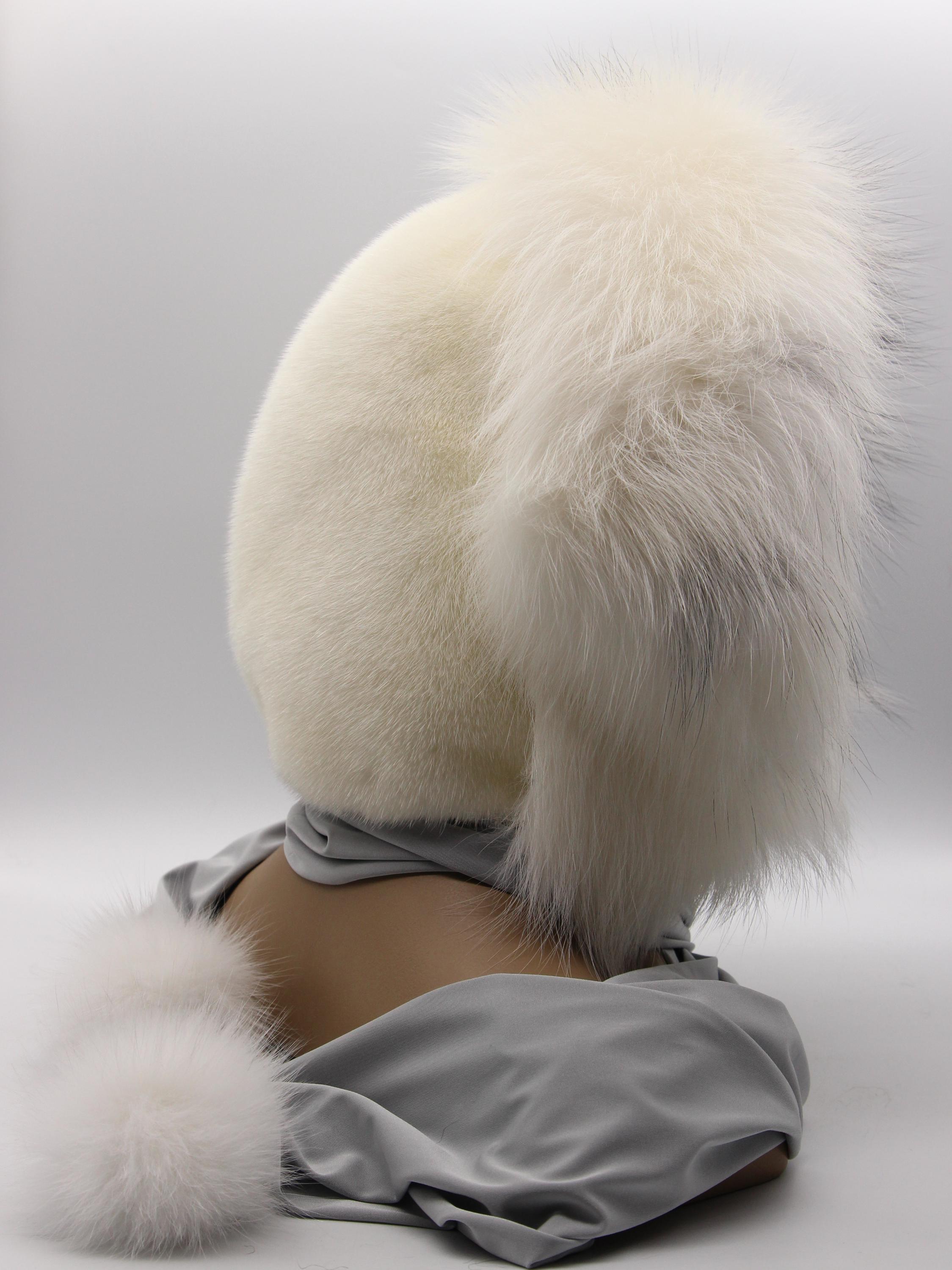 At minus fifteen, arctic fox face frame blocks direct wind while mink crown covers back of head properly. Scarf ends wrap neck or hang loose. Pom poms at tips finishing entire construction elegantly.