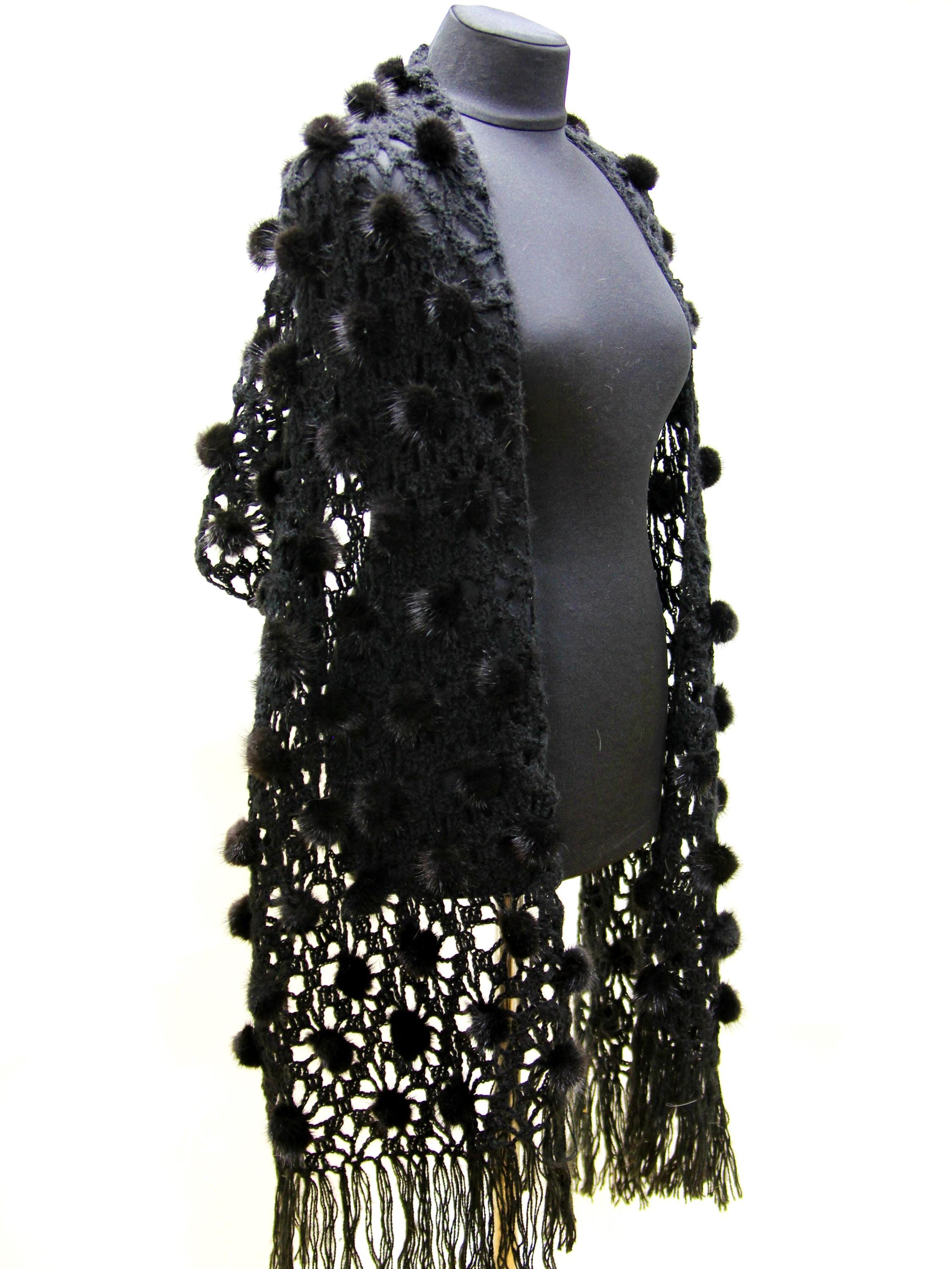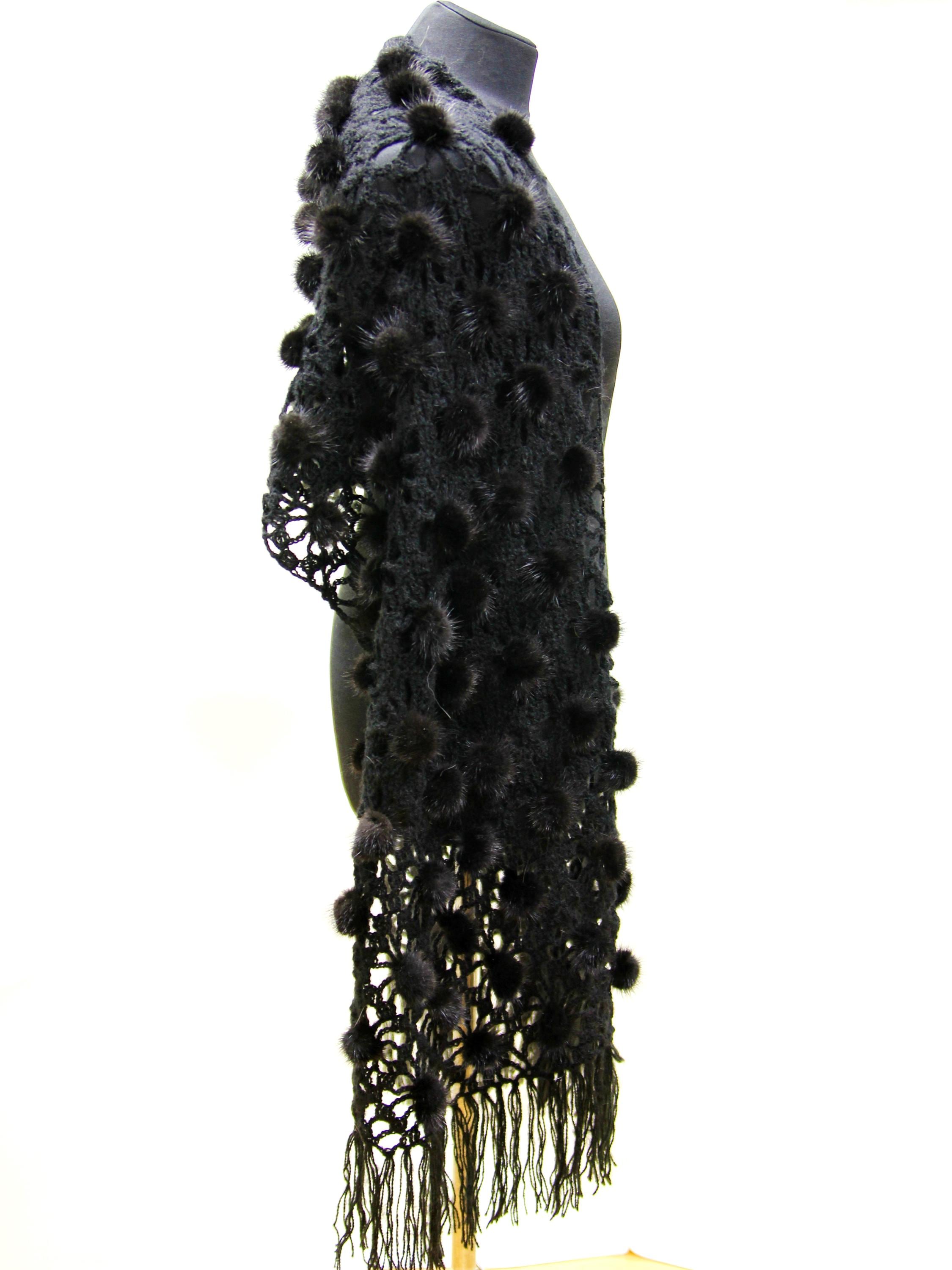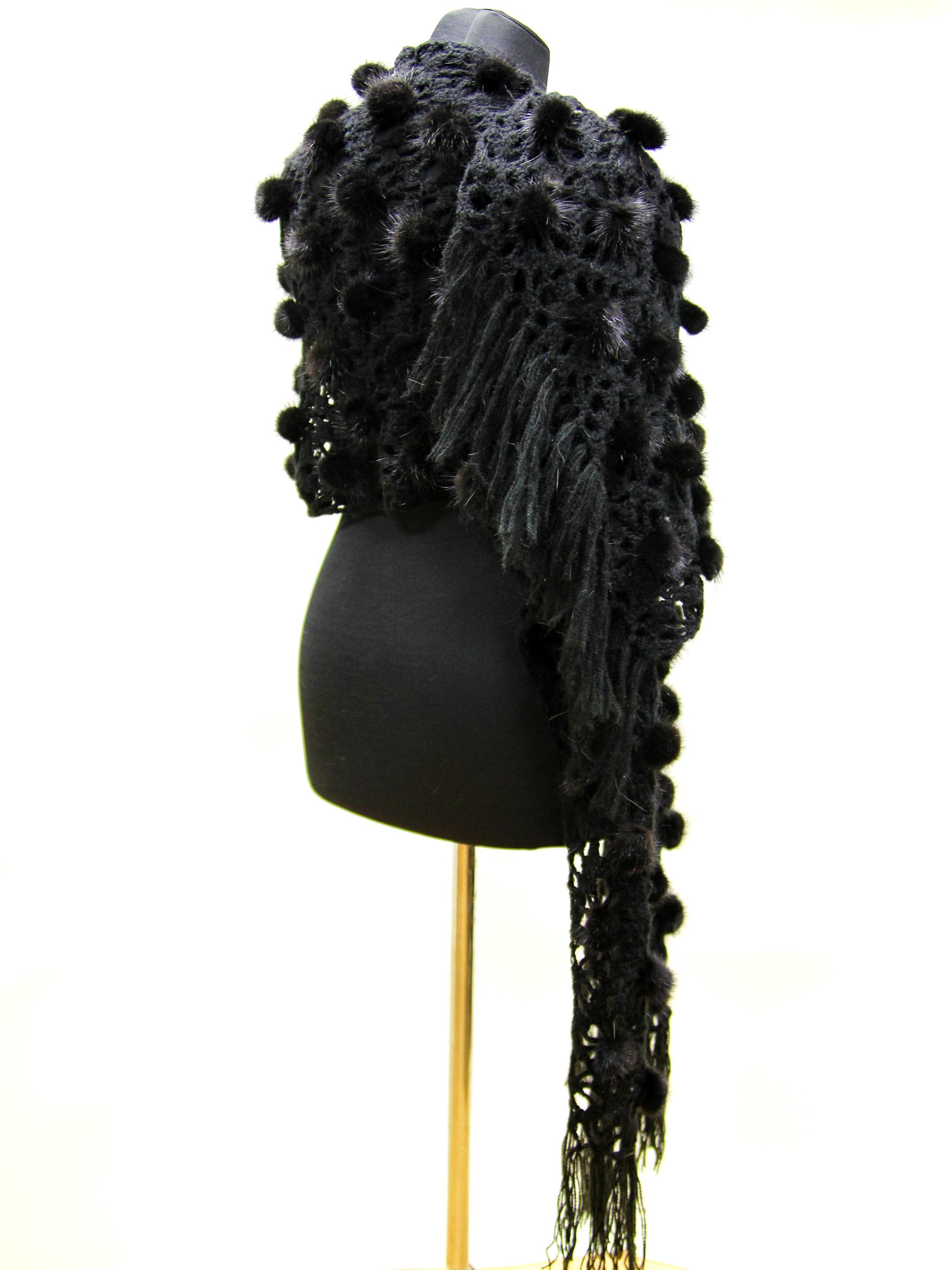The construction is what sets it apart. A natural wool mesh base — open weave, light, breathable. Onto that base, individual black mink fur pieces and pompons hand-sewn one by one across the surface. This fur shawl moves differently than a solid fur piece. It drapes, it shifts, it catches light. Nothing about it reads heavy or bulky.