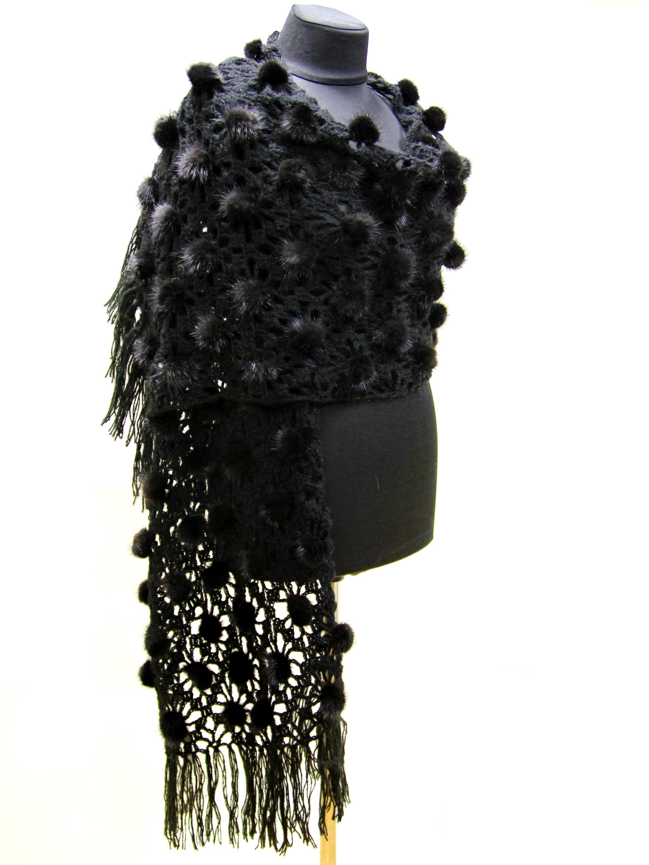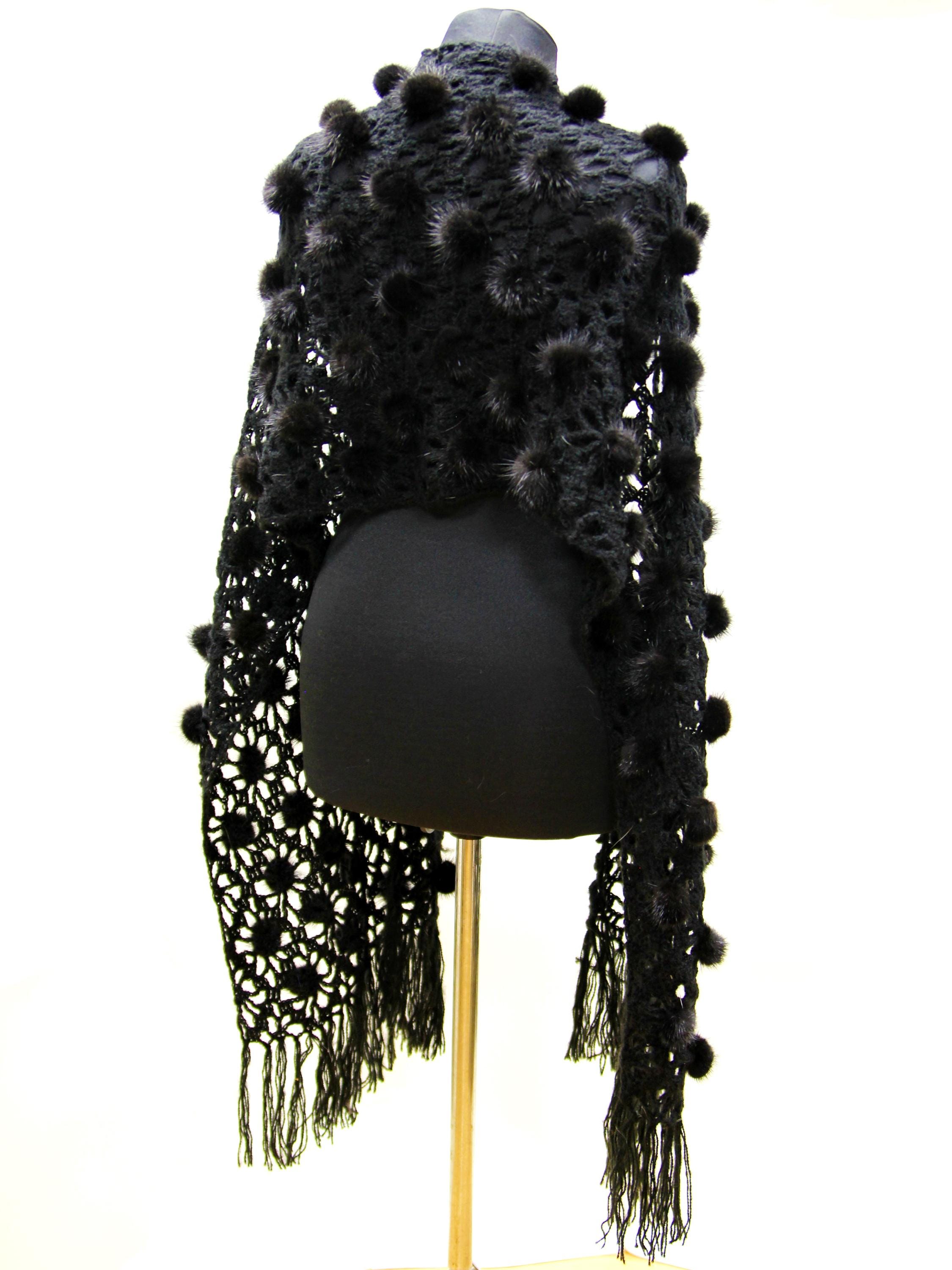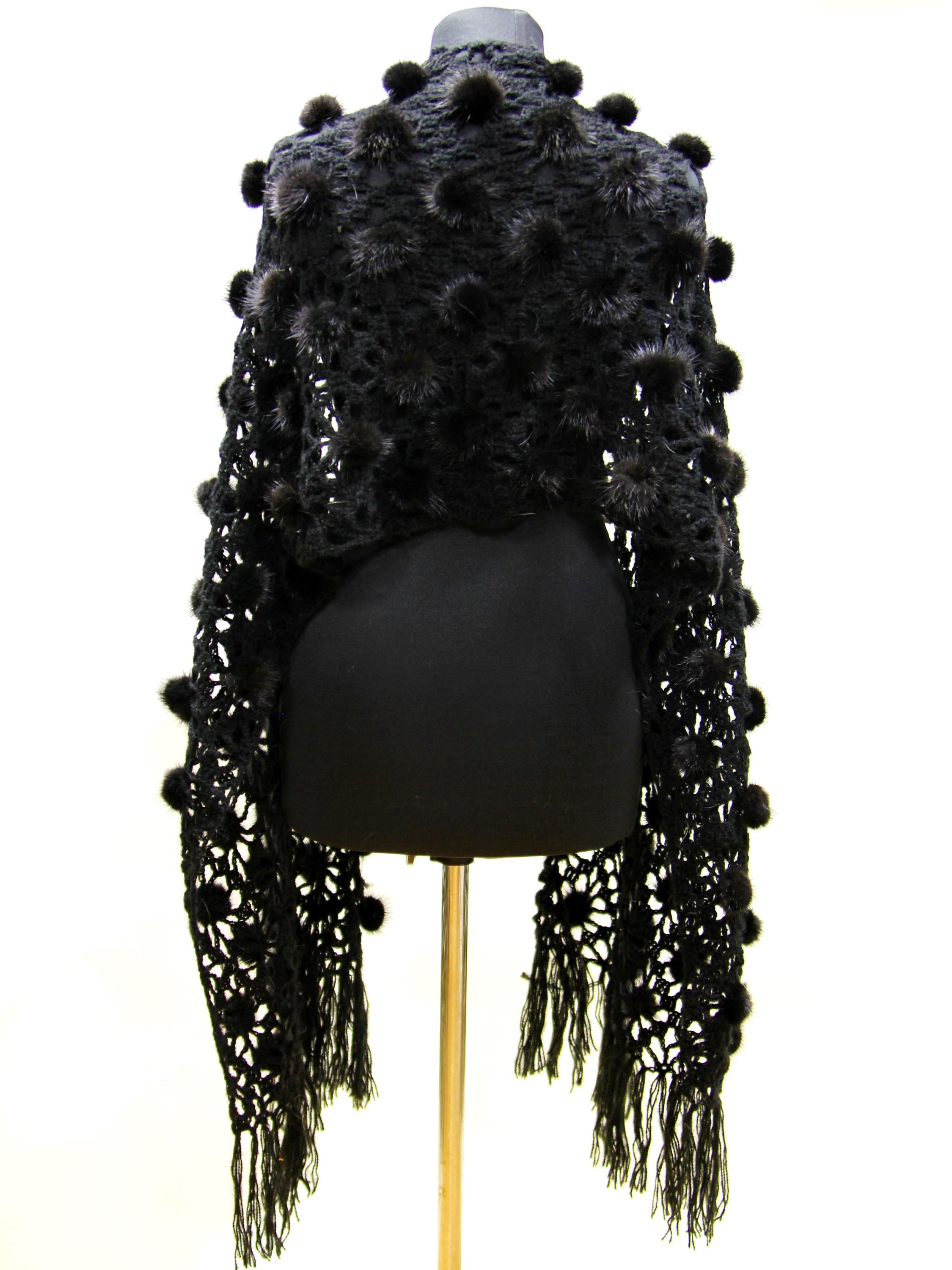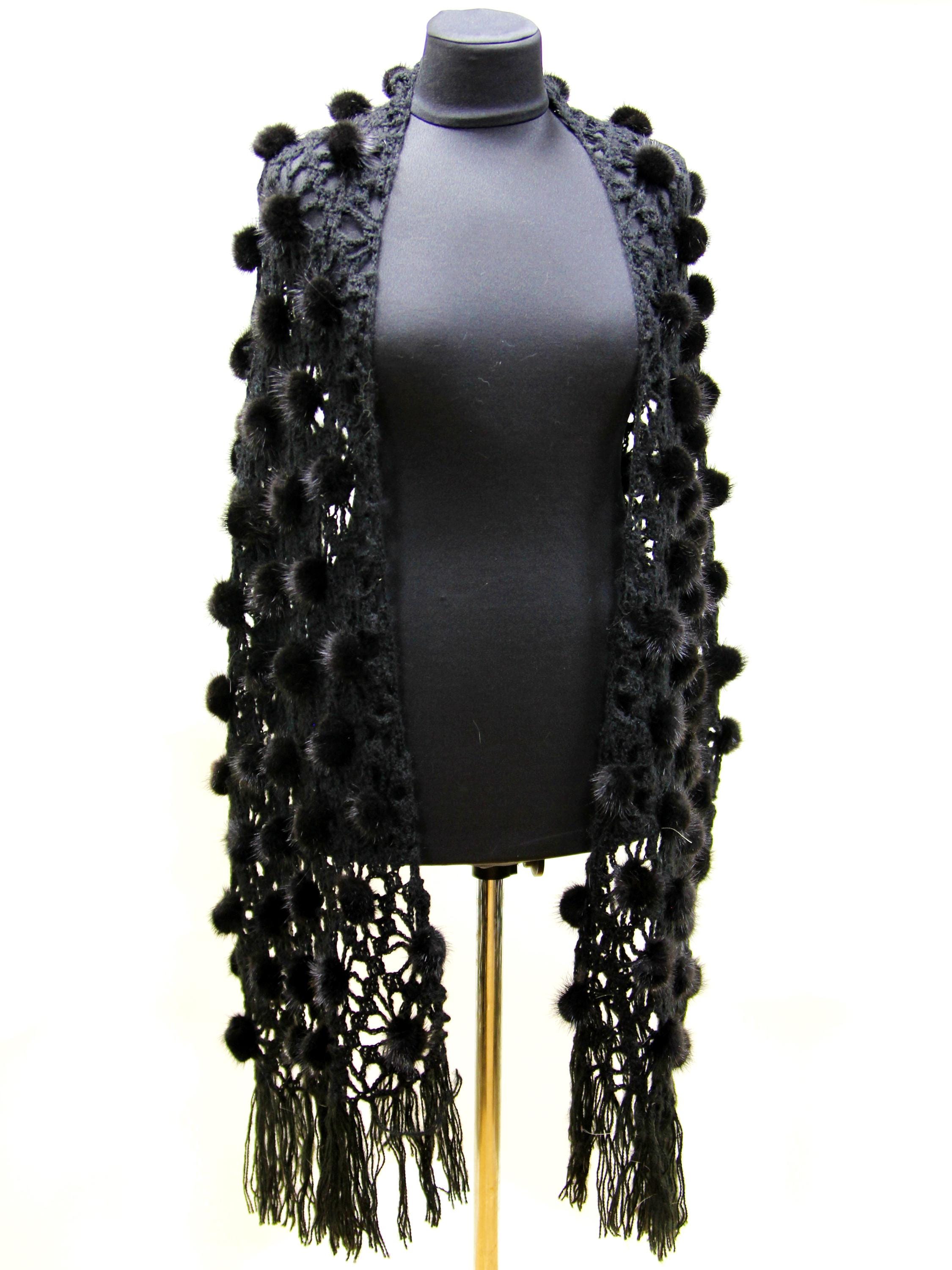 The construction is what sets it apart. A natural wool mesh base — open weave, light, breathable. Onto that base, individual black mink fur pieces and pompons hand-sewn one by one across the surface. This fur shawl moves differently than a solid fur piece. It drapes, it shifts, it catches light. Nothing about it reads heavy or bulky.