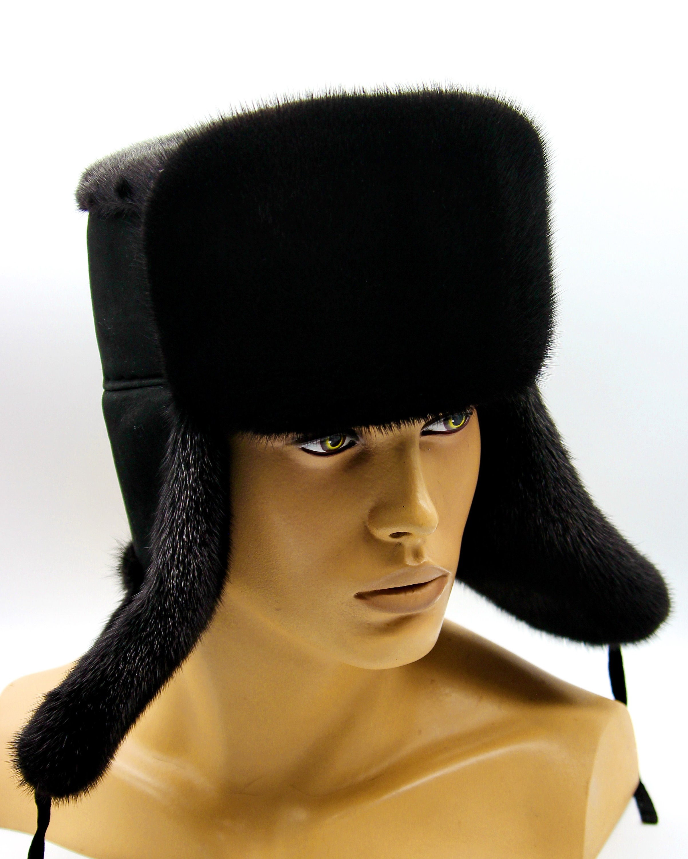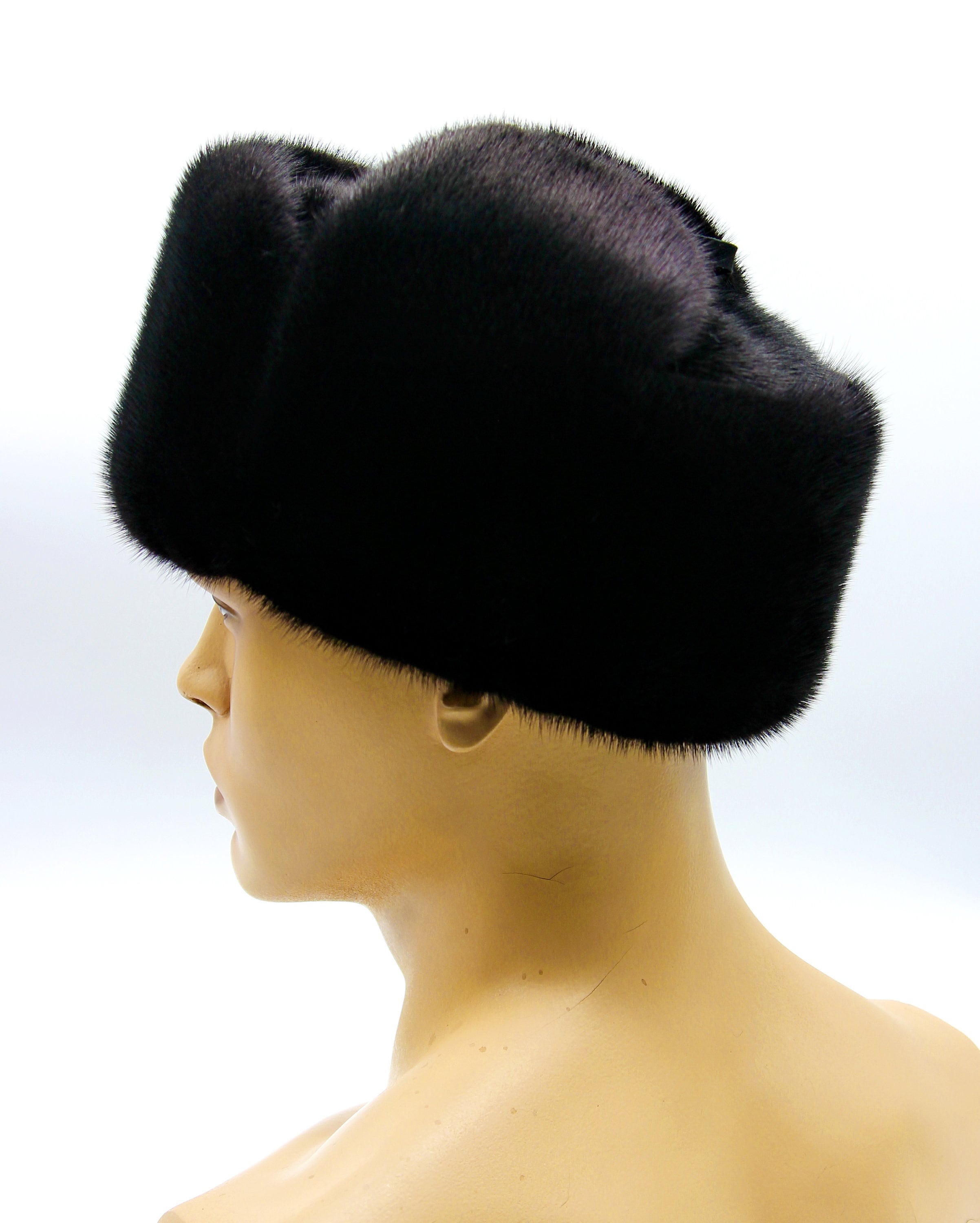 Got requests for professional winter hat that works in office settings. This design uses black mink fur exterior with suede interior sections. When earflaps stay up, looks sophisticated for business. Lower them down, suede provides comfortable protection.
