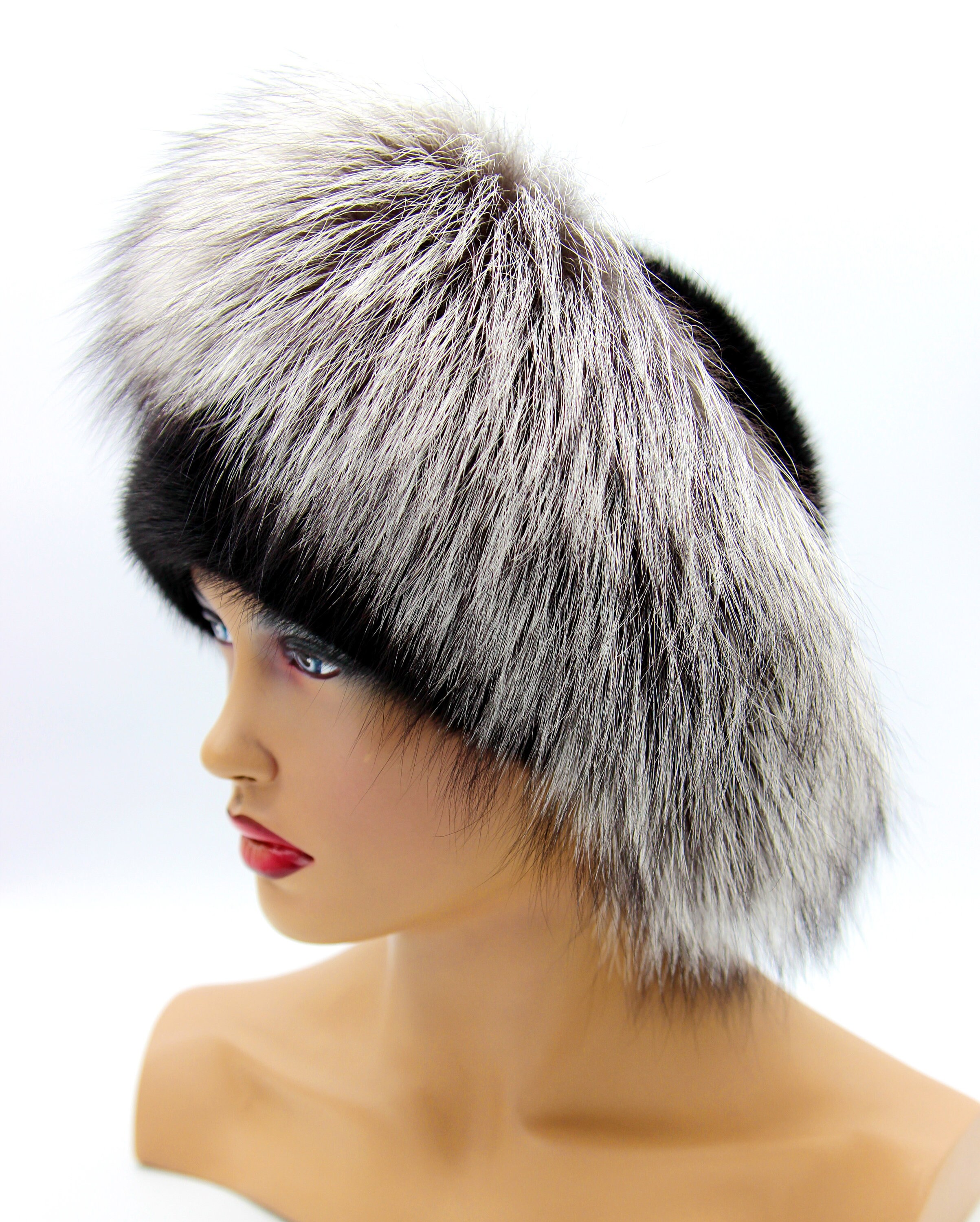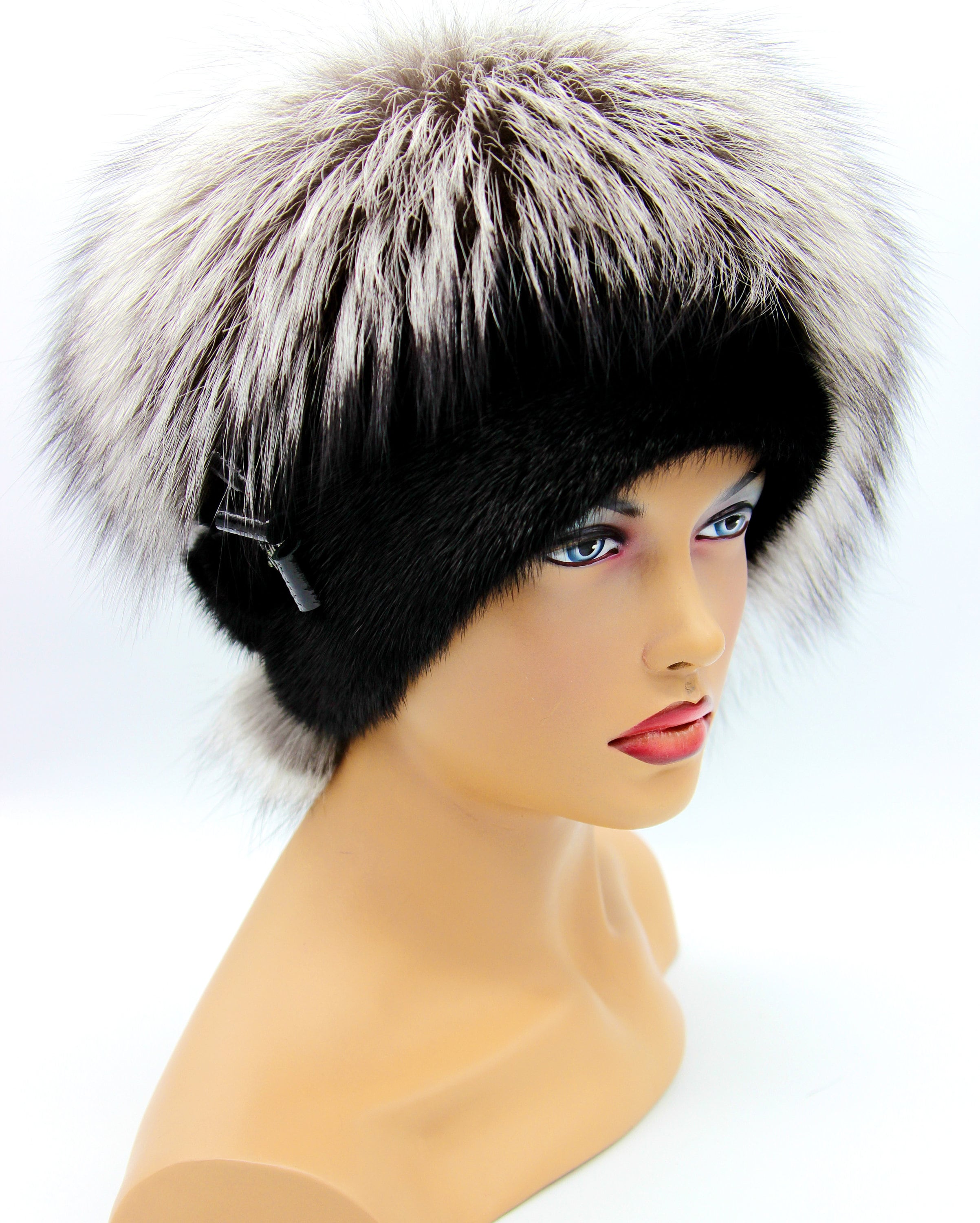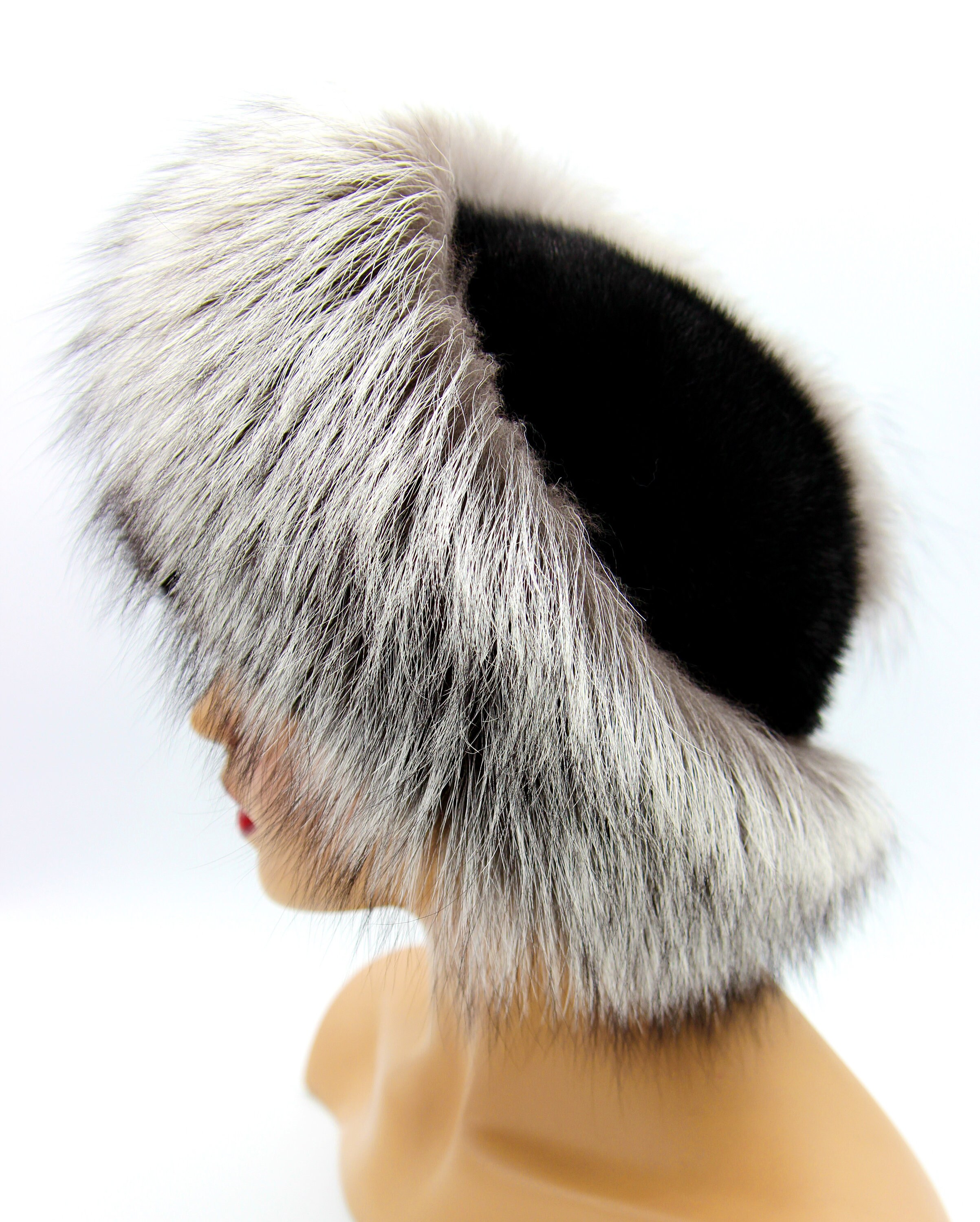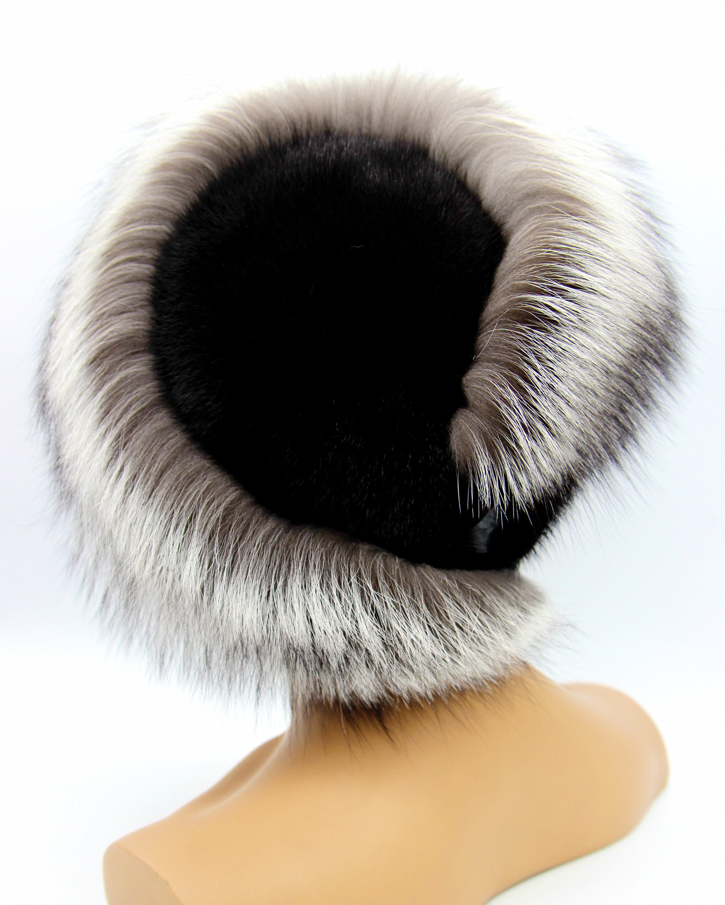 Black Mink Silver Fox Fur Hat Women Winter - Handmade Luxury Warm Headwear Two-Tone Contrast Design