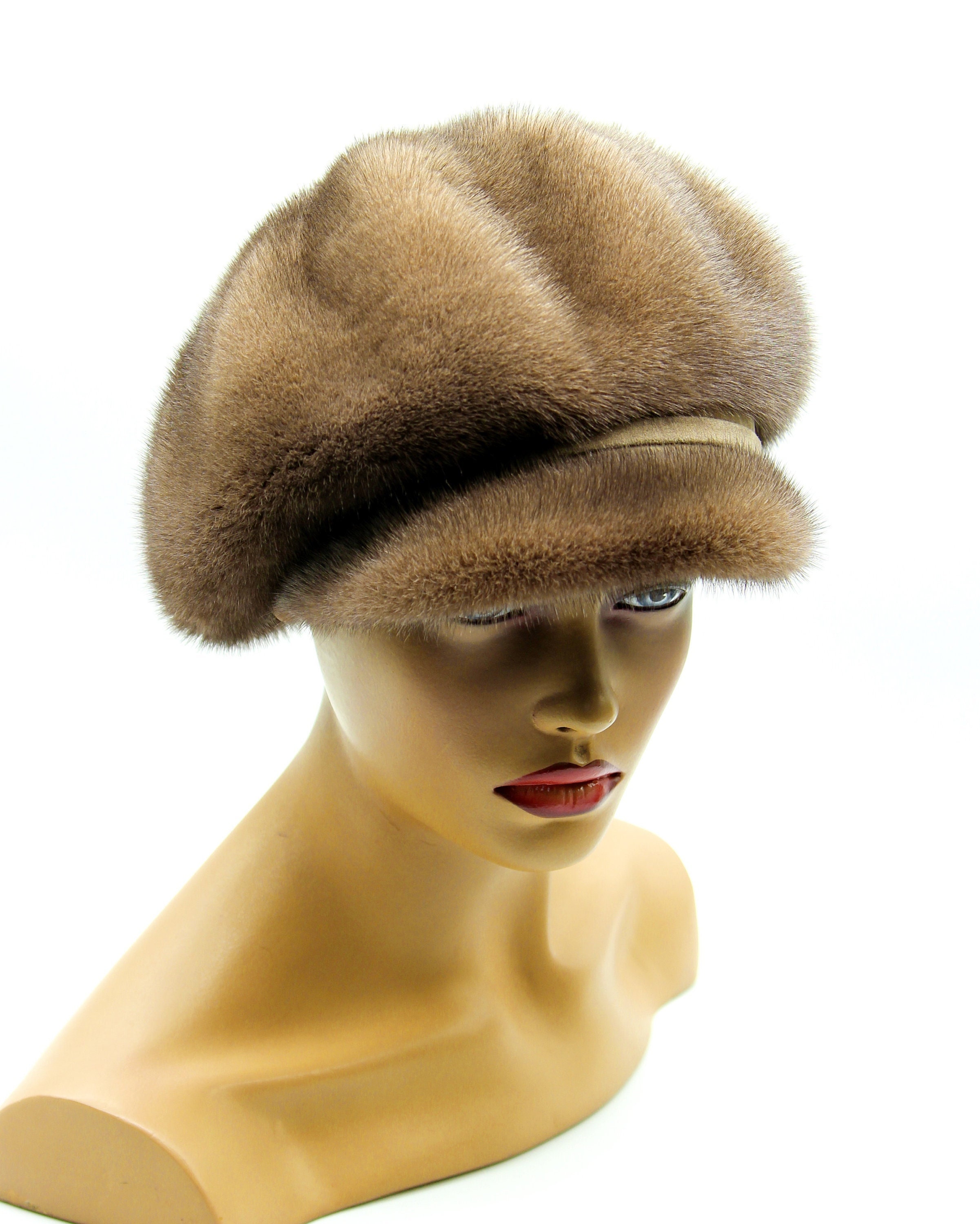 Made in Ukraine by hand using whatever natural pastel tones the mink actually is. Ships protected but understand your cap's specific coloring will vary from photos since every piece is different. Fuller crown than typical newsboys, genuine undyed mink in soft natural tones, authentic fur that's individual not identical.